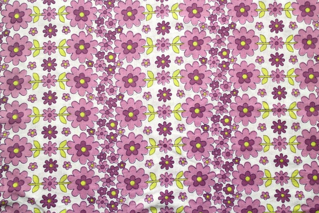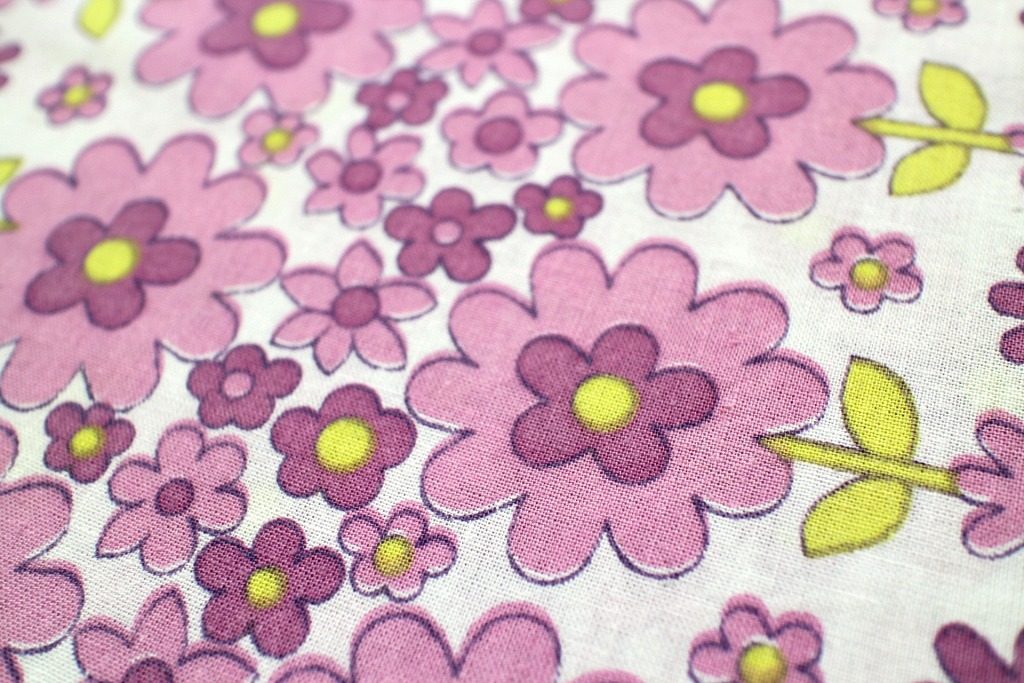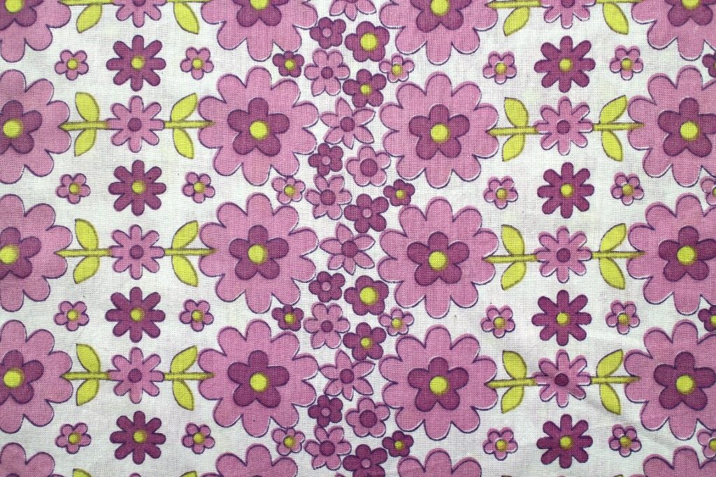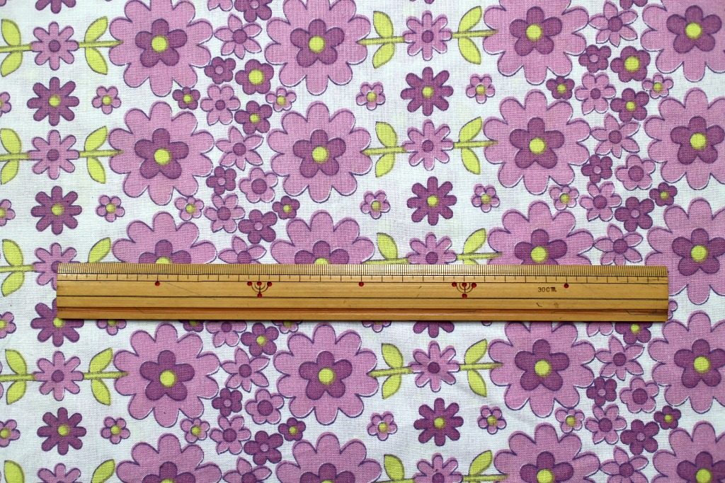 濃淡のパープルの花モチーフがコミカルなタッチでデザインされた人気のレトロ柄ヴィンテージファブリック。