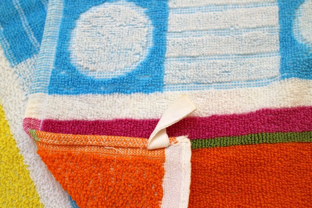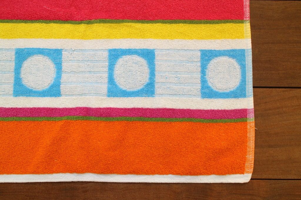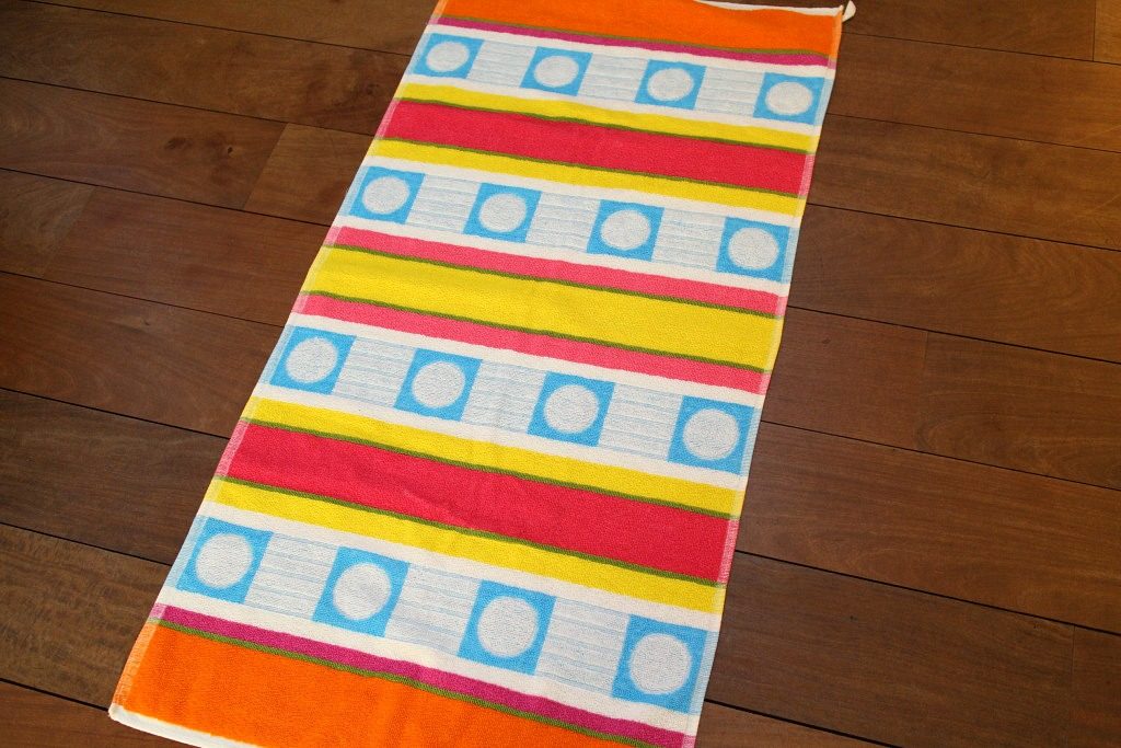 イエロー・オレンジのしましまに四角と丸を並べた、レトロ感いっぱいの可愛いタオルを蚤の市で見つけました。