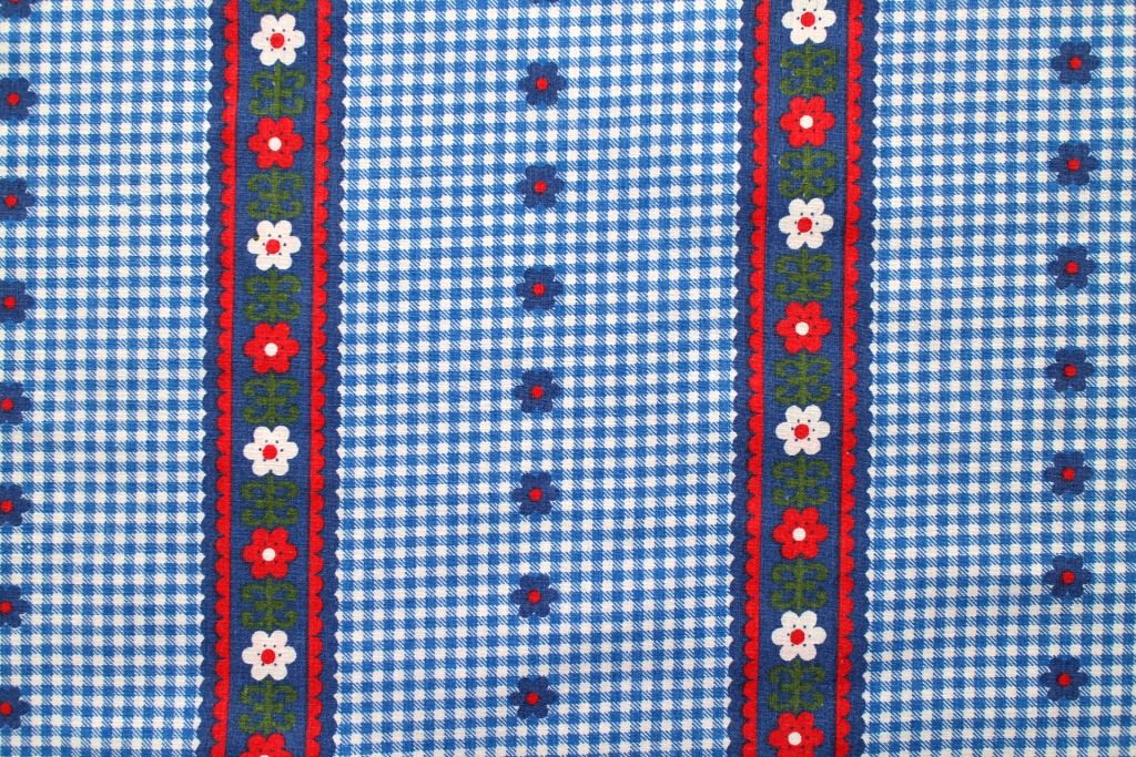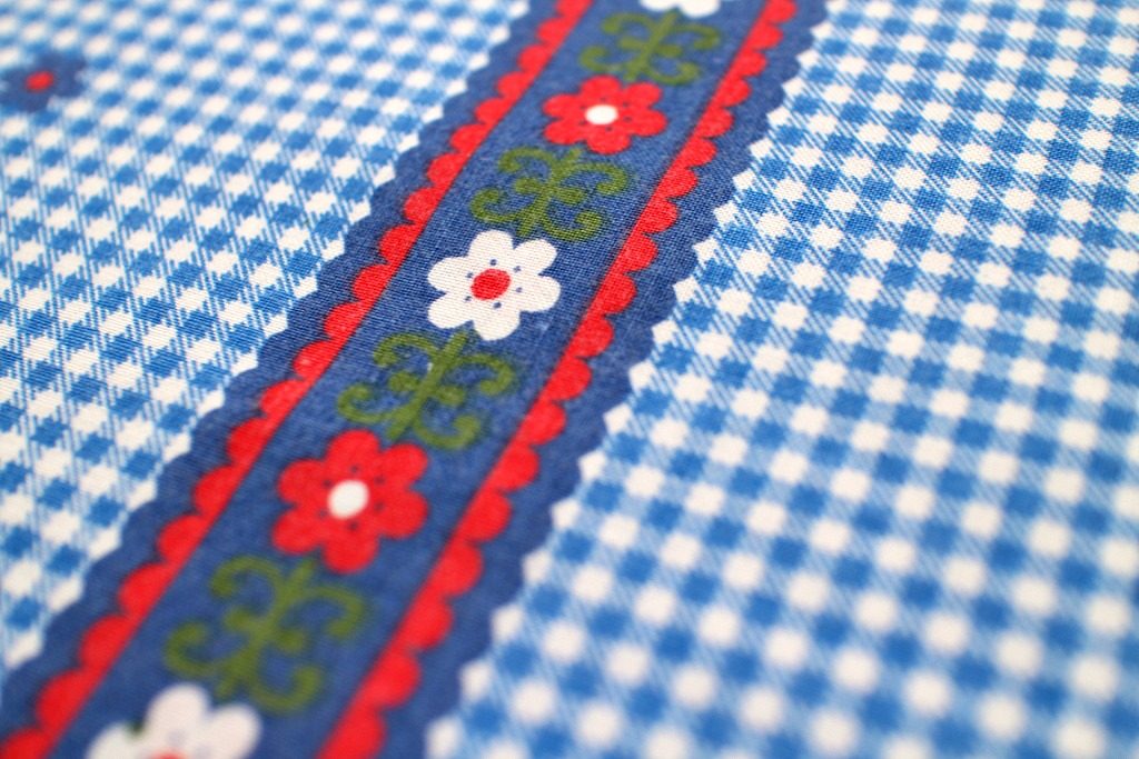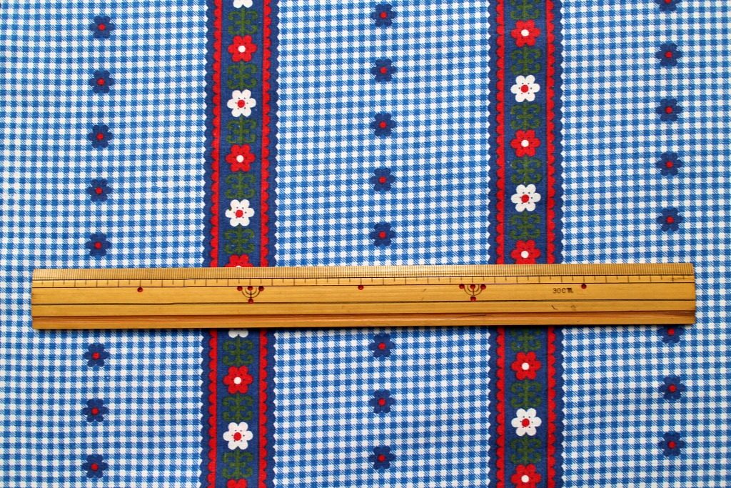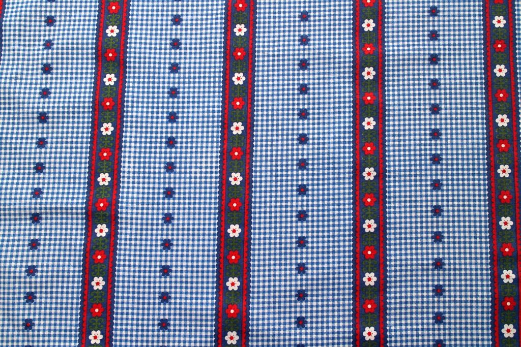 コンテンツにスキップ細かいブルーのギンガムチェック地に赤がアクセントとなったチロルテープと可愛らしい青い小花が交互にプリントされた、フォークロアな雰囲気いっぱいのヴィンテージファブリック。
