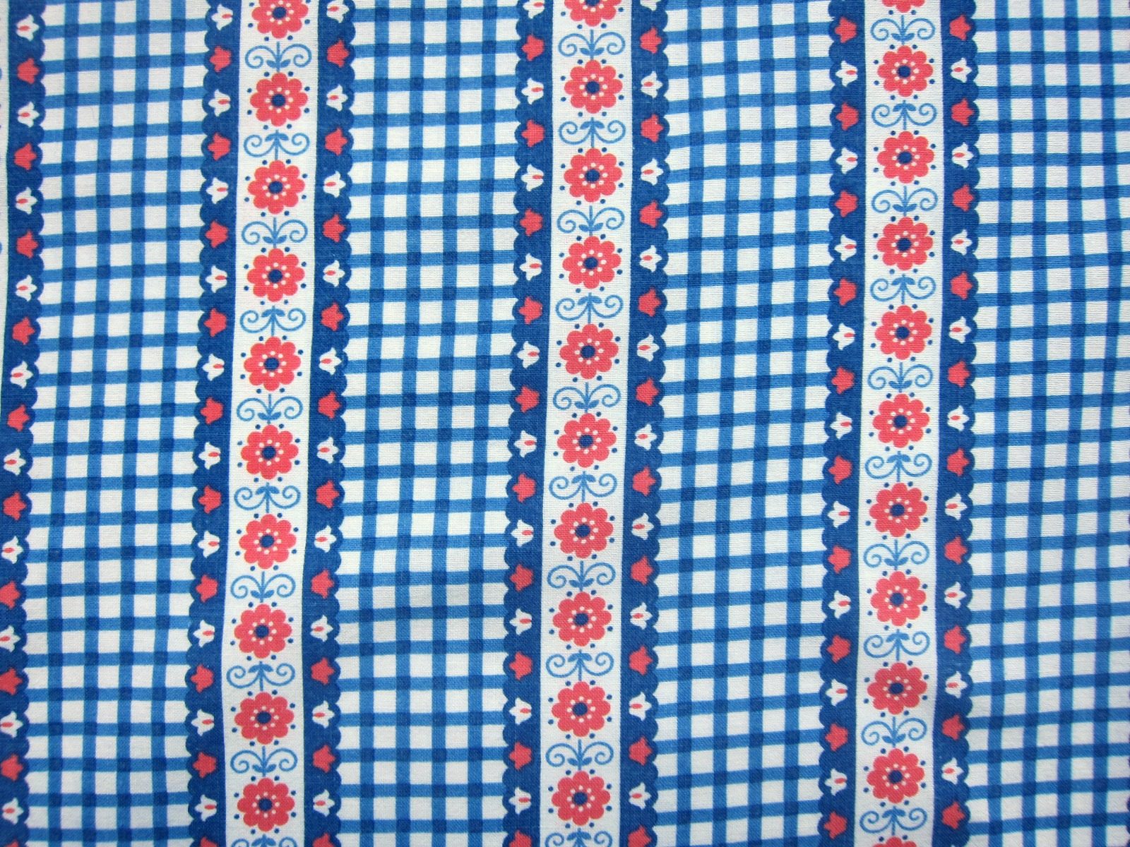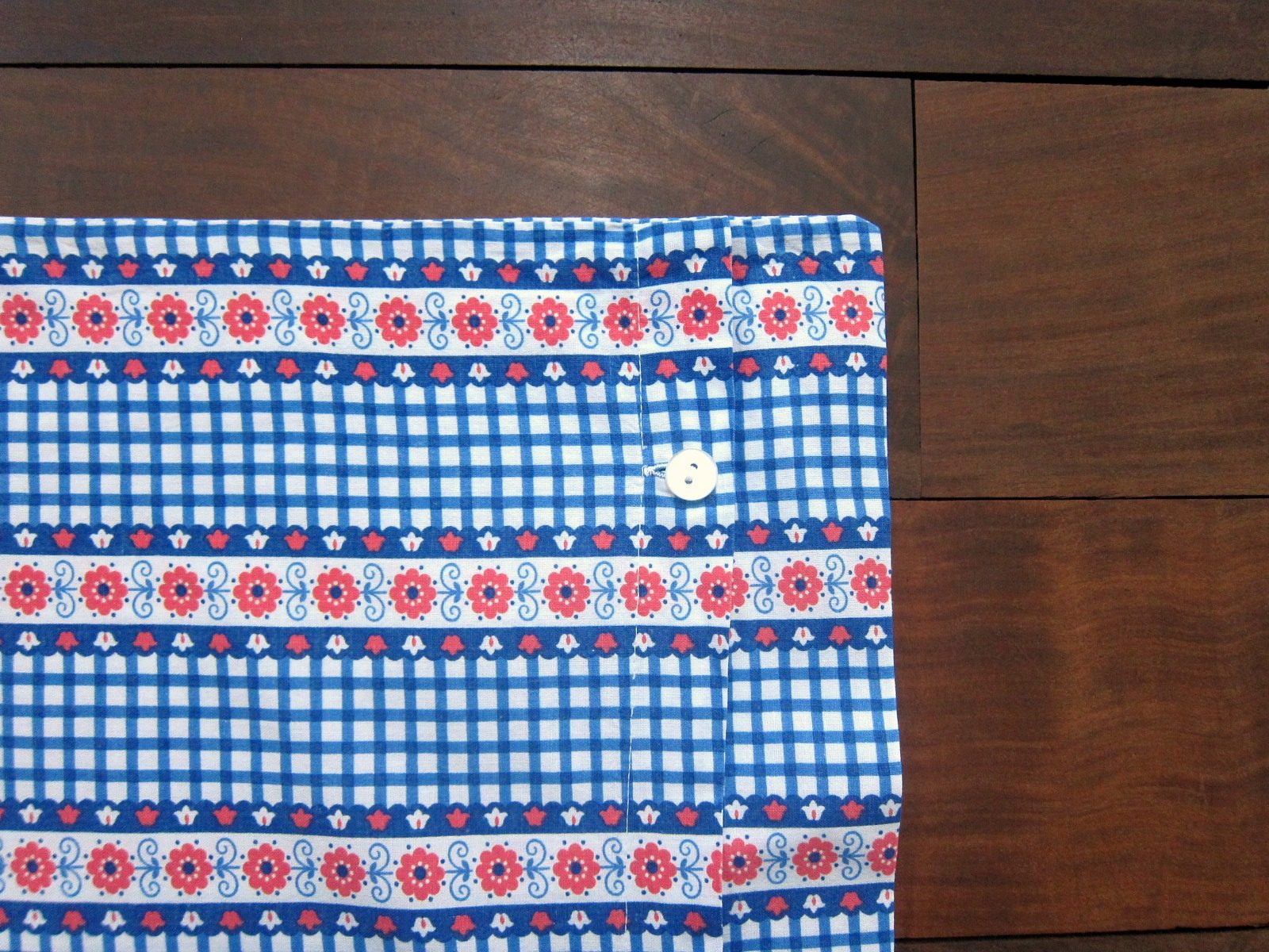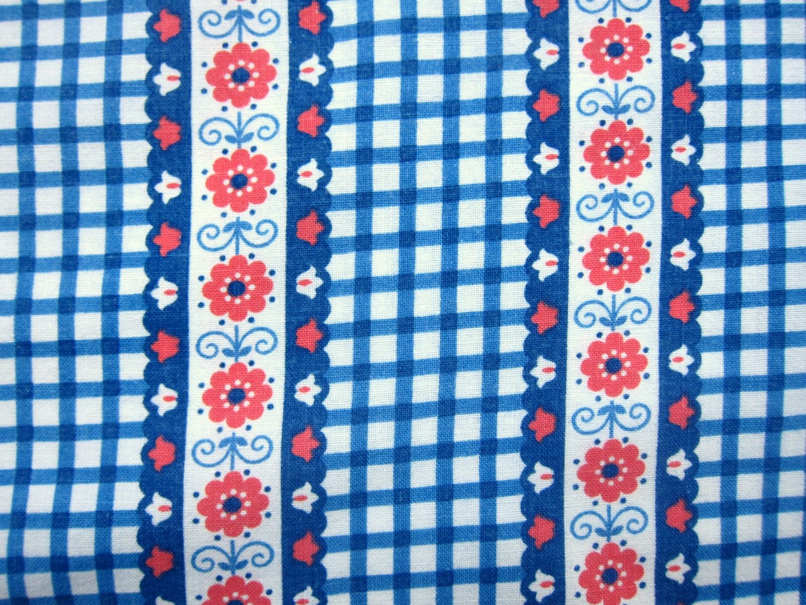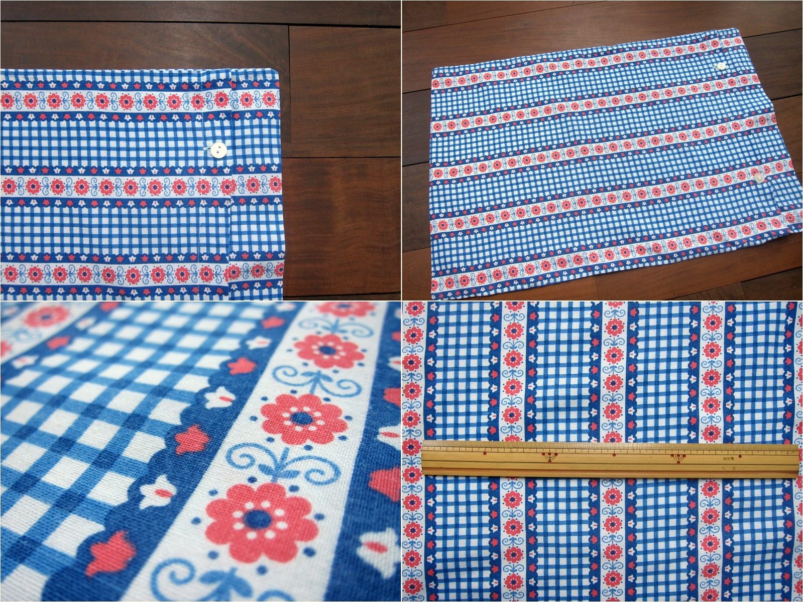 青いチェック柄と、チロリアンテープのようなラインに赤い花のモチーフのビンテージピローケース。