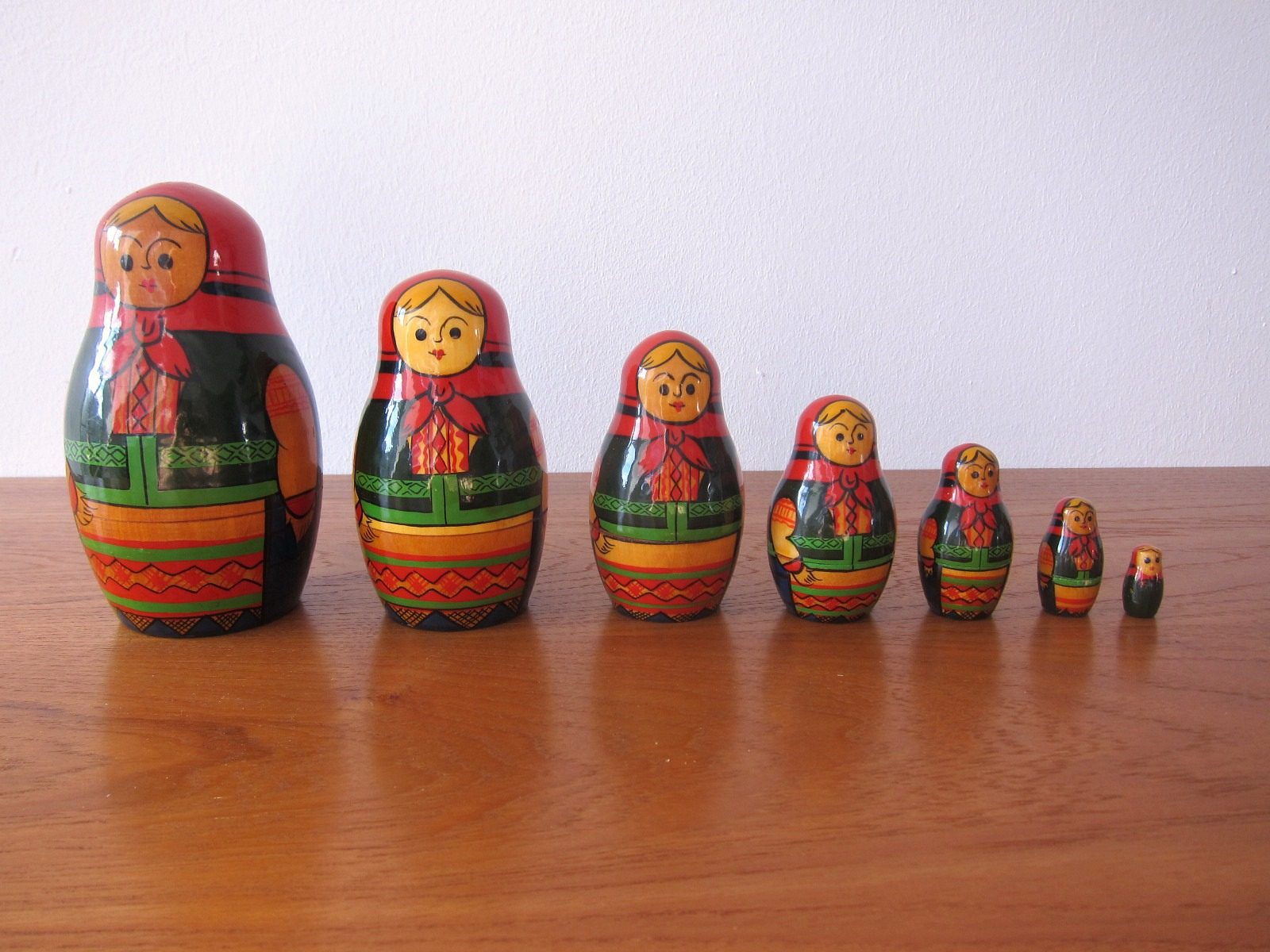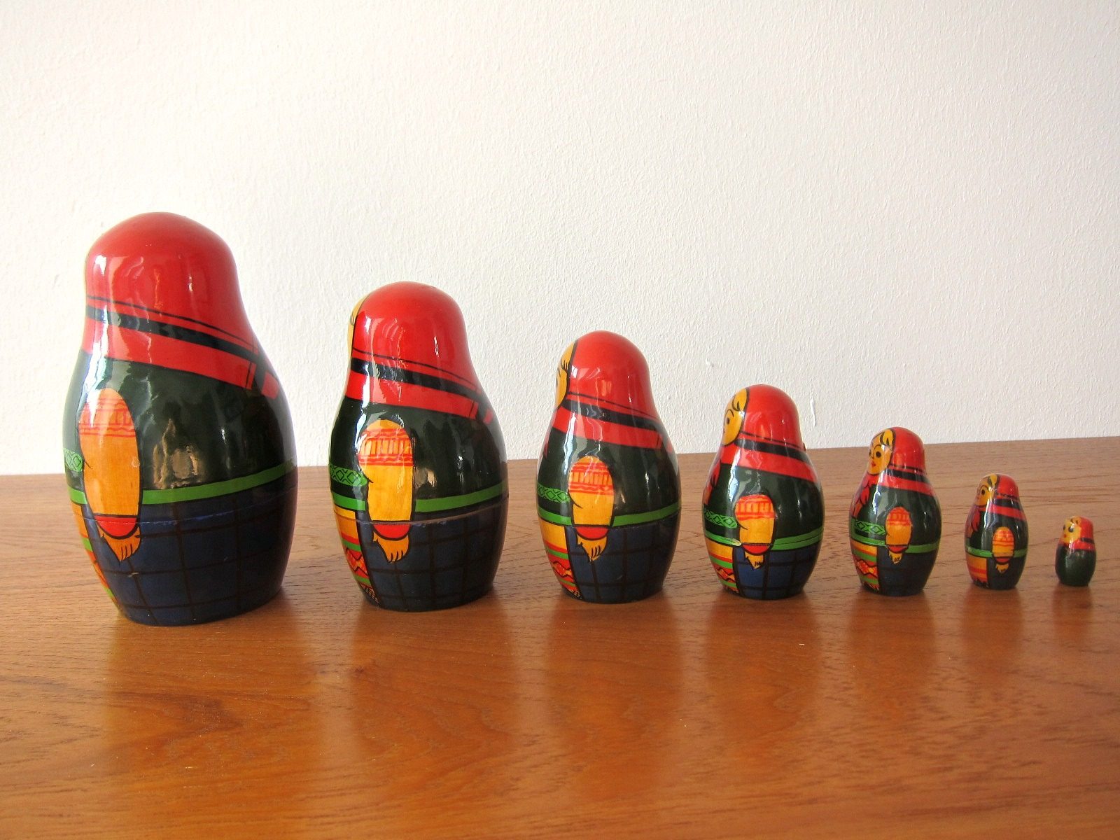 深い赤と緑の民族衣装を着たロシアのマトリョーシカ人形。 7体入っており、つやつや、ぷっくりしています。