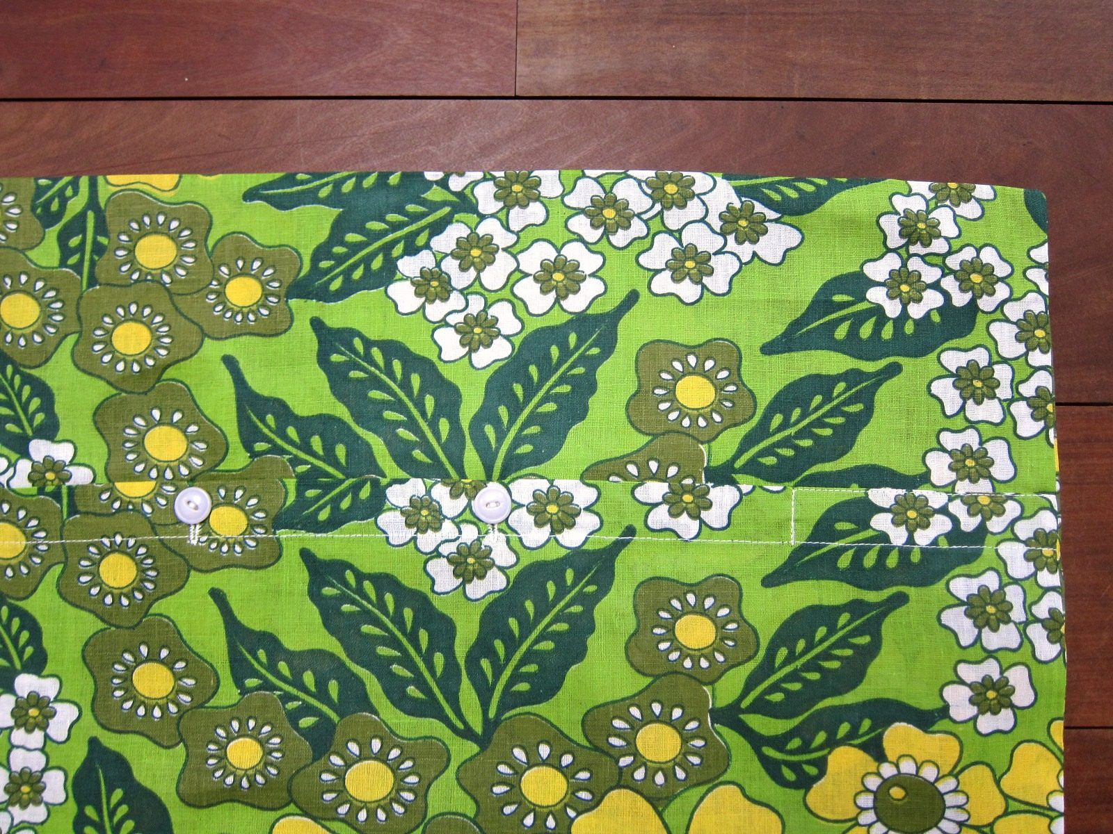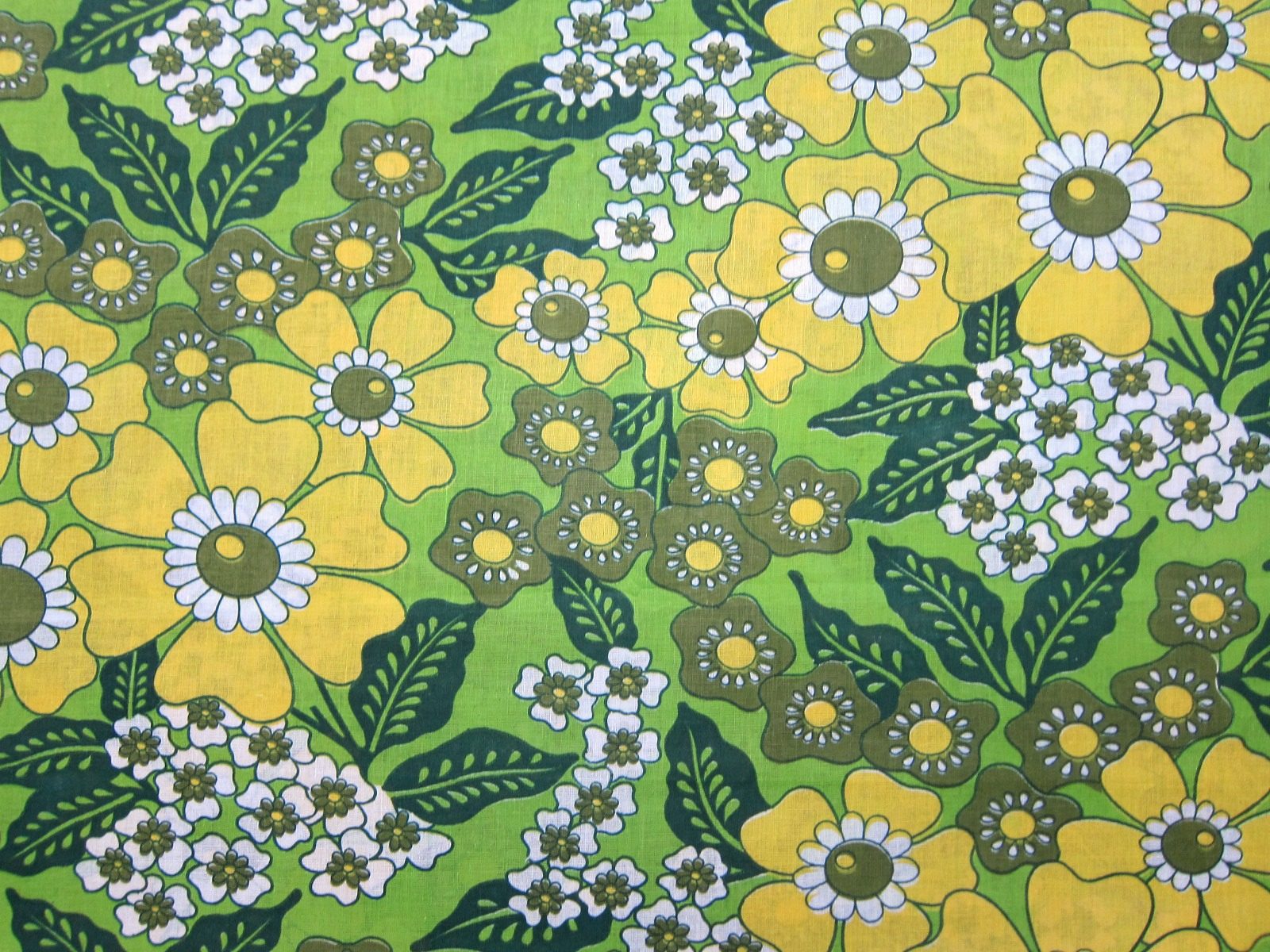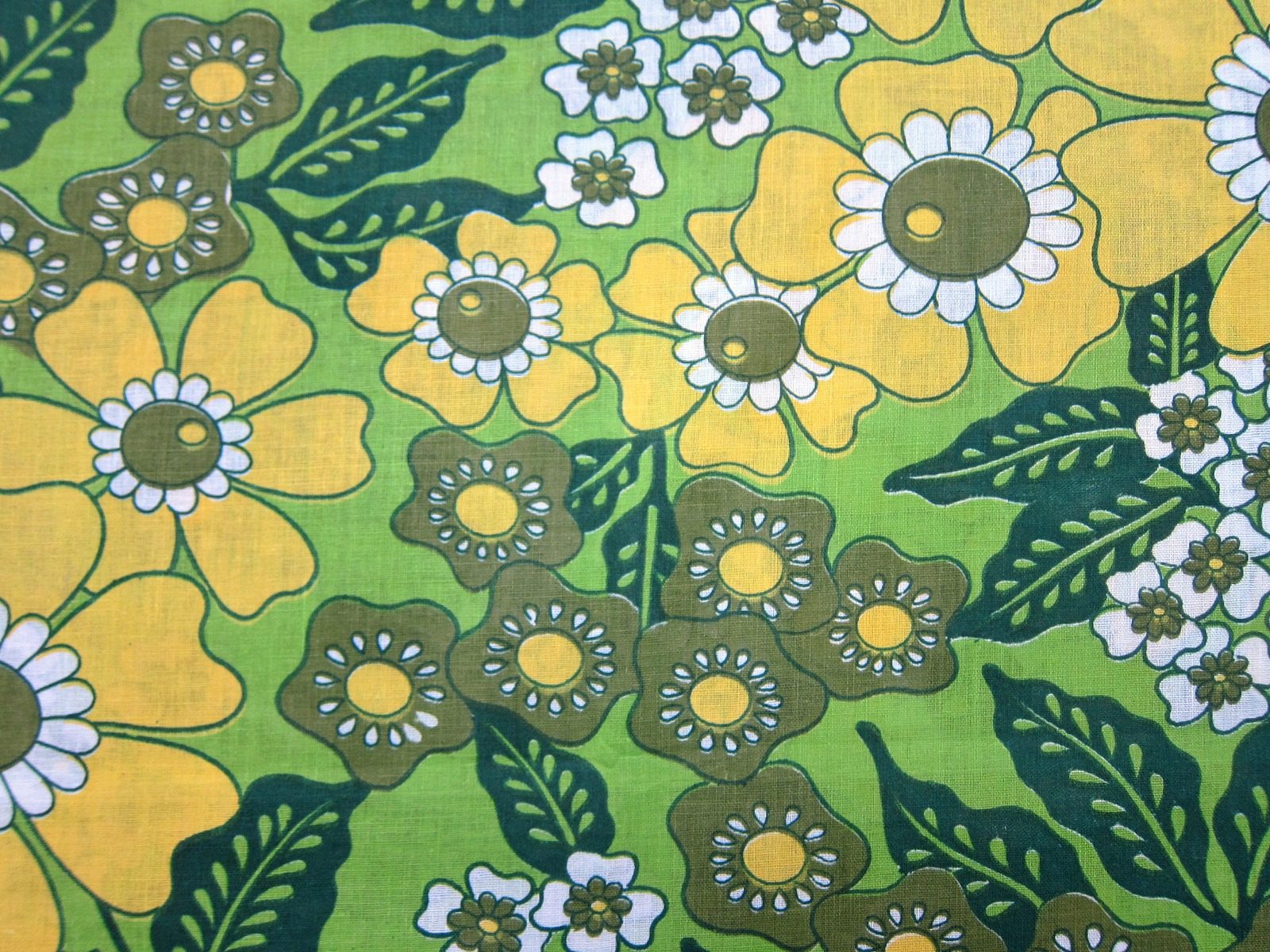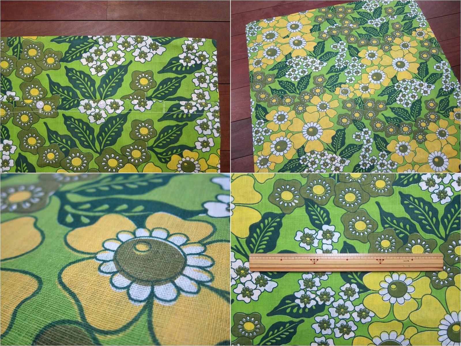 緑色の70年代ビンテージピローケース。 黄色や白のレトロなお花のモチーフと、グリーンのバックのカラーが生き生きとした雰囲気をしています。