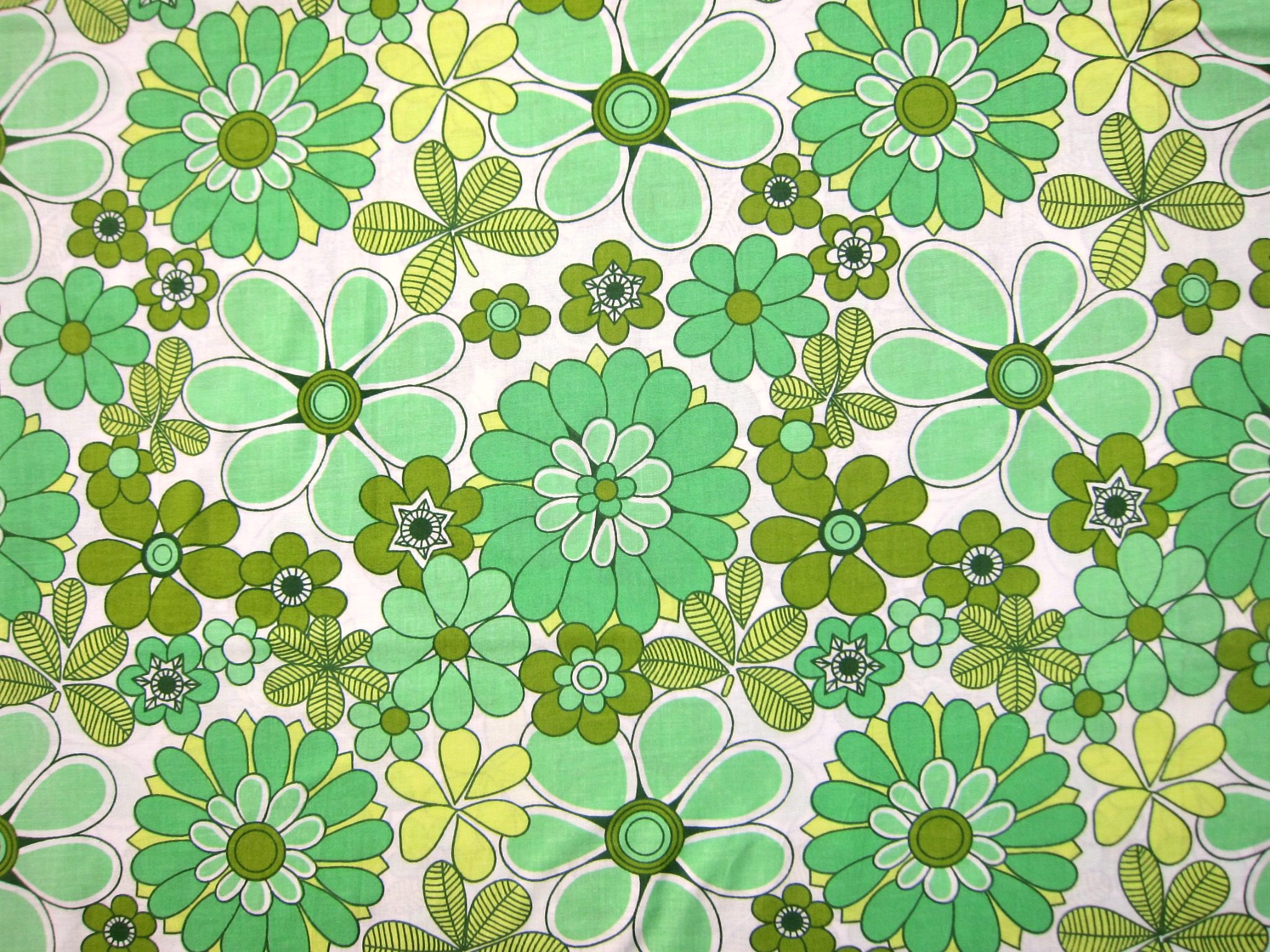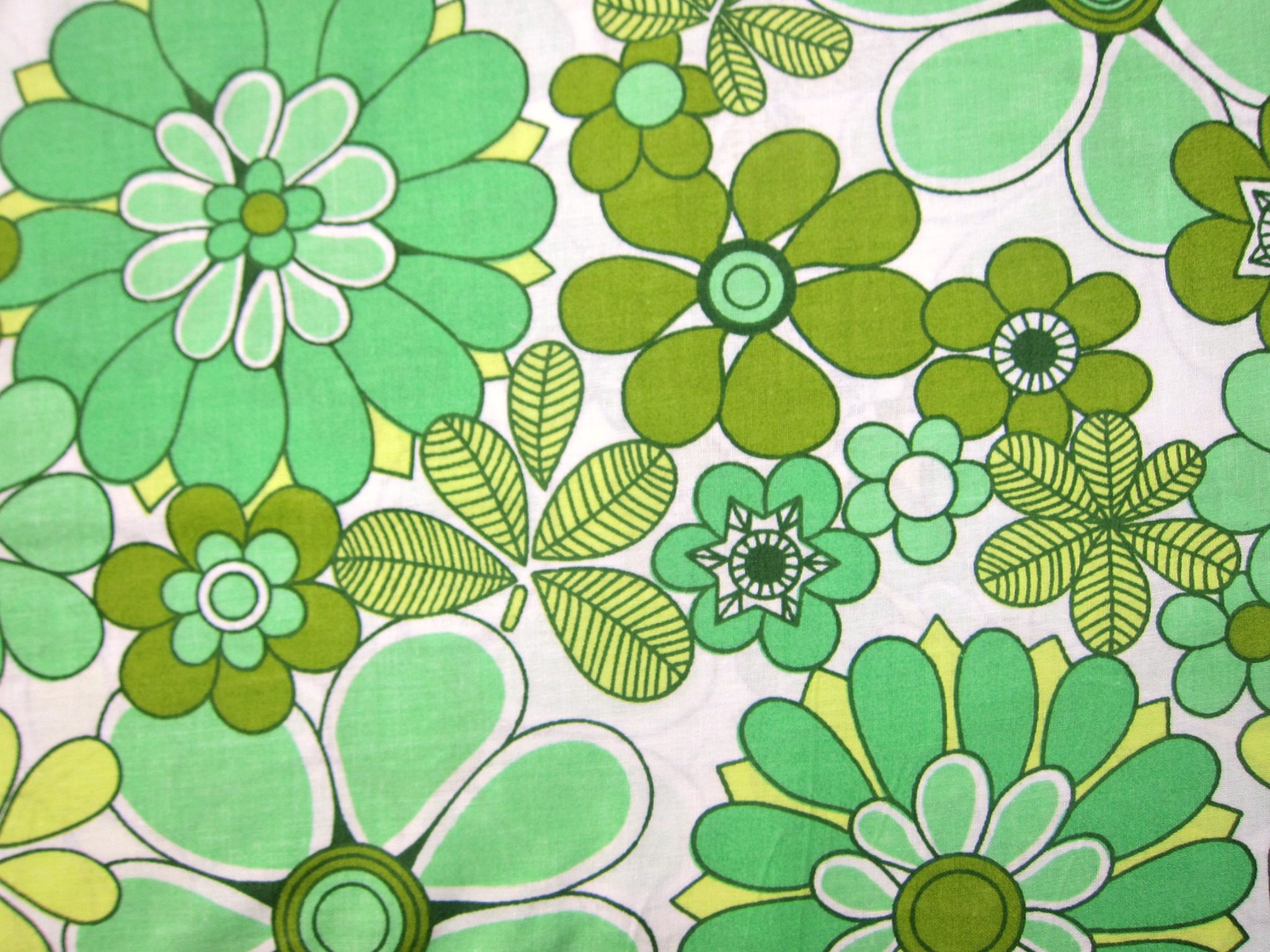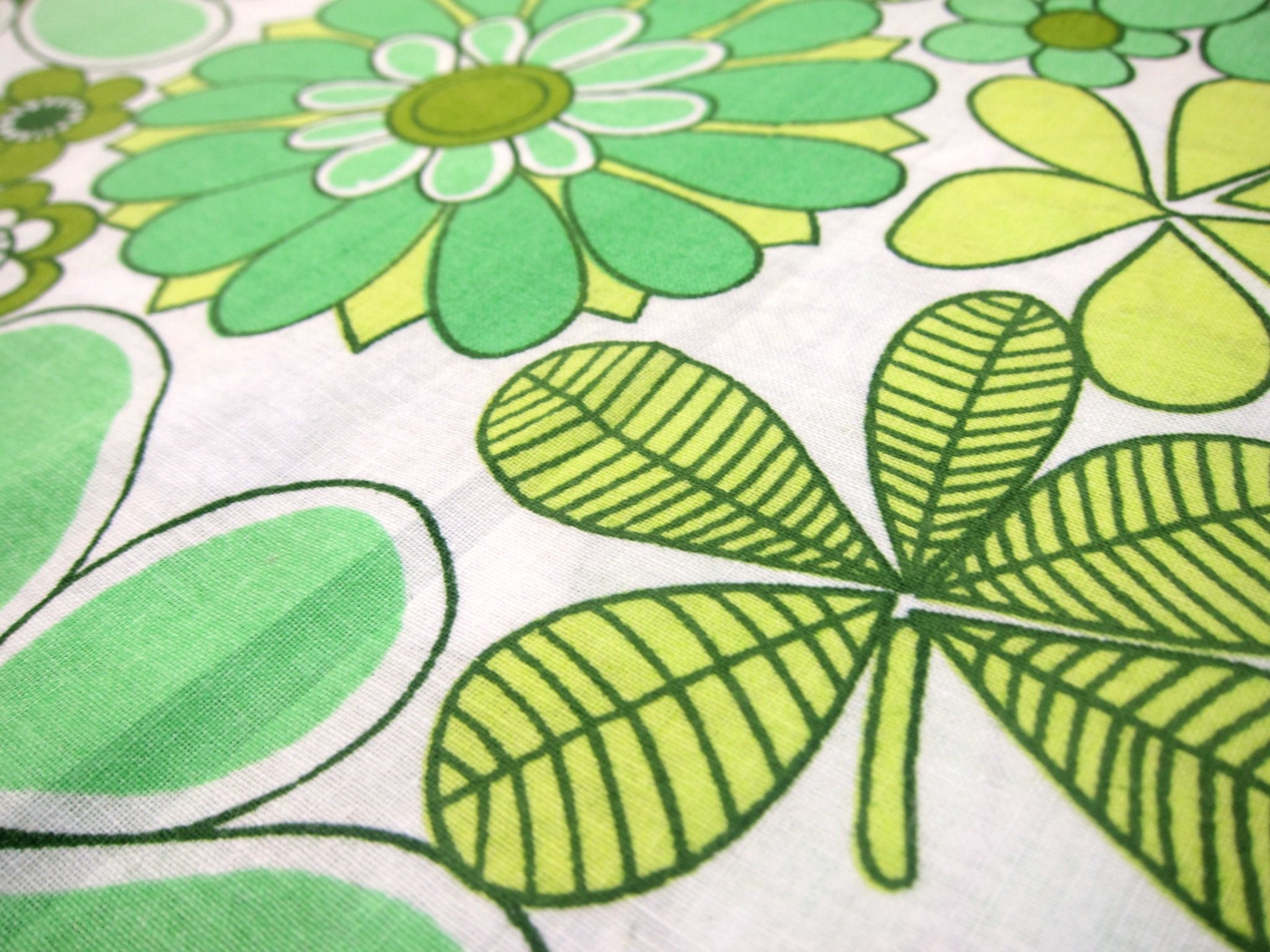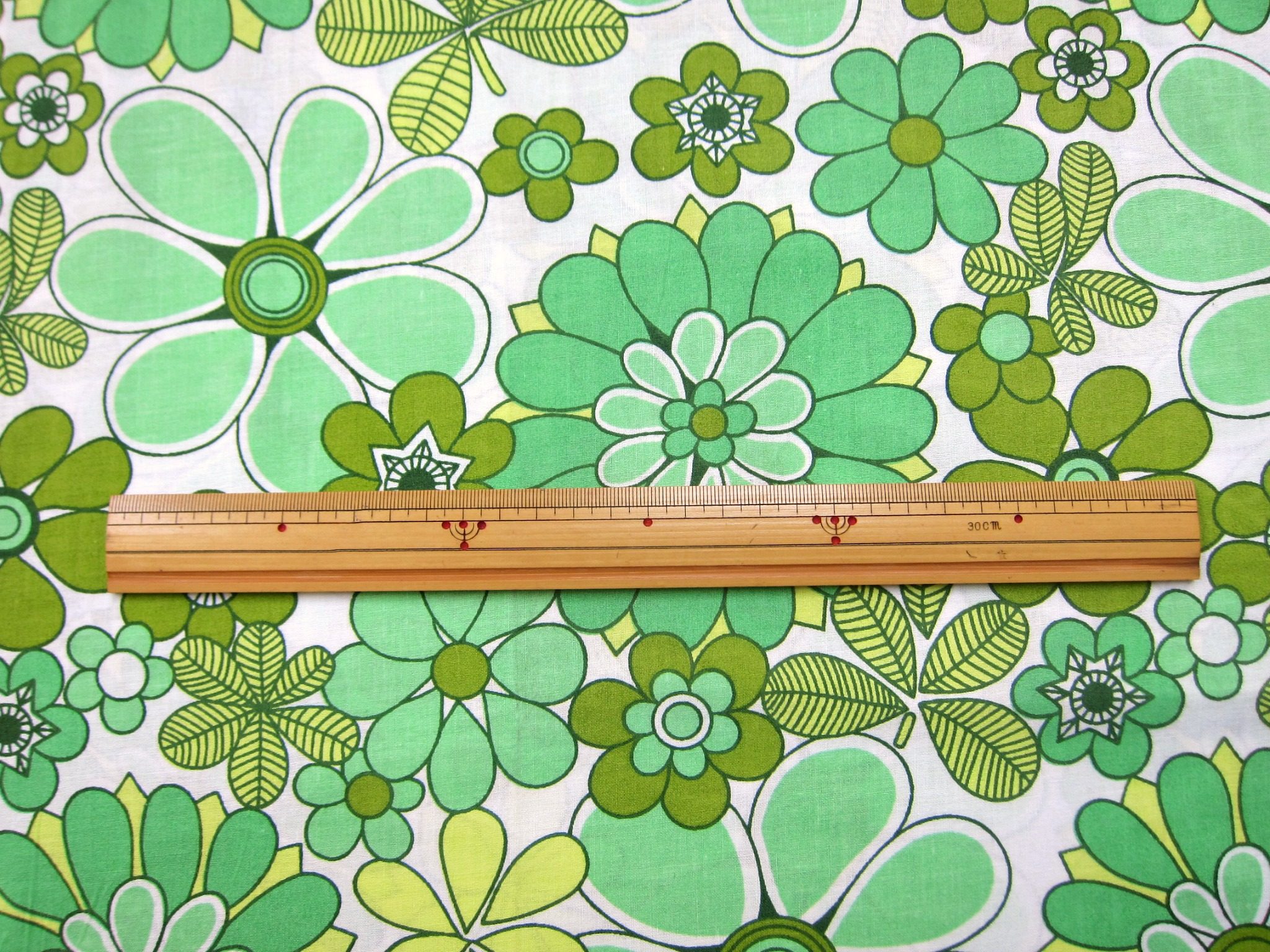 新品未使用のデッドストック、70年代のレトロな花柄ファブリックです。 色はグリーン色で、色々なお花のパターンが描かれており楽しい雰囲気です。