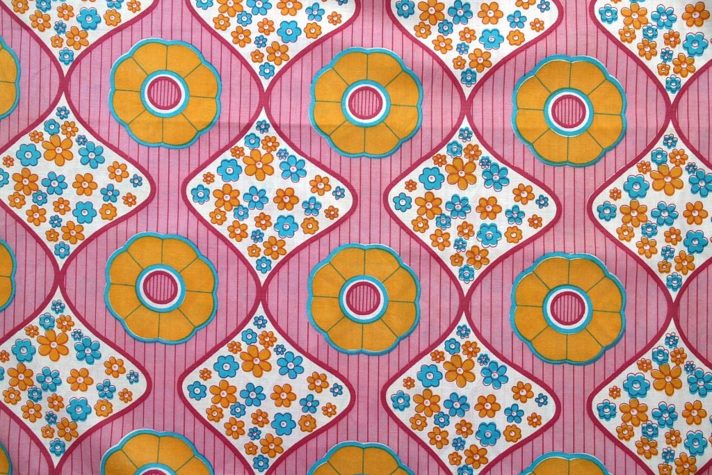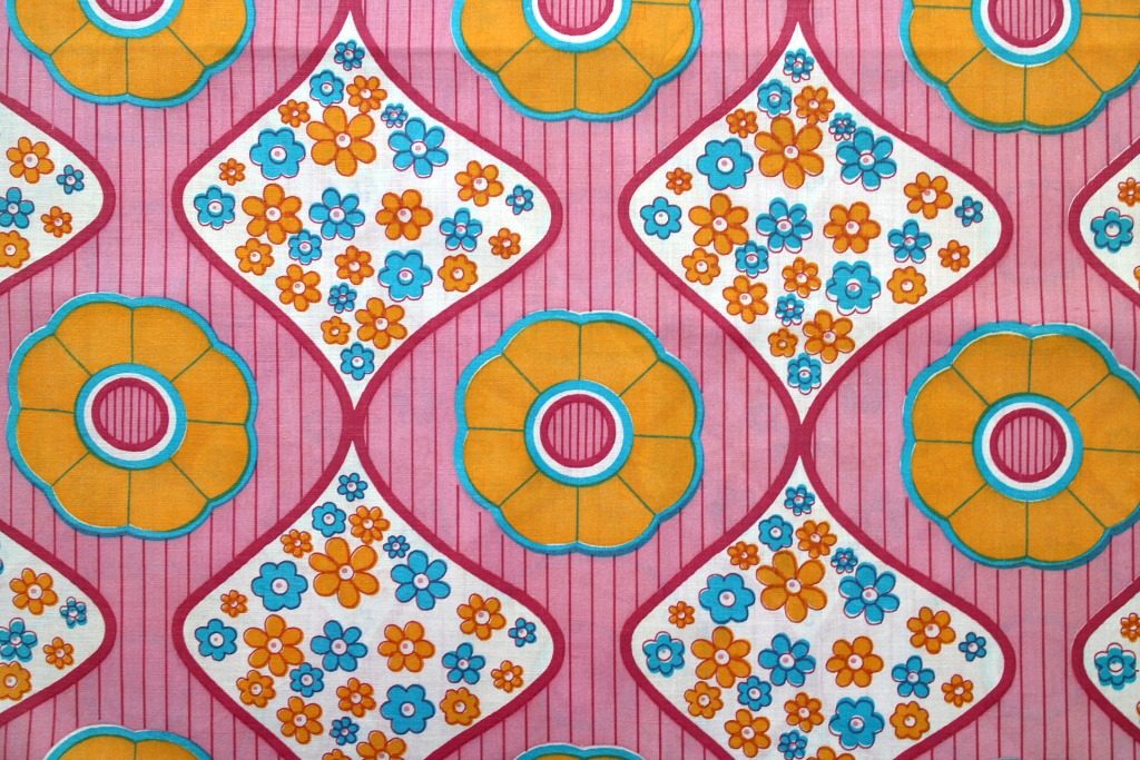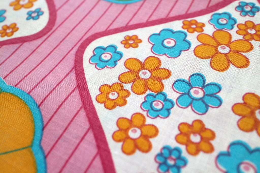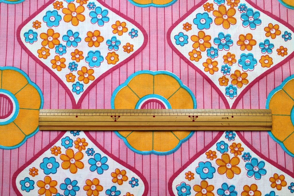 ピンクのピンストライプ地とオレンジ&ブルーの優しい小花模様が波打つようにデザインされたポップなヴィンテージファブリック。