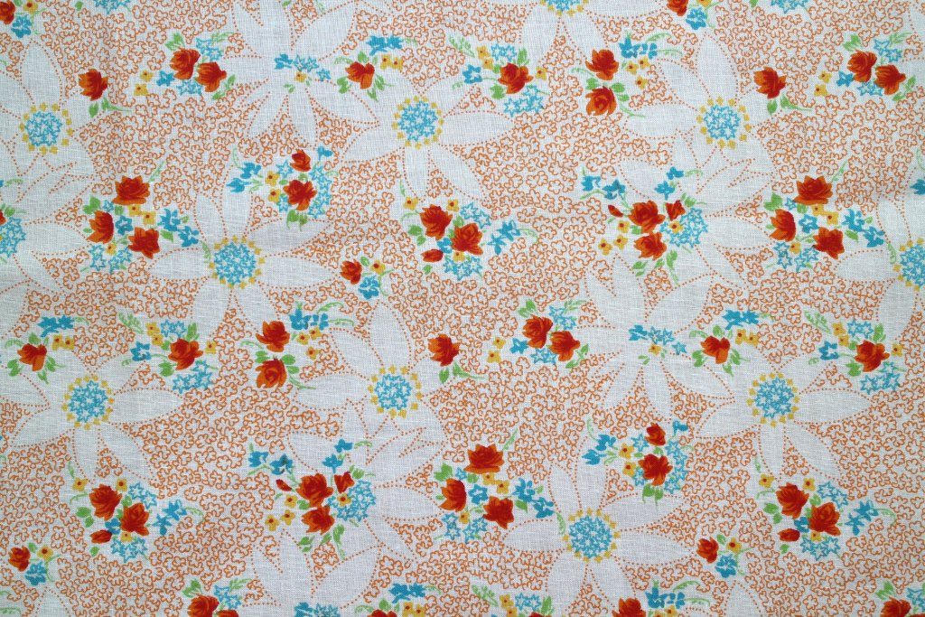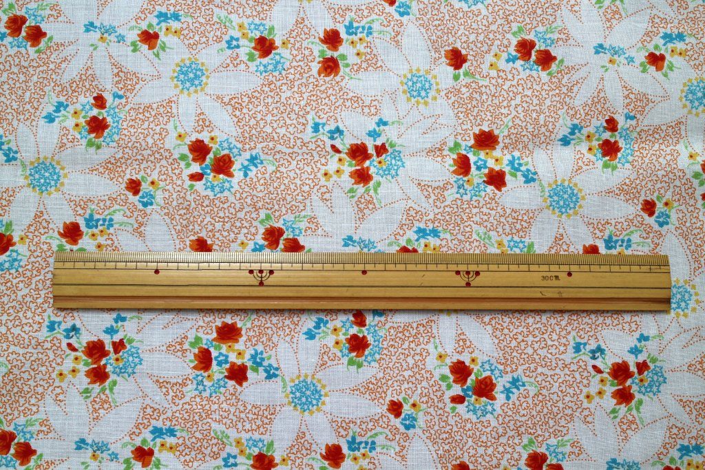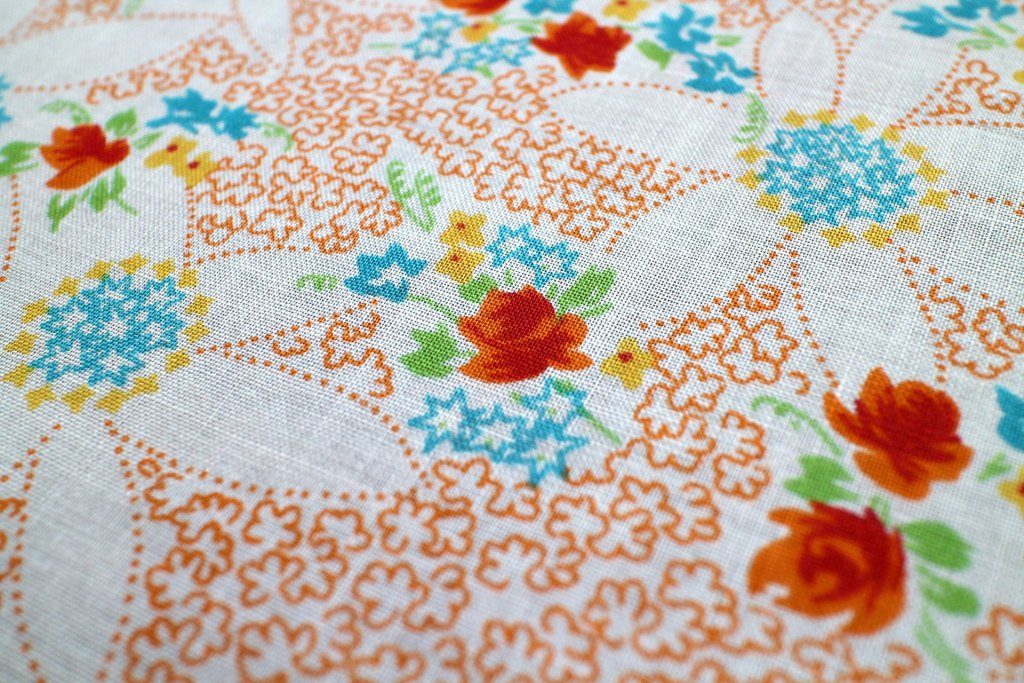 まるでオレンジの糸で縫いとった刺し子のような花模様にバラをあしらった、とても個性的なデザインのヴィンテージファブリック。