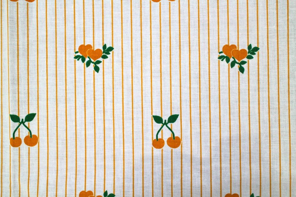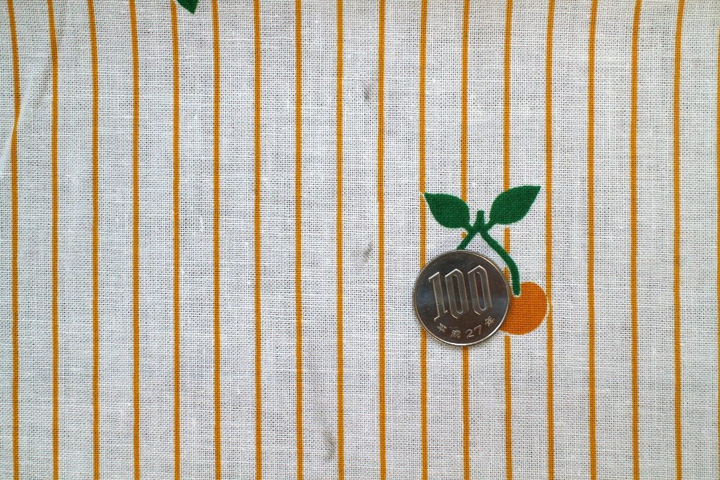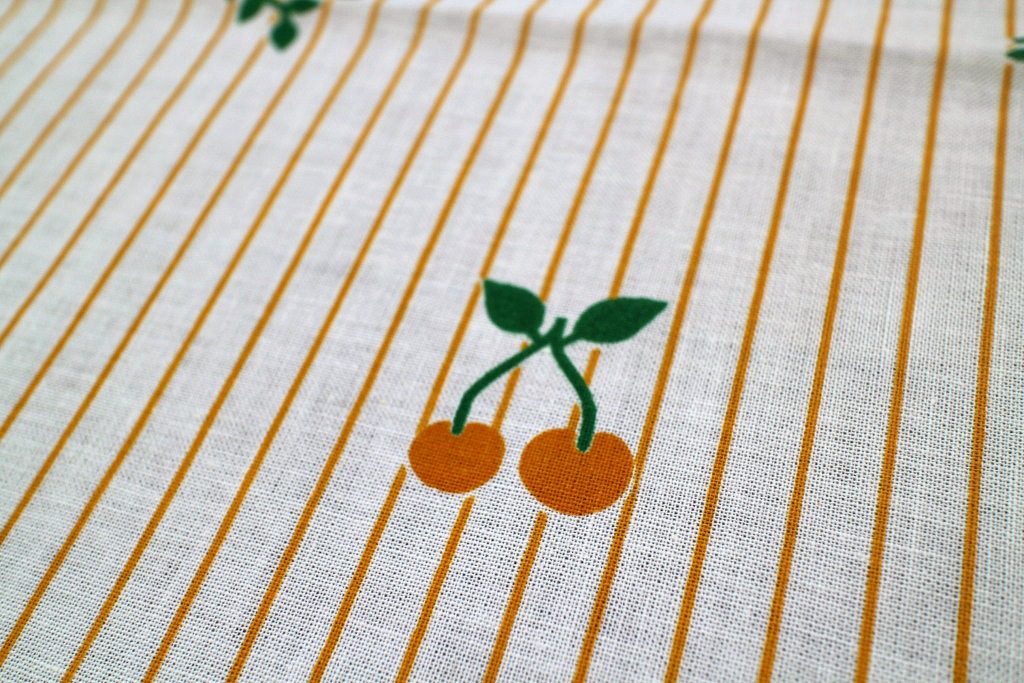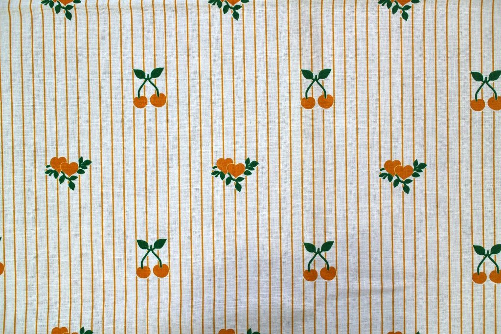 黄色の細かなストライプにさくらんぼが乗った自慢のレトロ柄ビンテージ新品ファブリック。