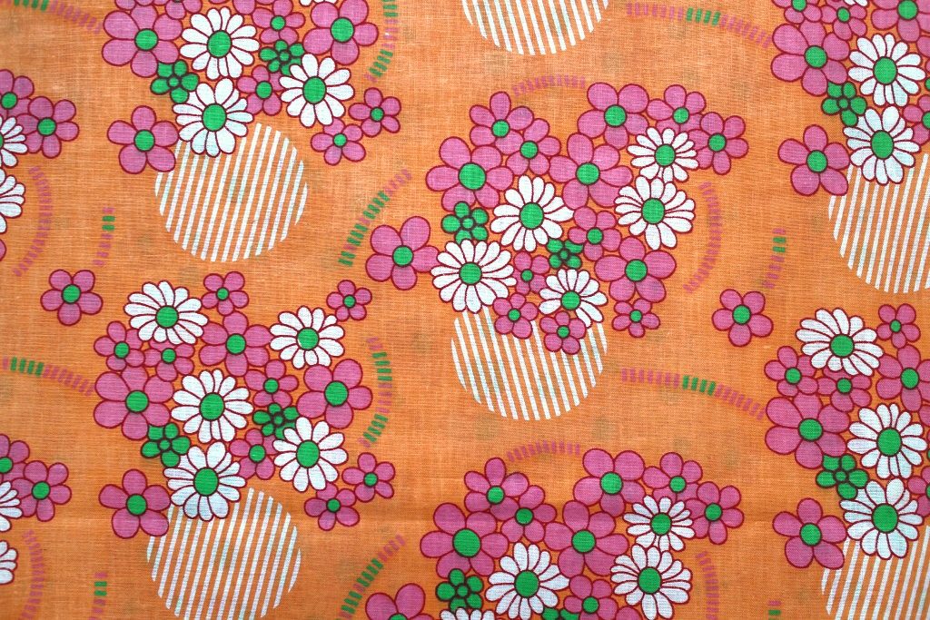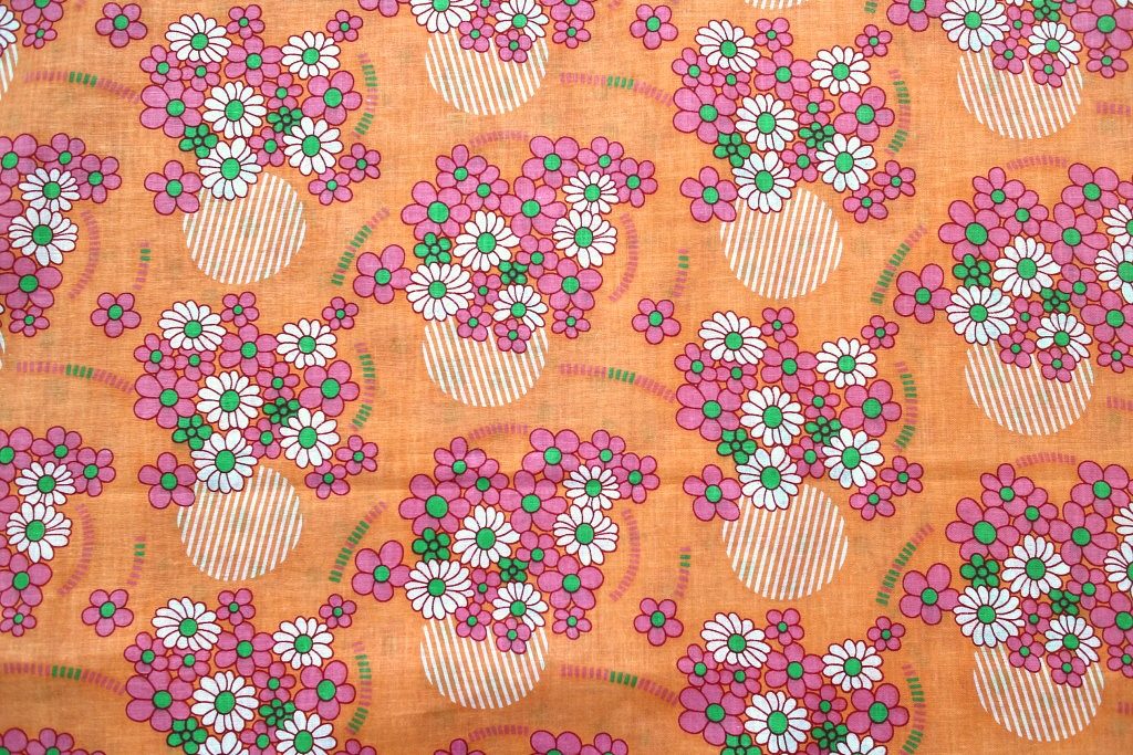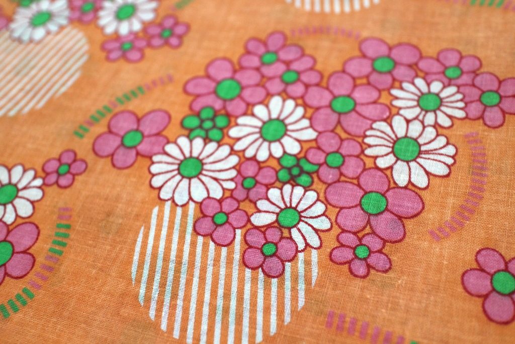 オレンジ色のコットン生地いっぱいに広がるピンクとホワイトのお花と細ストライプのドットが絡み合った、しなやかな動きのあるデザインが特徴的。