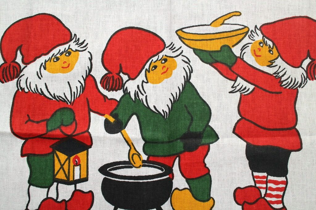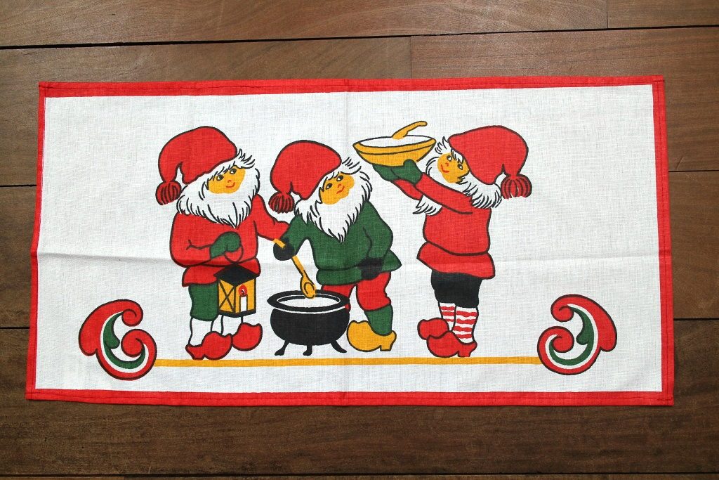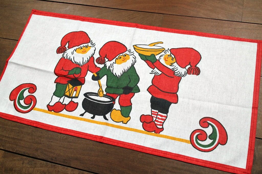 赤と緑のクリスマスカラーの衣装に身を包んだ、3人の妖精が描かれた旧東ドイツ時代のヴィンテージティータオル。