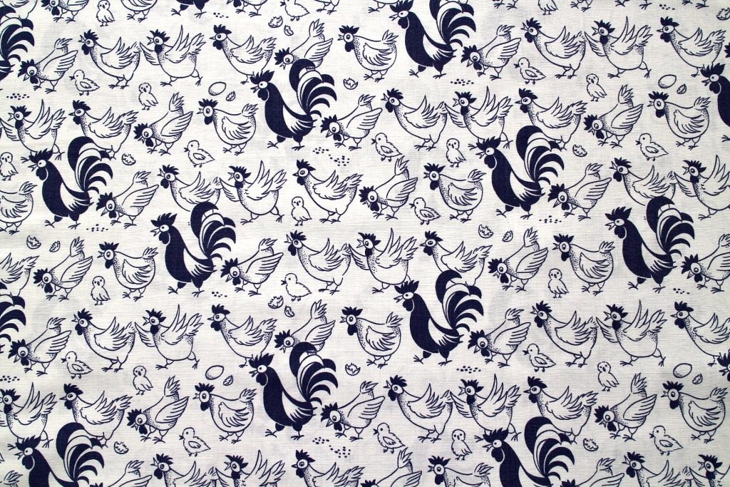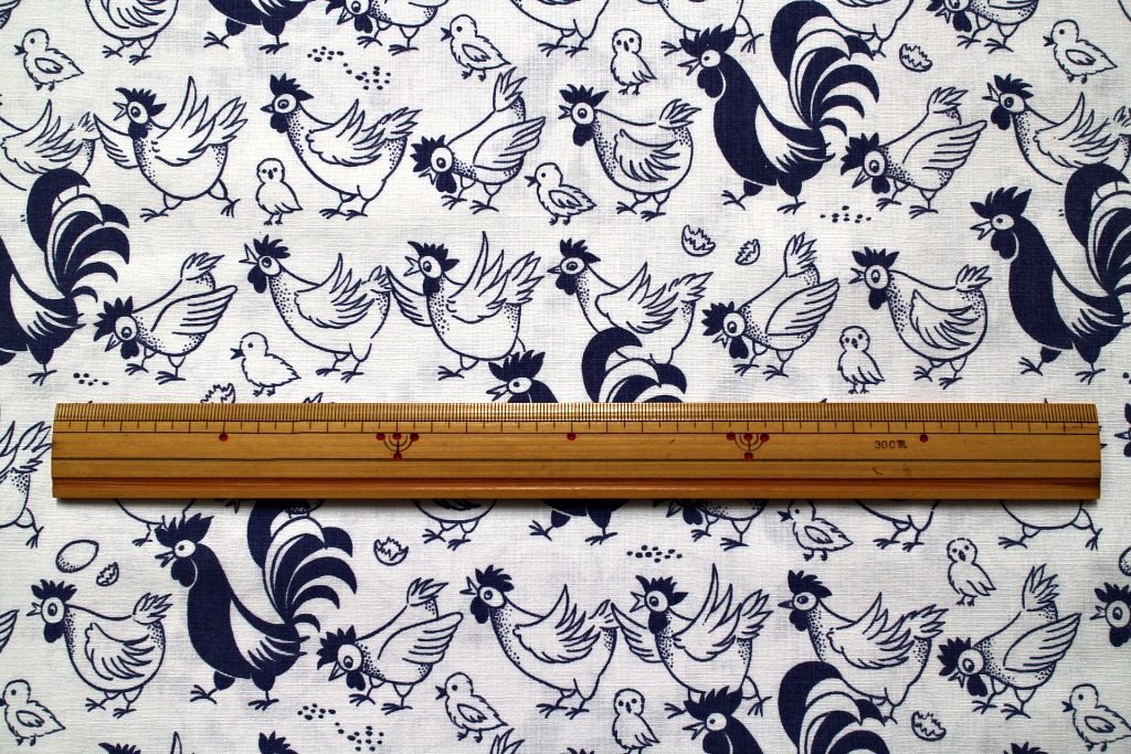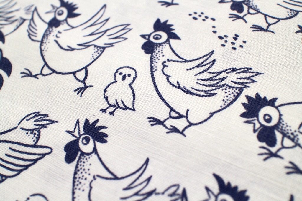 コンテンツにスキップ白地に濃紺で描かれた、ひよこ&にわとりの親子が行進するヴィンテージファブリック。