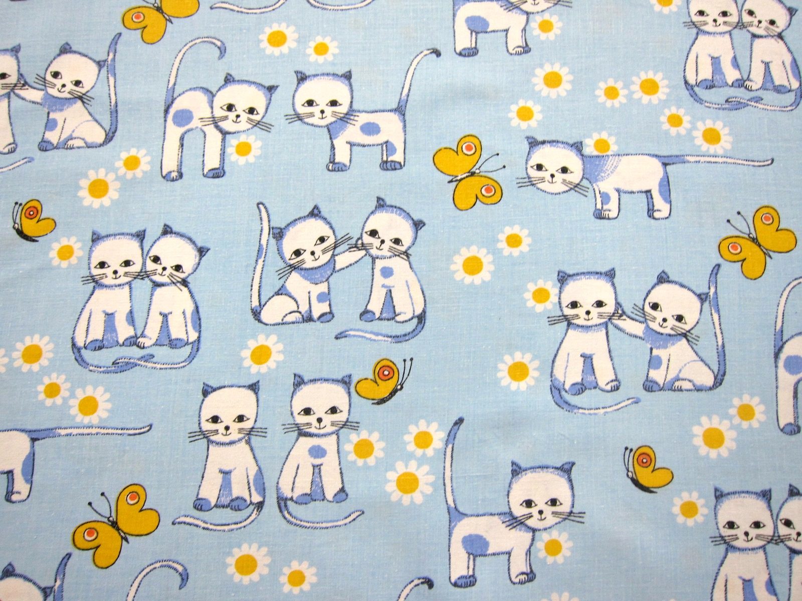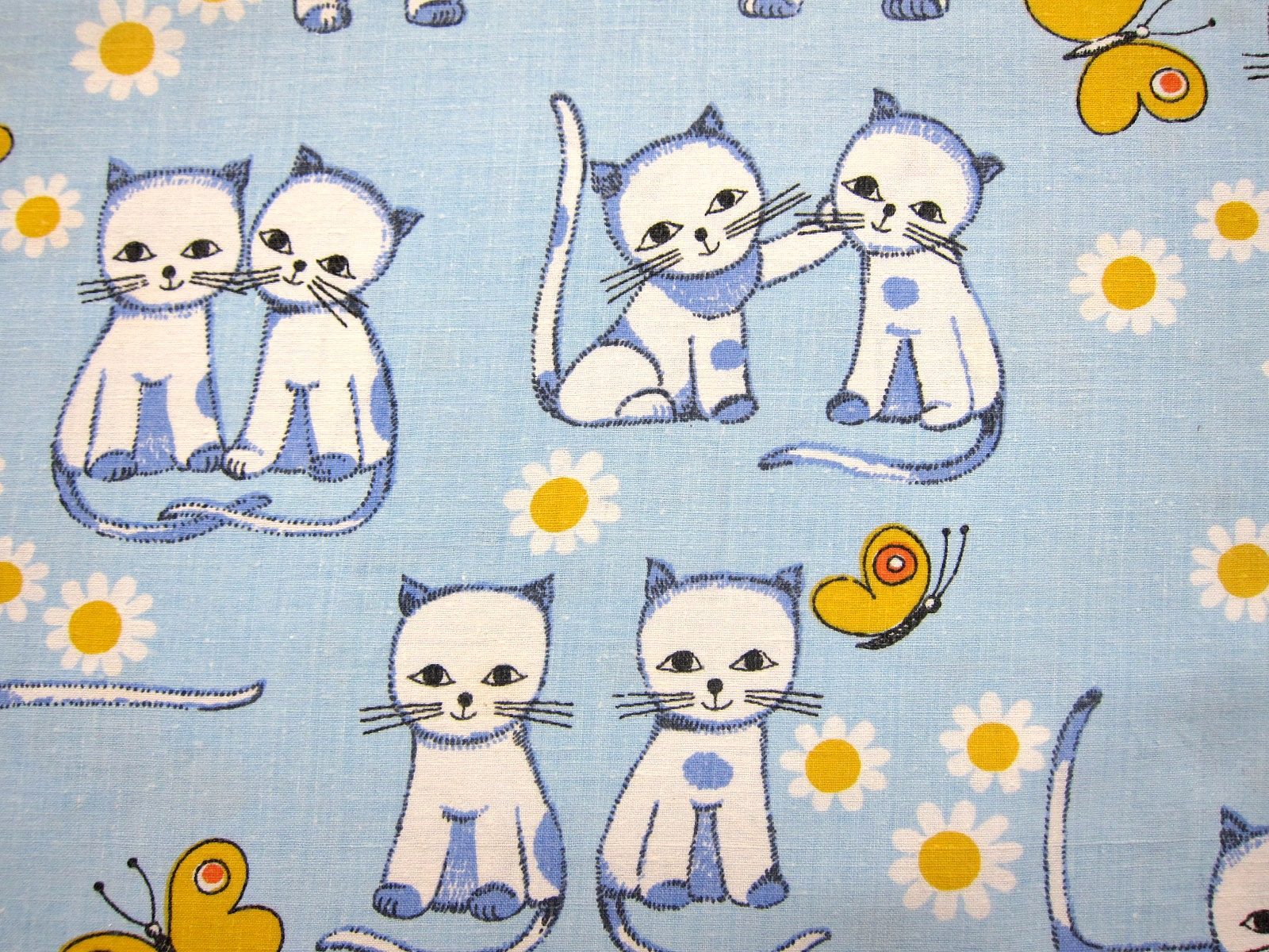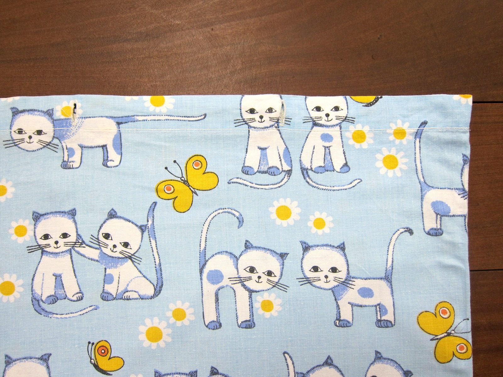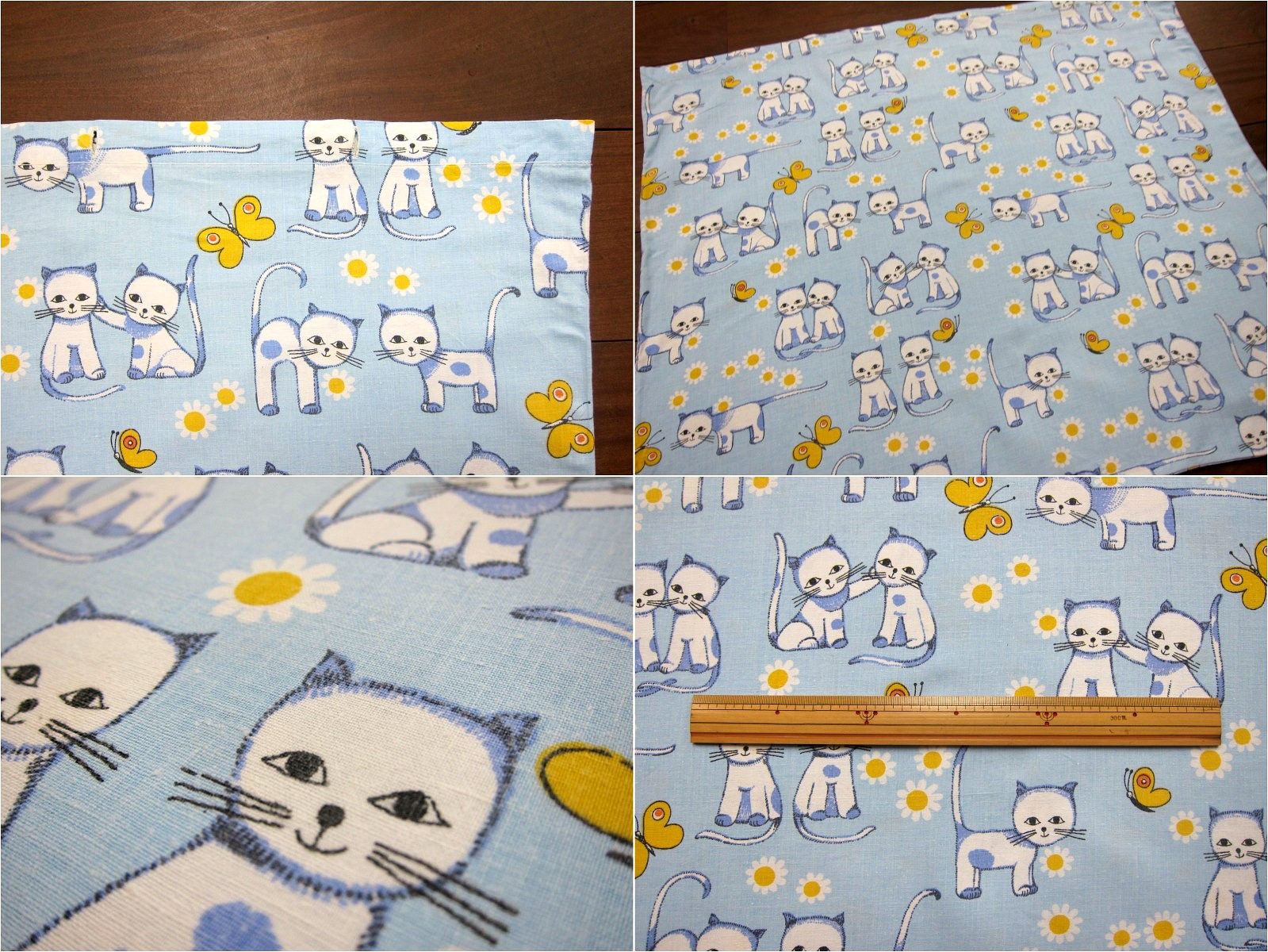 ほんわりした水色に、レトロで可愛らしいネコのイラストが入ったヴィンテージピローケース。 DDR時代のものです。 お花や蝶々のモチーフも入っています。