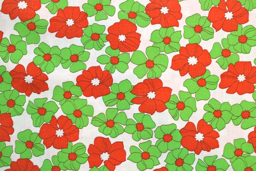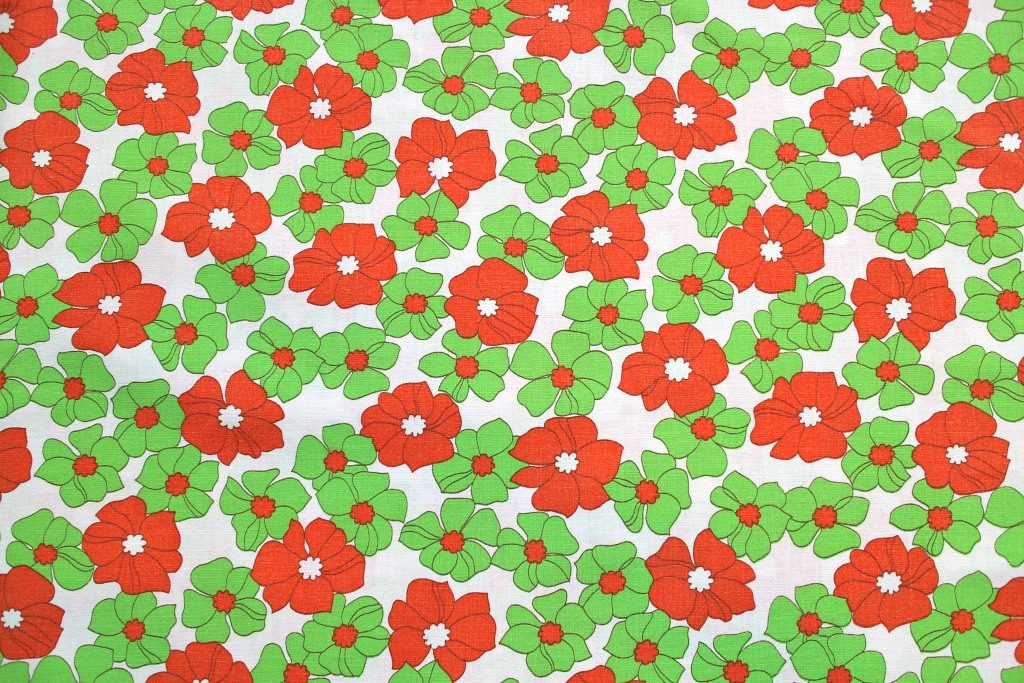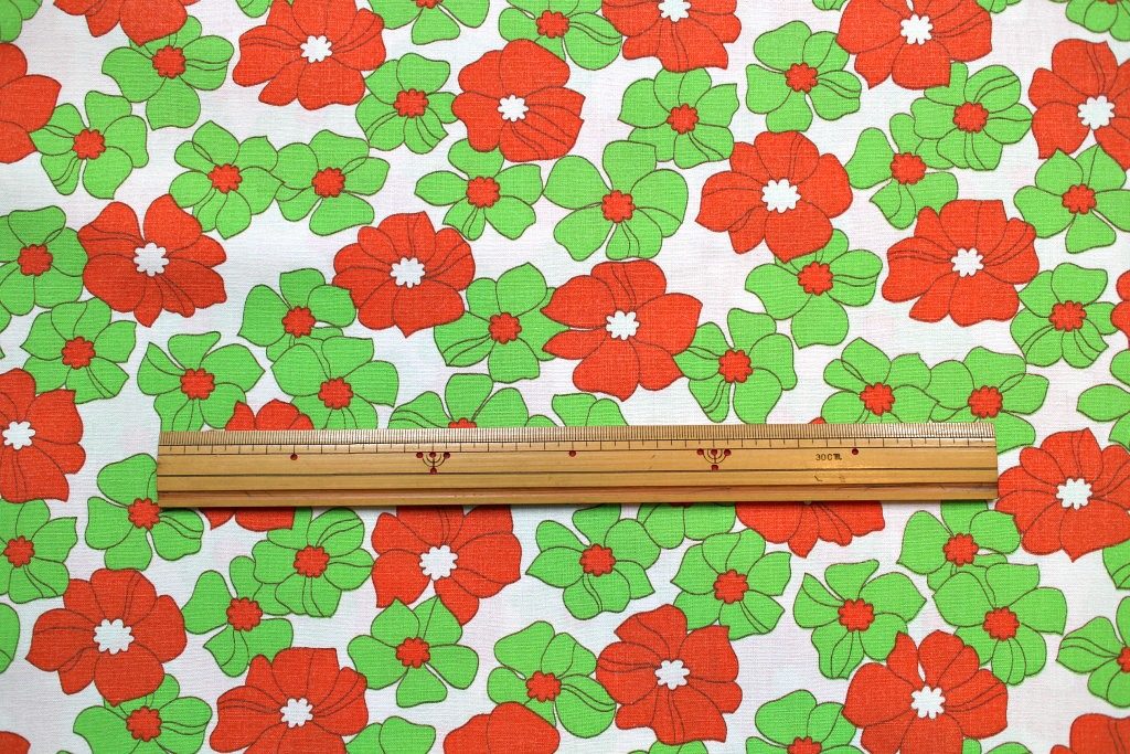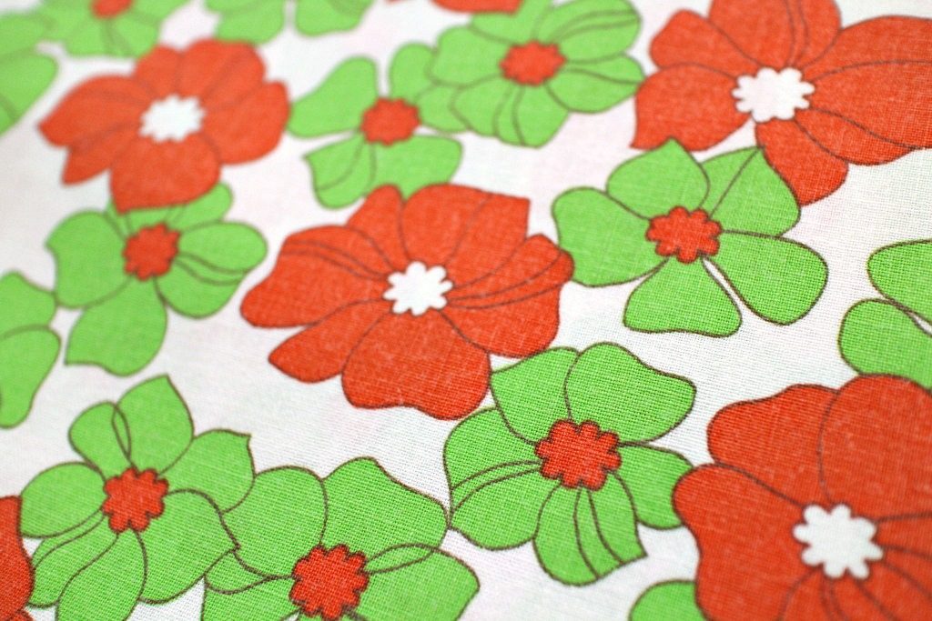 明るいオレンジとライトグリーンのお花がひらひら咲く、シンプルな中にも味があるノスタルジー感ムンムンのヴィンテージコットンファブリック。