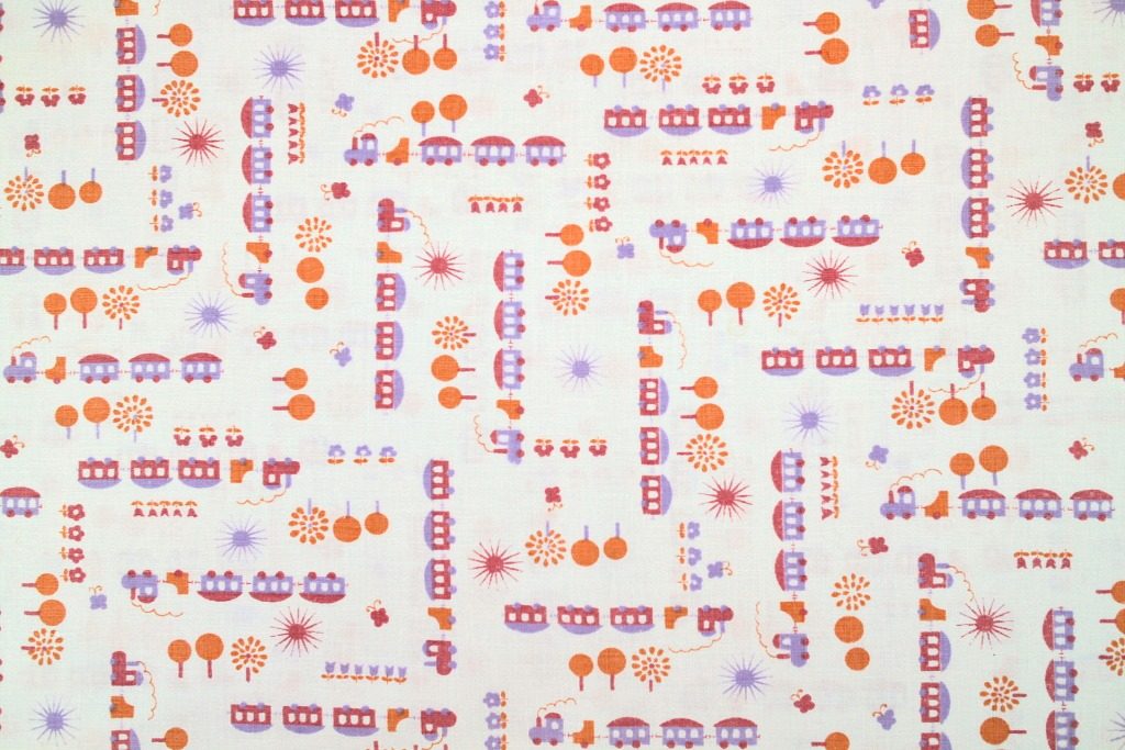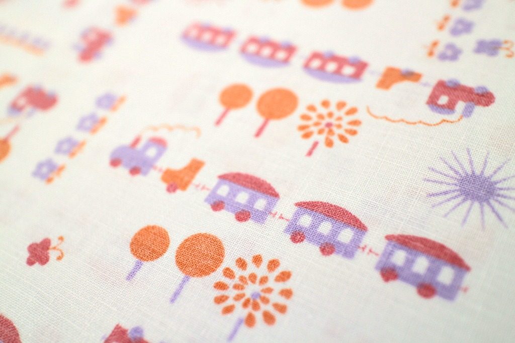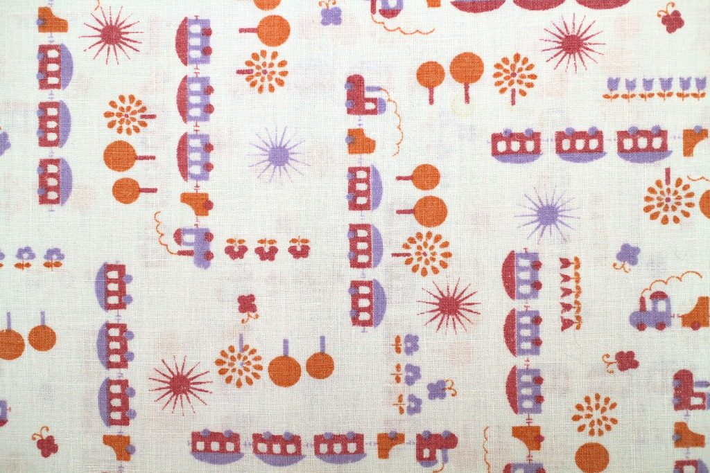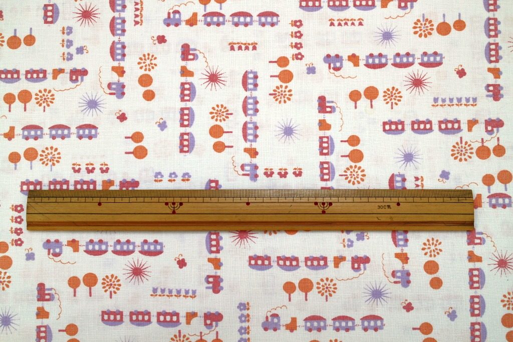 シュポシュポ駆け抜けるキュートな機関車が描かれたふんわり優しいコットン製ヴィンテージファブリック。