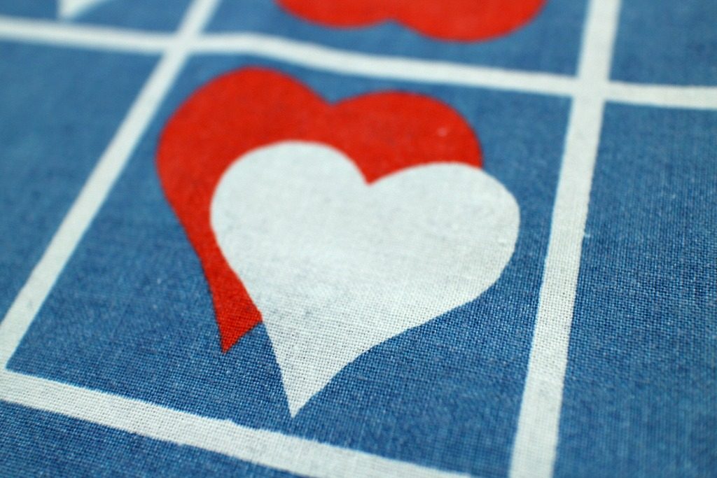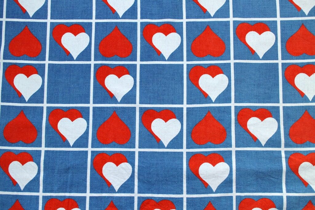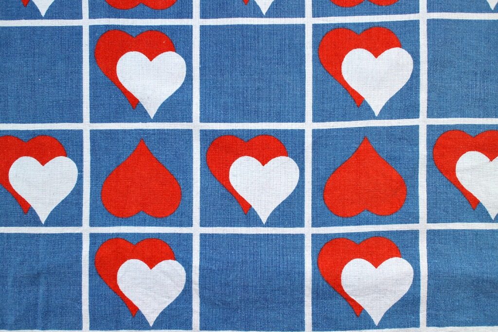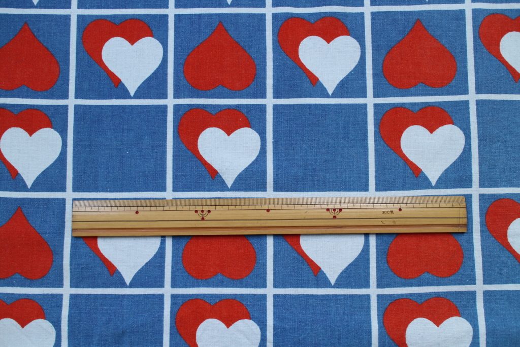 コンテンツにスキップマス目に収まった赤と白のポップなハート模様がレトロなヴィンテージファブリック。