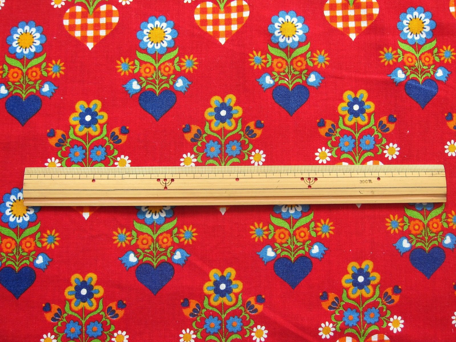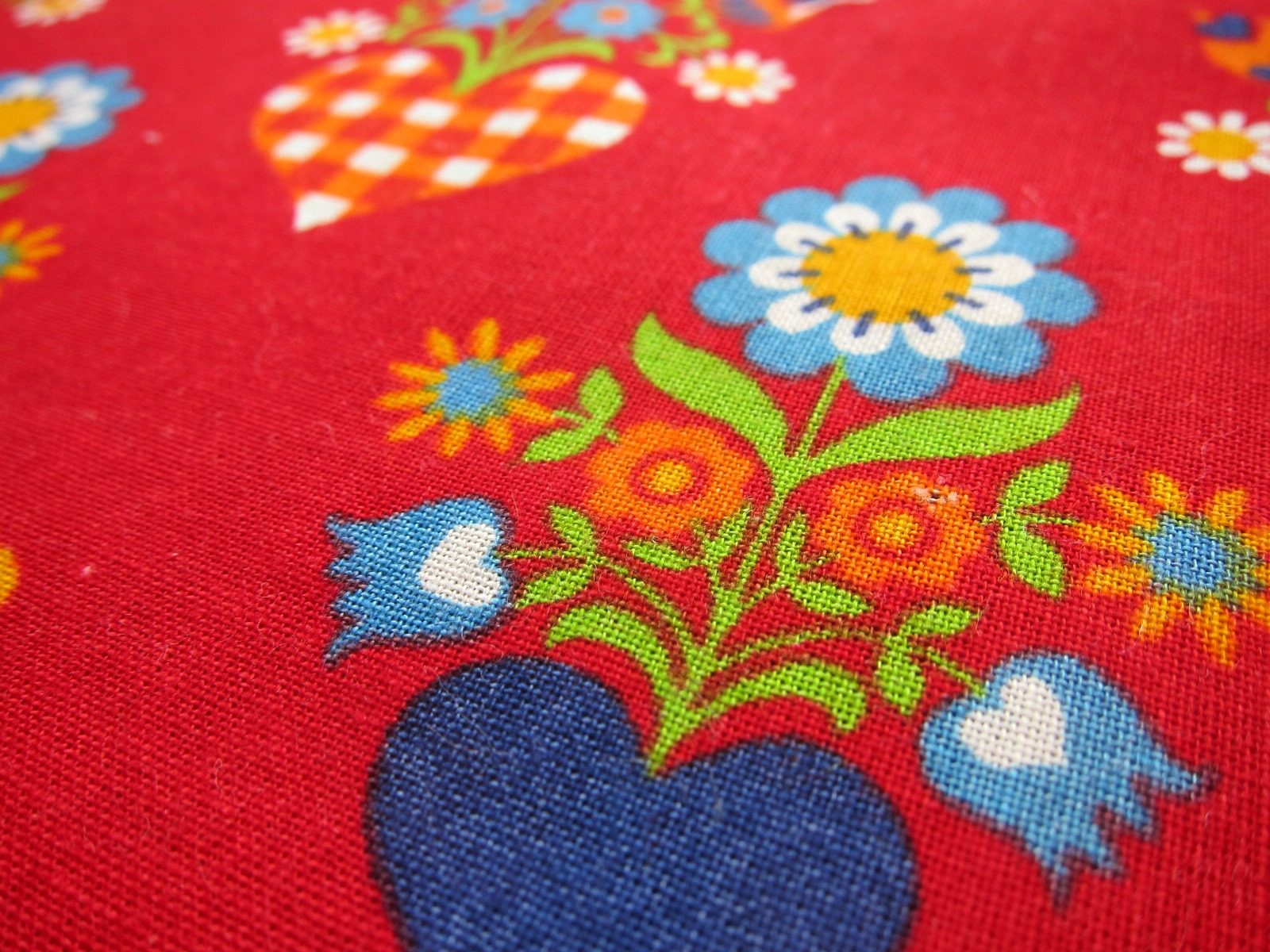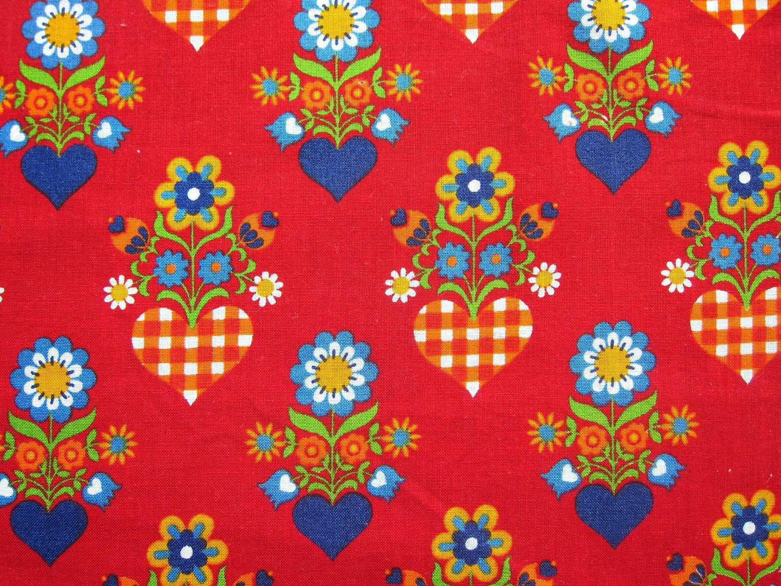 旧共産圏の名残を感じる真っ赤な生地に、エスニックにアレンジされた花とハートが配置されたビンテージファブリック。