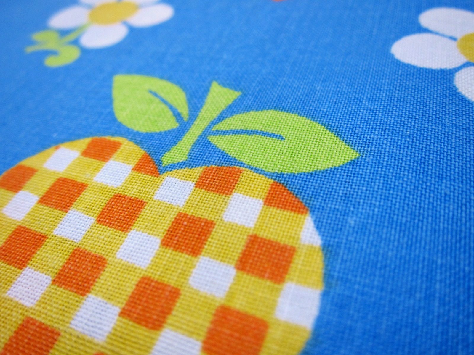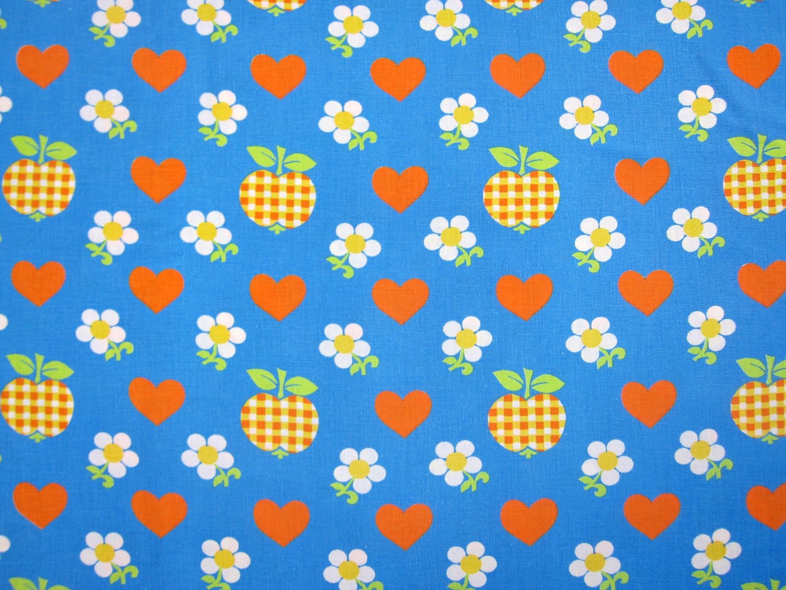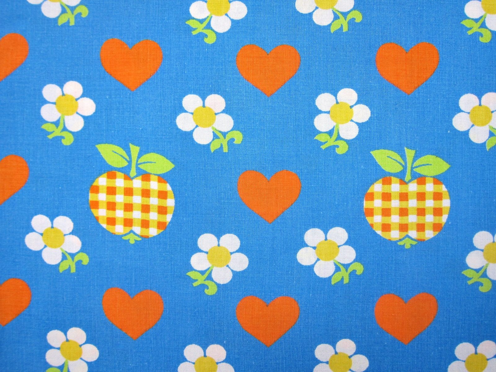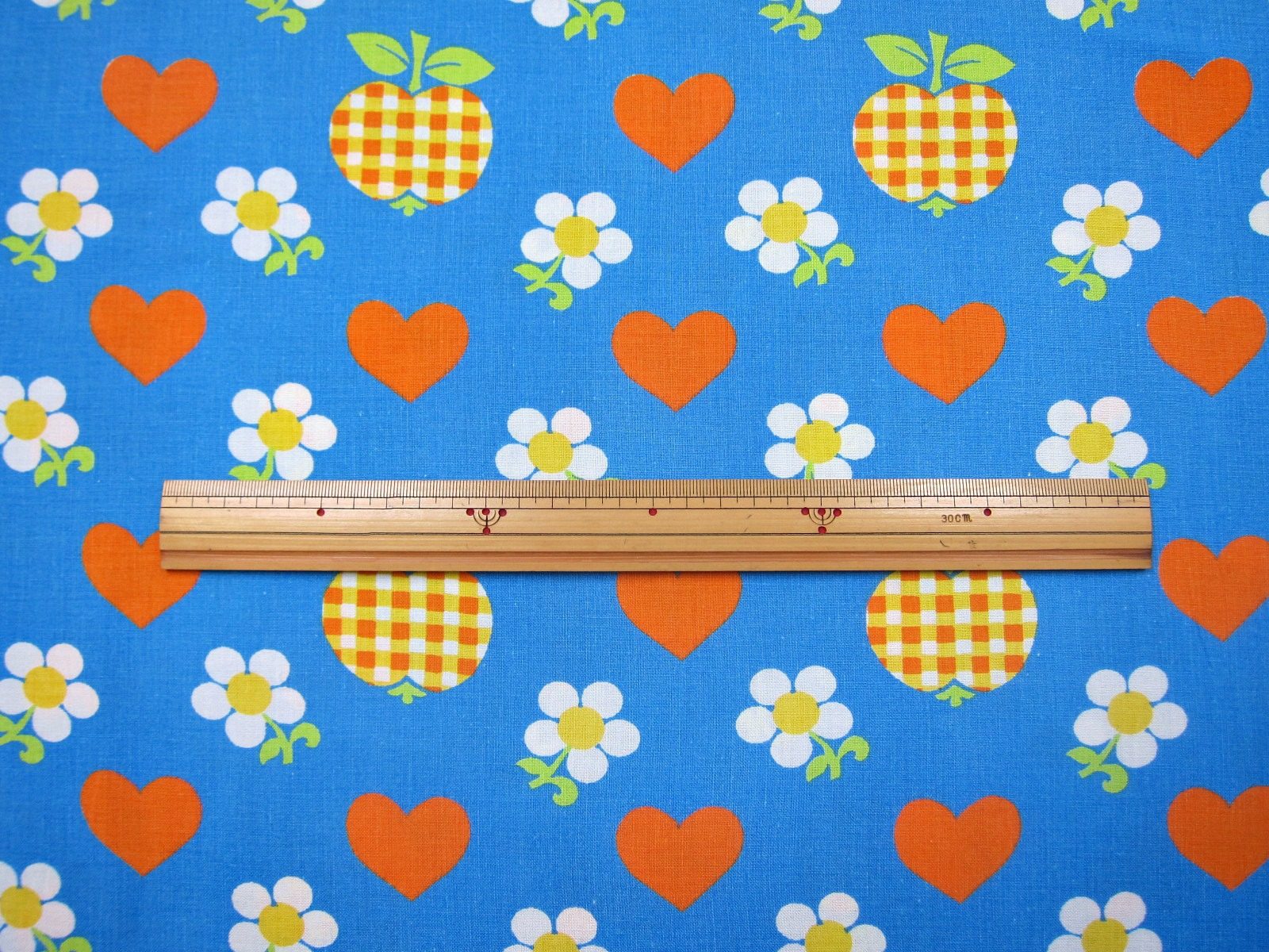 少しだけ深みのあるブルーをした70年代のレトロなヴィンテージ生地。 リンゴ、ハートとお花のモチーフが入った、ノスタルジー溢れるパターンです。