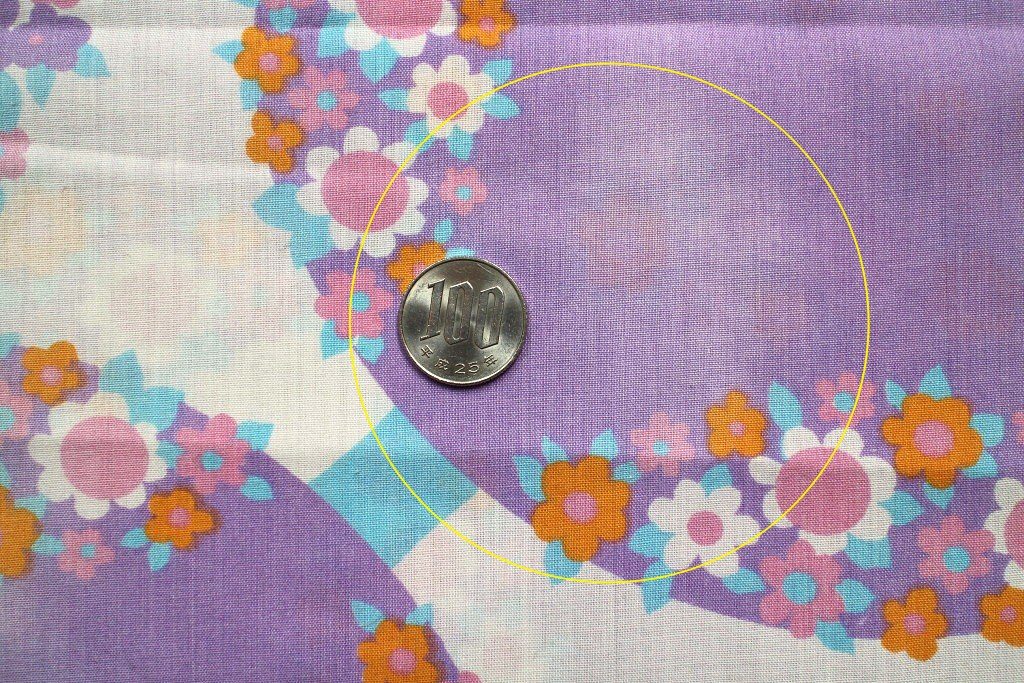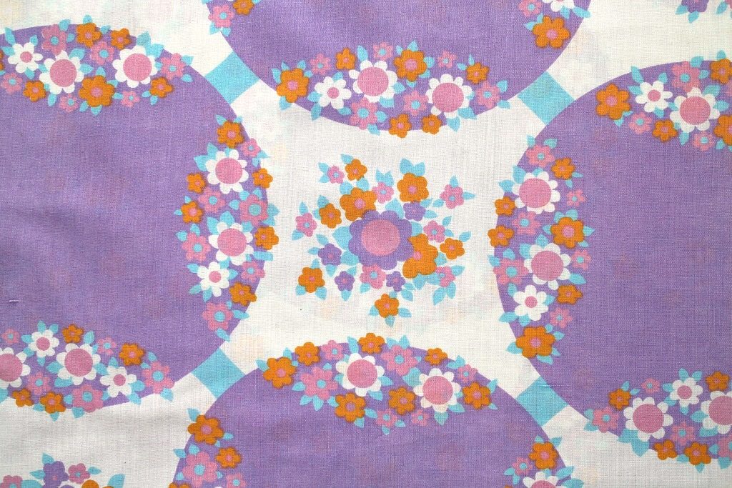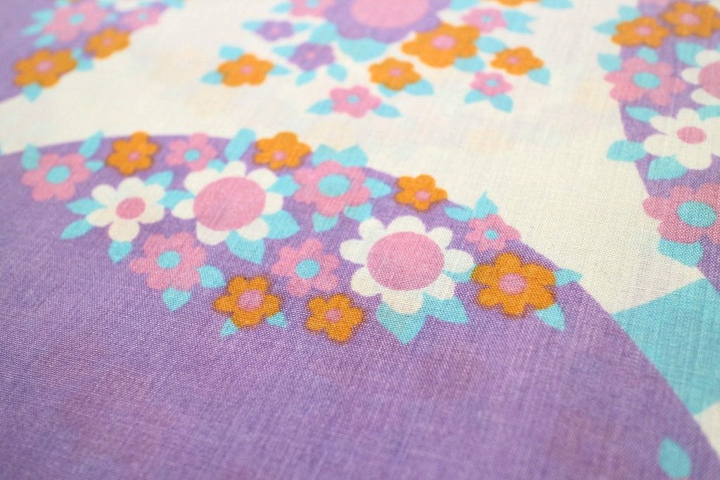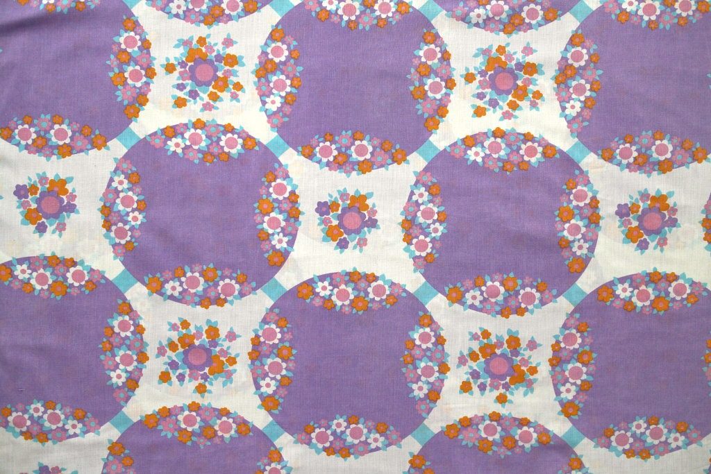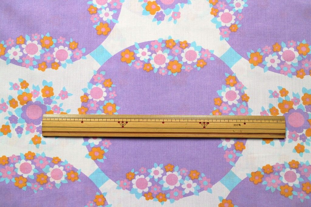 白&紫の円が重なる部分がブーケになった、立体感のあるデザインがユニークなヴィンテージ生地。