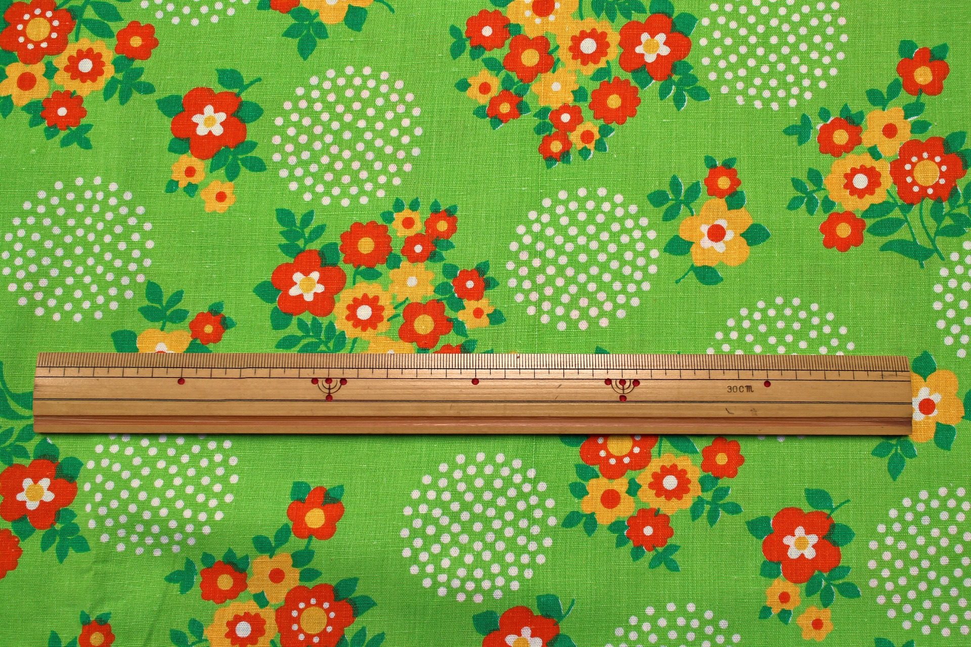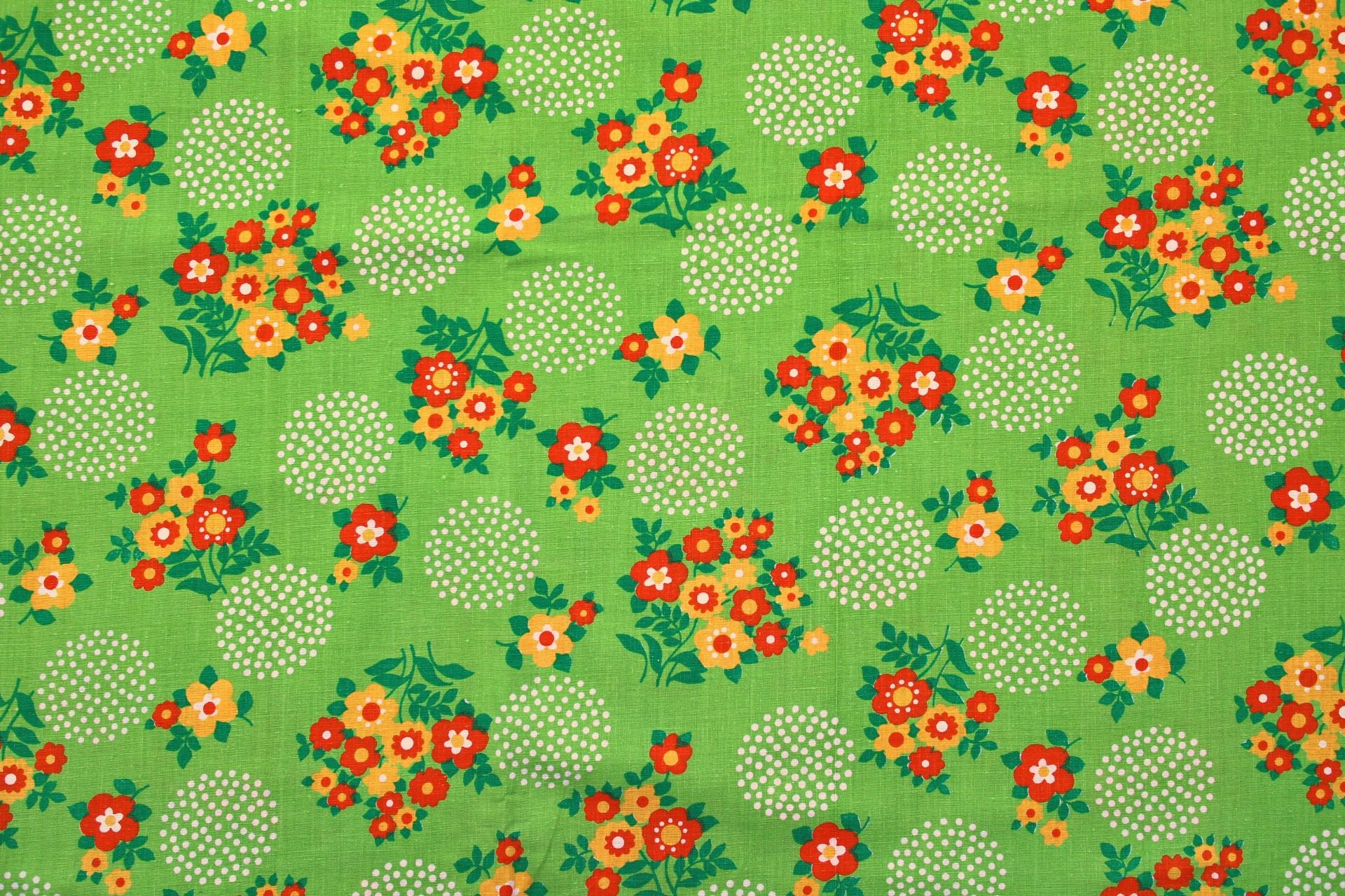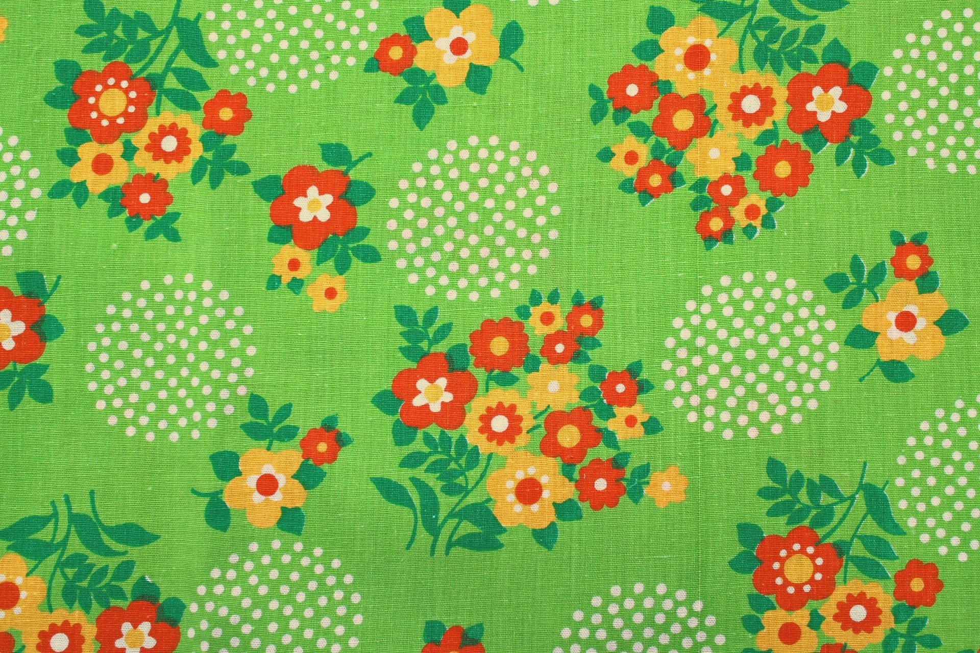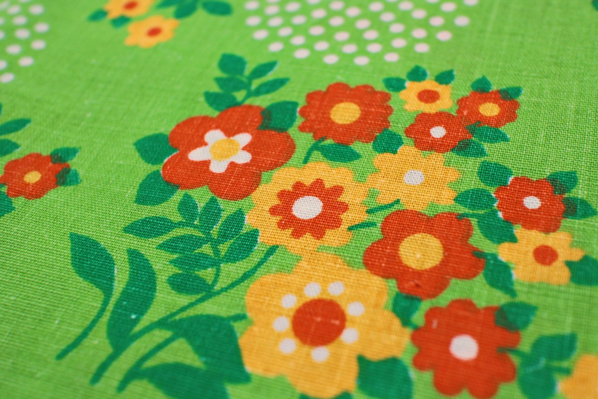 コンテンツにスキップオレンジの明るいお花のブーケにドットで描かれた水玉があしらわれた、鮮やかライトグリーンのヴィンテージファブリック。