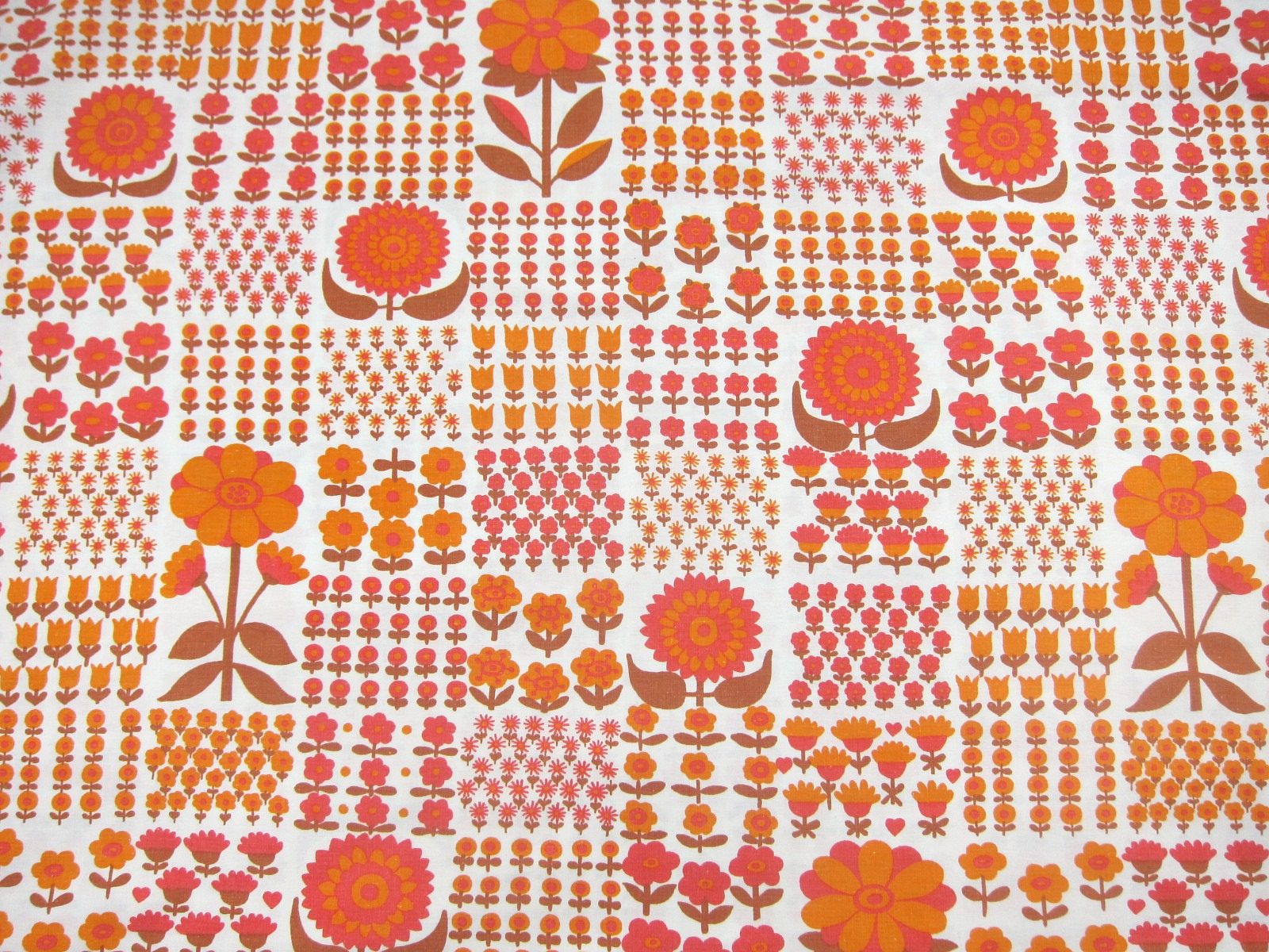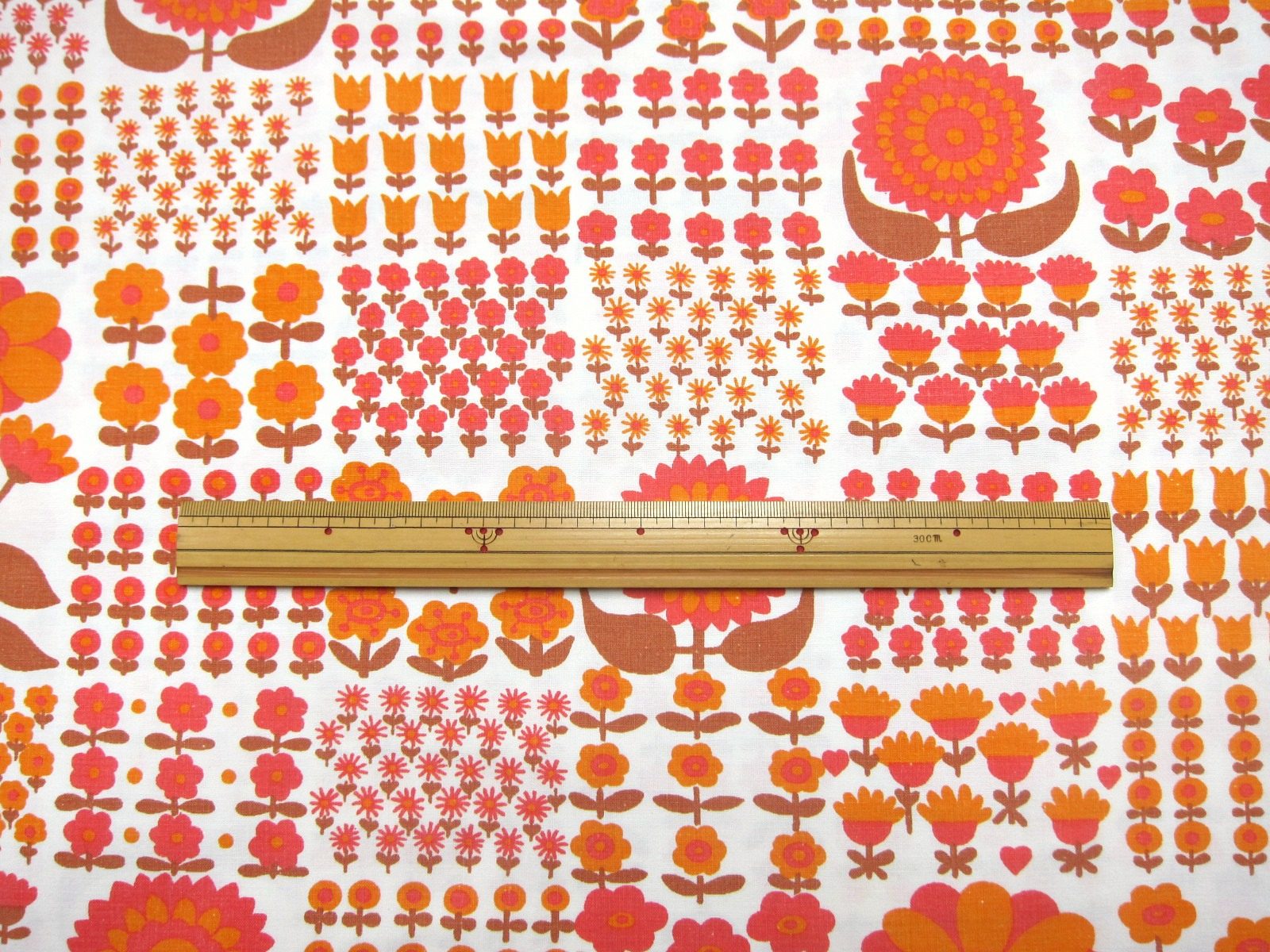 オレンジとピンクのノスタルジックな花柄パターン。 色んなサイズのフラワーモチーフがぎっしり詰まっています。