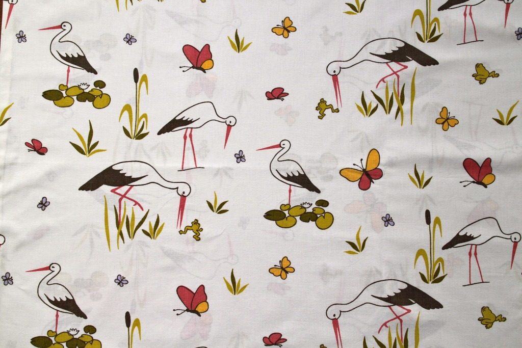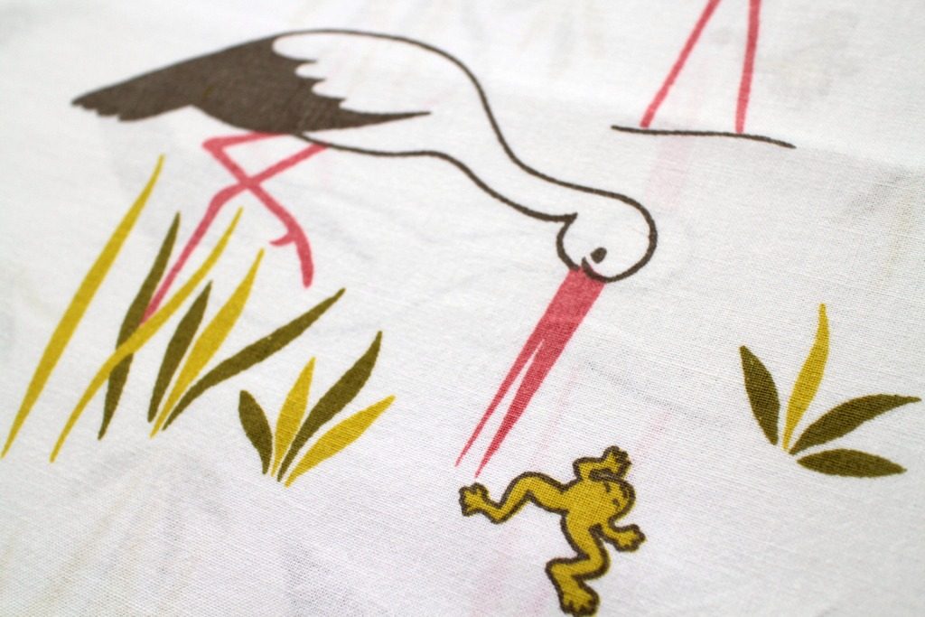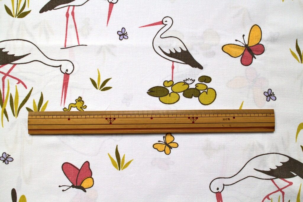 ピンクのくちばしと長い足が特徴的な、優しい雰囲気いっぱいのバード柄ヴィンテージファブリック。