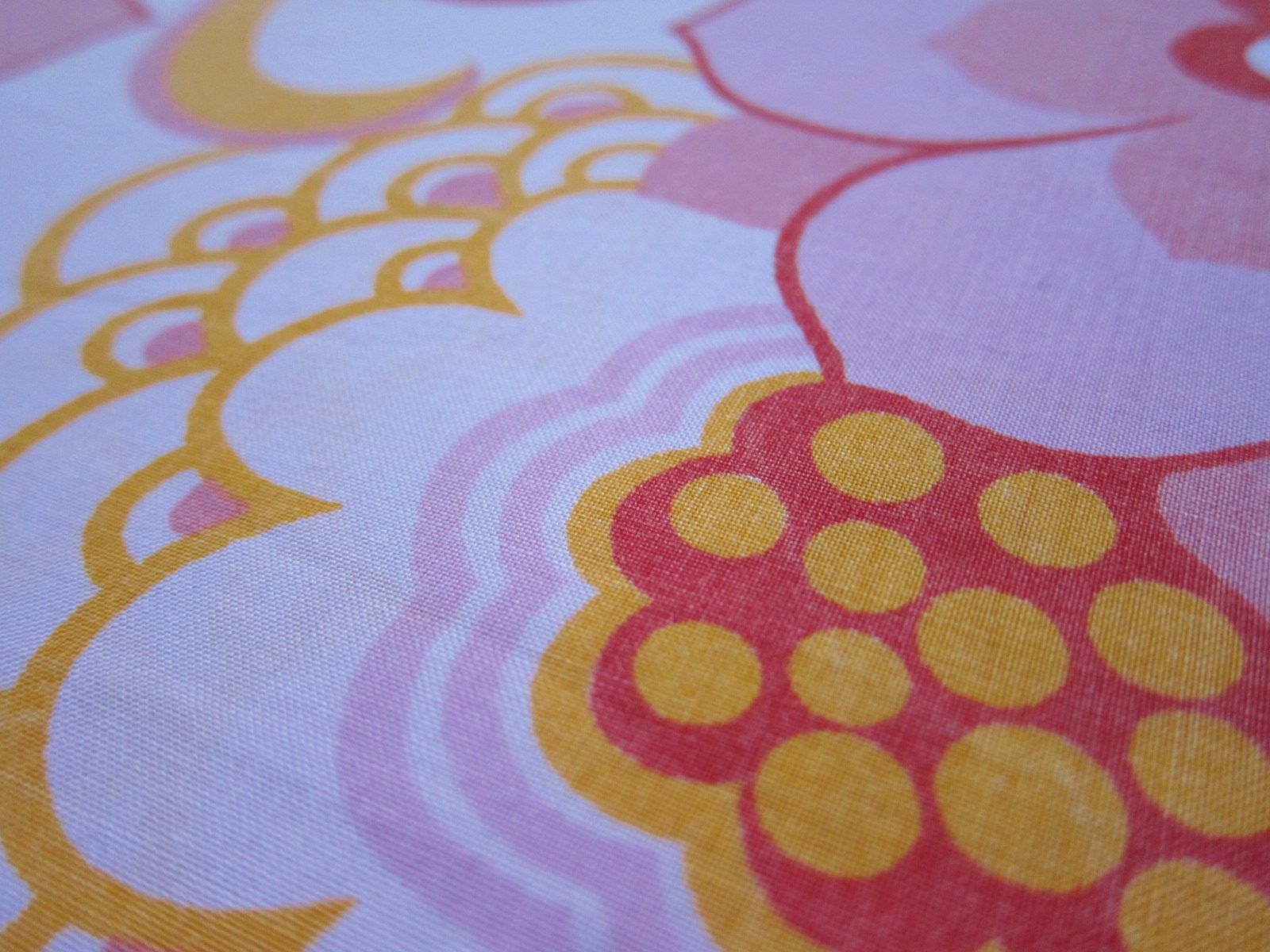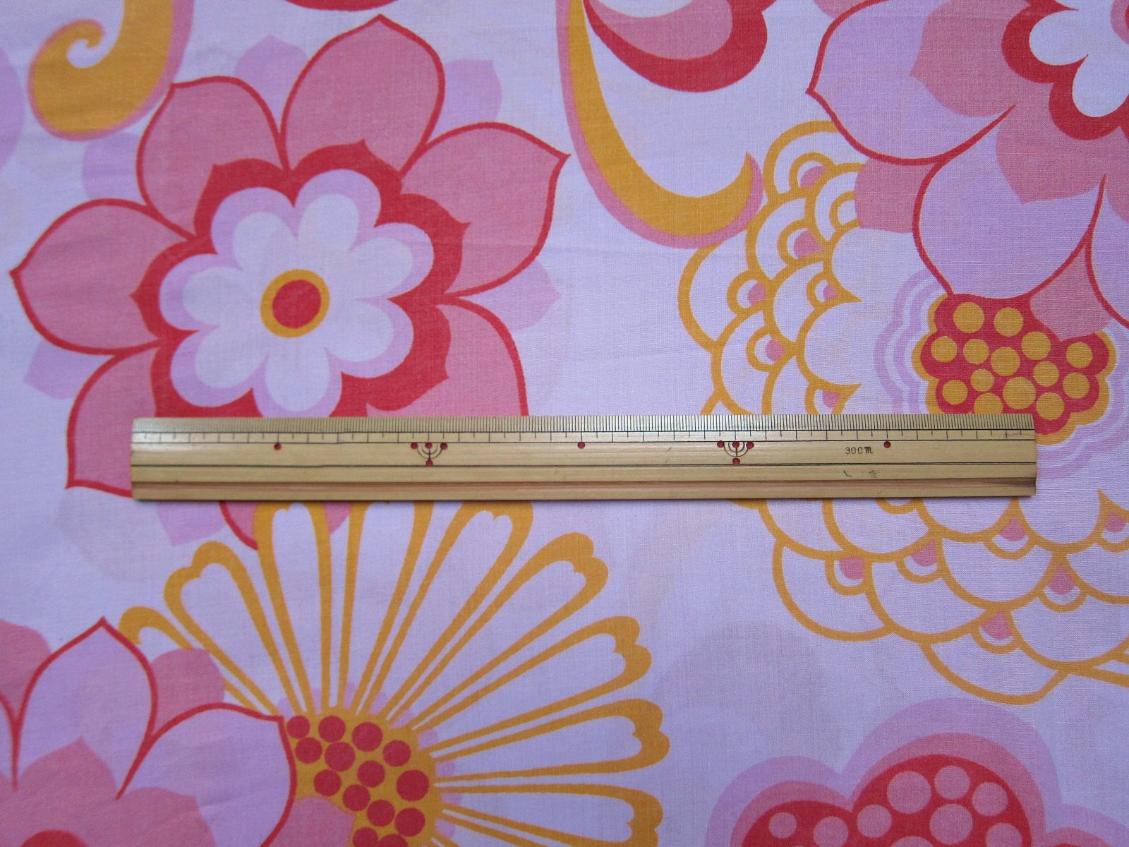 大きめな花のパターンが入った、70年代のヴィンテージファブリック。 ピンクを中心に、赤、黄色の配色でダイナミックに色々な花のモチーフが描かれています。