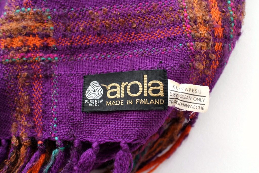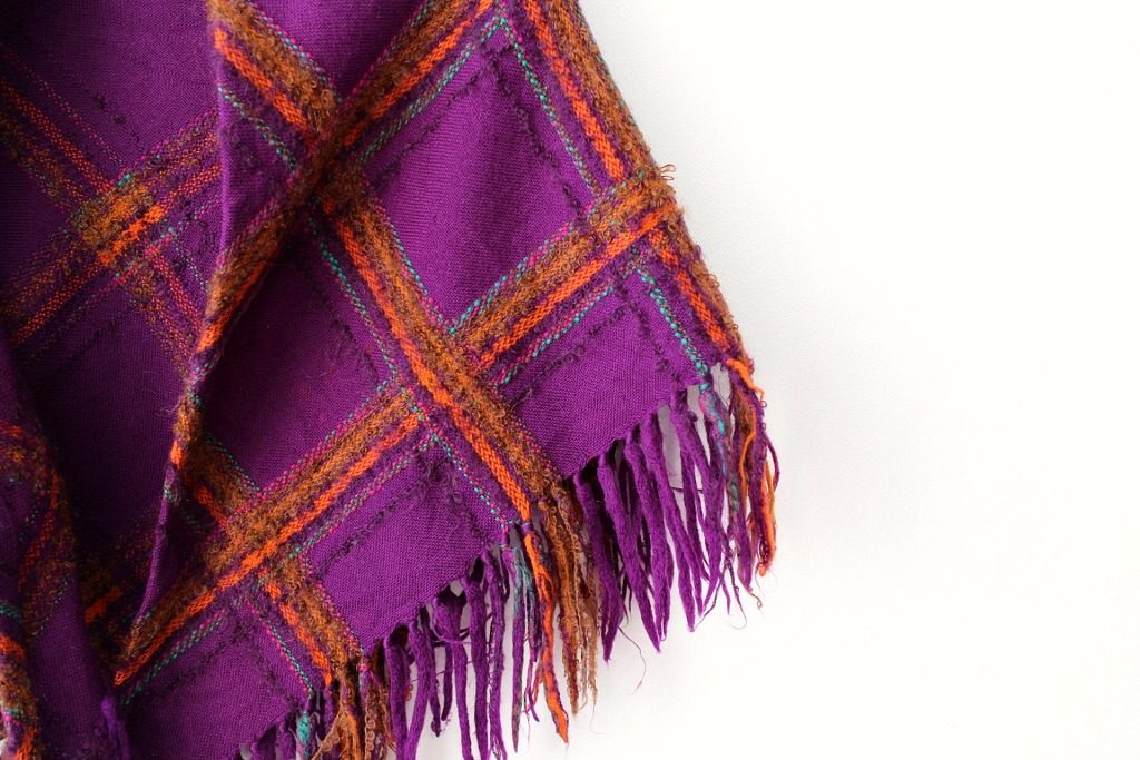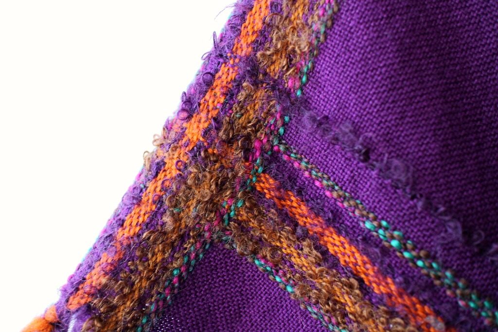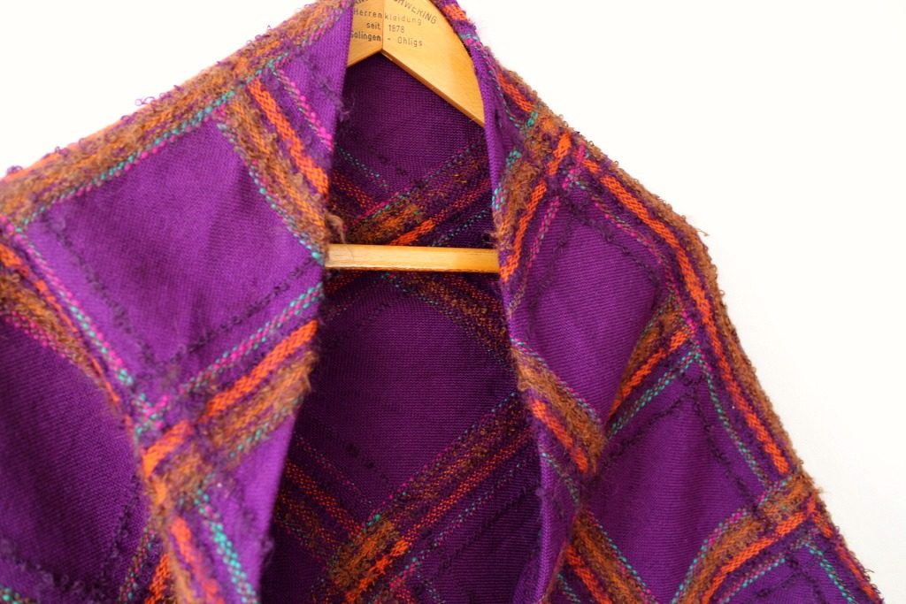 ベルリンのヴィンテージショップで発見した渋めの紫地にオレンジ系チェック模様の入ったレトロなショール。 広げると三角形になっています。