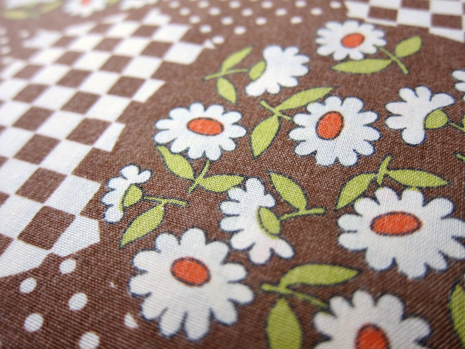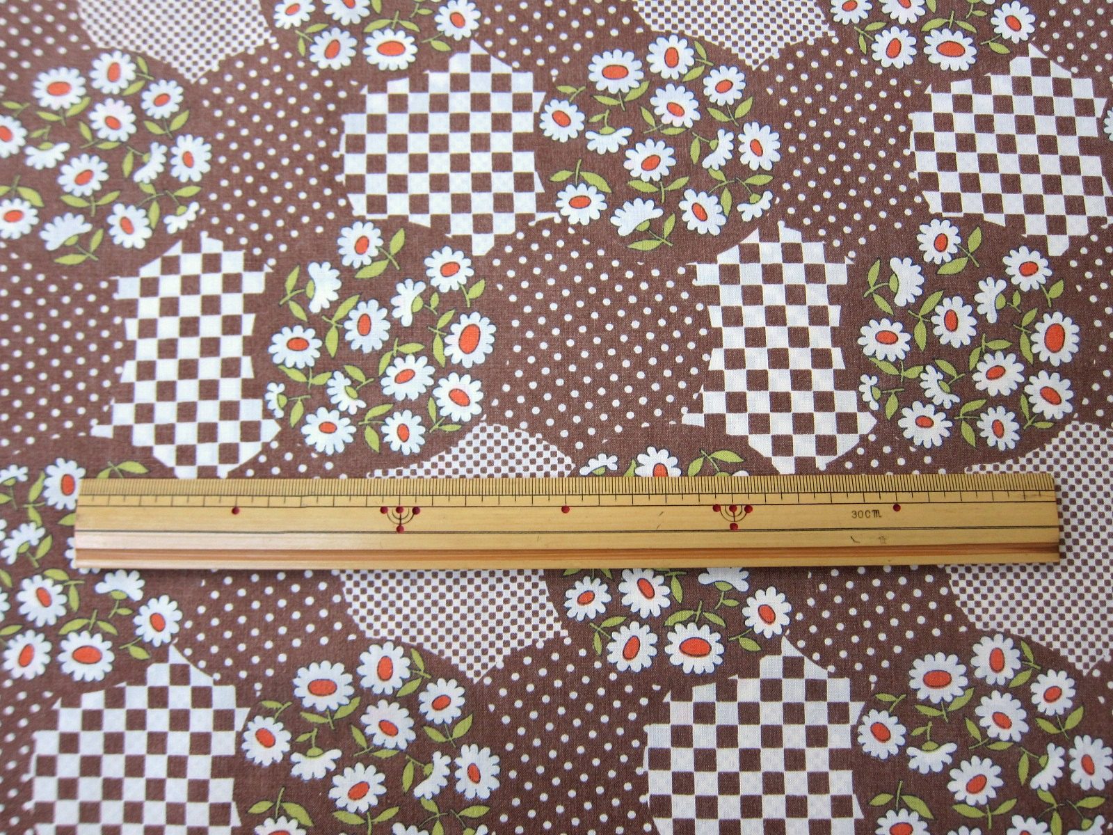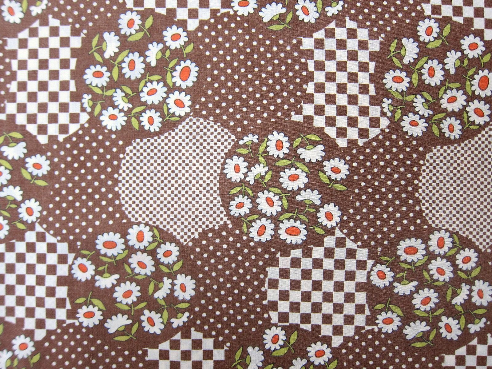 コンテンツにスキップ茶系モノトーンのハーリキン・チェックや水玉模様、そして可憐なマーガレット柄がパッチワークのように並んだレトロな生地。