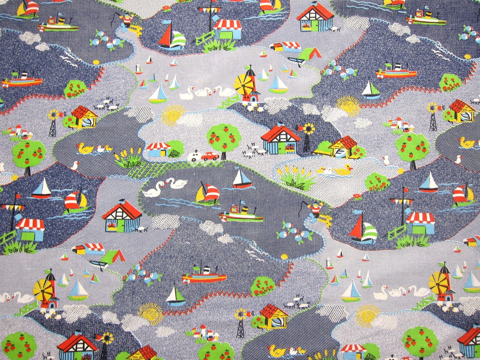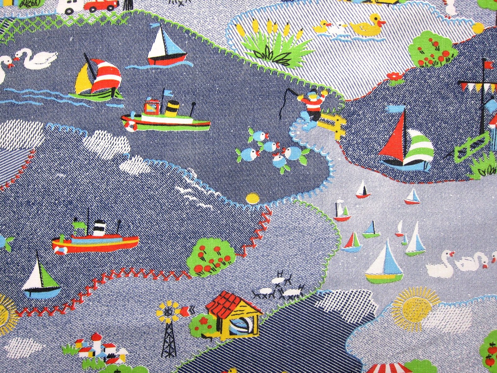 ボートや魚、鳥など楽しいイラストがファブリック全体に描かれた、とってもキュートな印象です。
