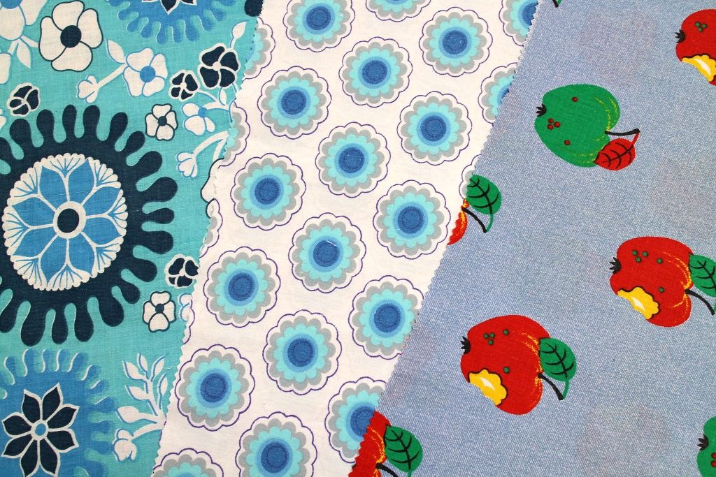 ブルー系レトロなフローラル柄コットンはぎれ・中サイズ3枚セット