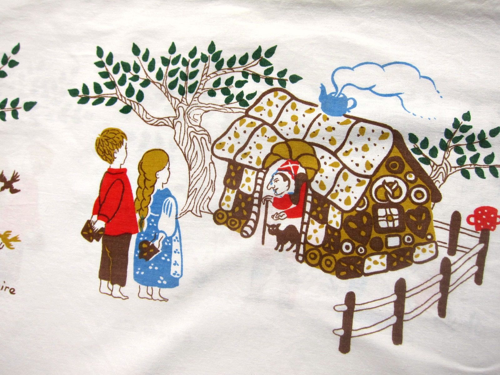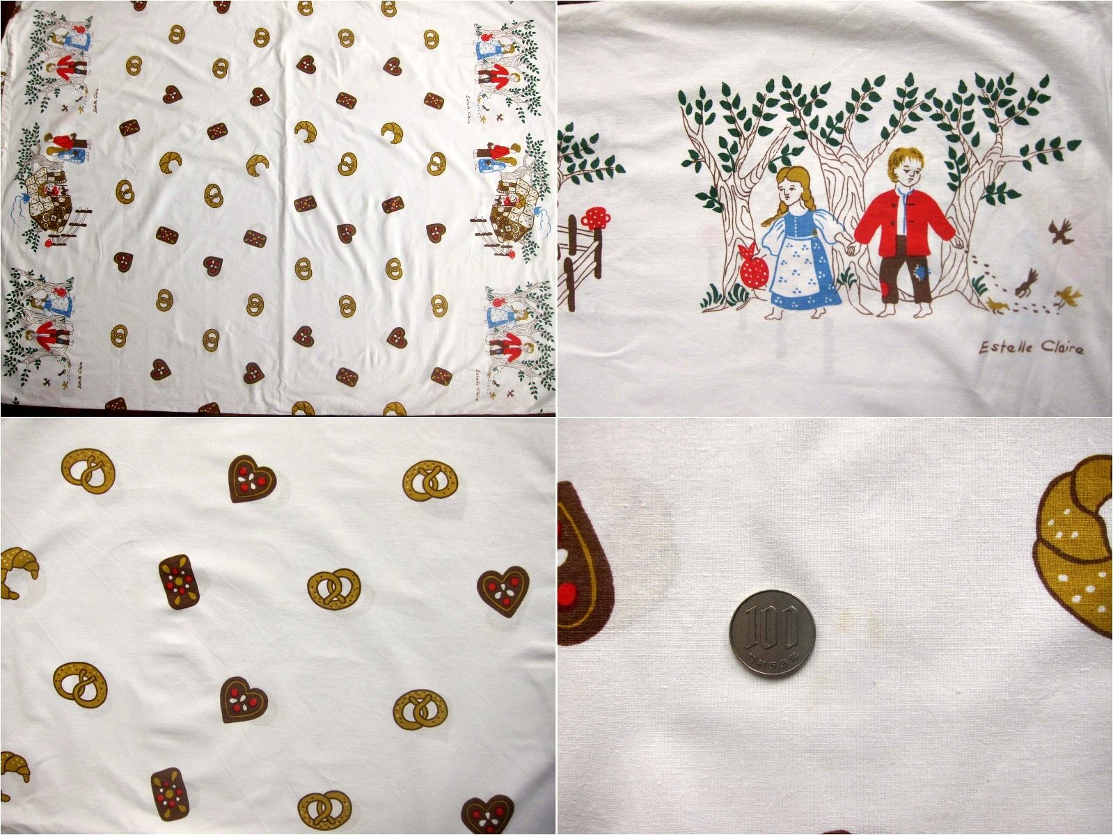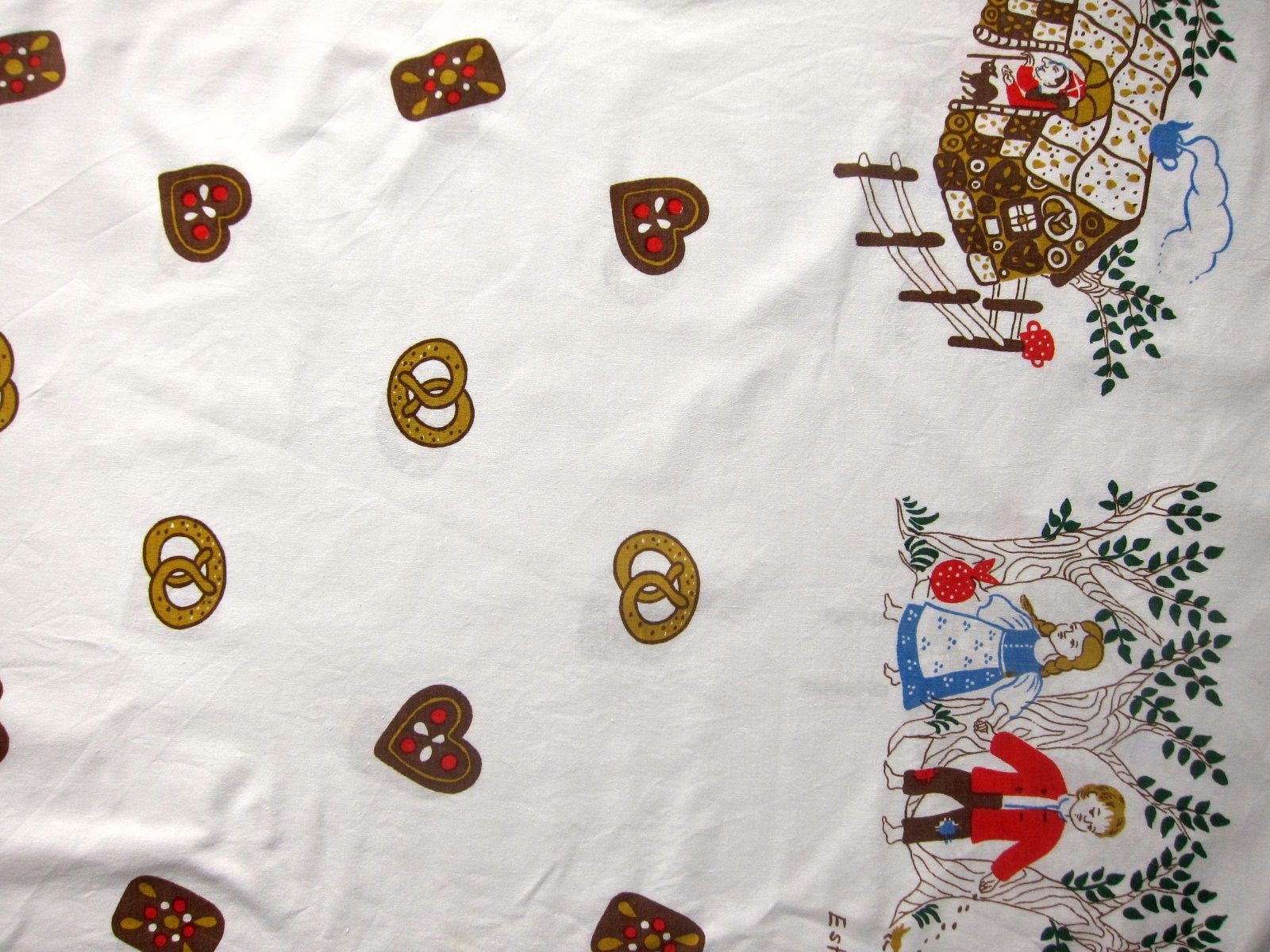 グリム童話のヘンゼルとグレーテルのお話のイラストのヴィンテージファブリック。 両サイドに魔女やヘンゼルとグレーテル、お菓子の家などが描かれており、中央にはプレッツェルやビスケットのイラストが入っていてとてもかわいらしい柄です。