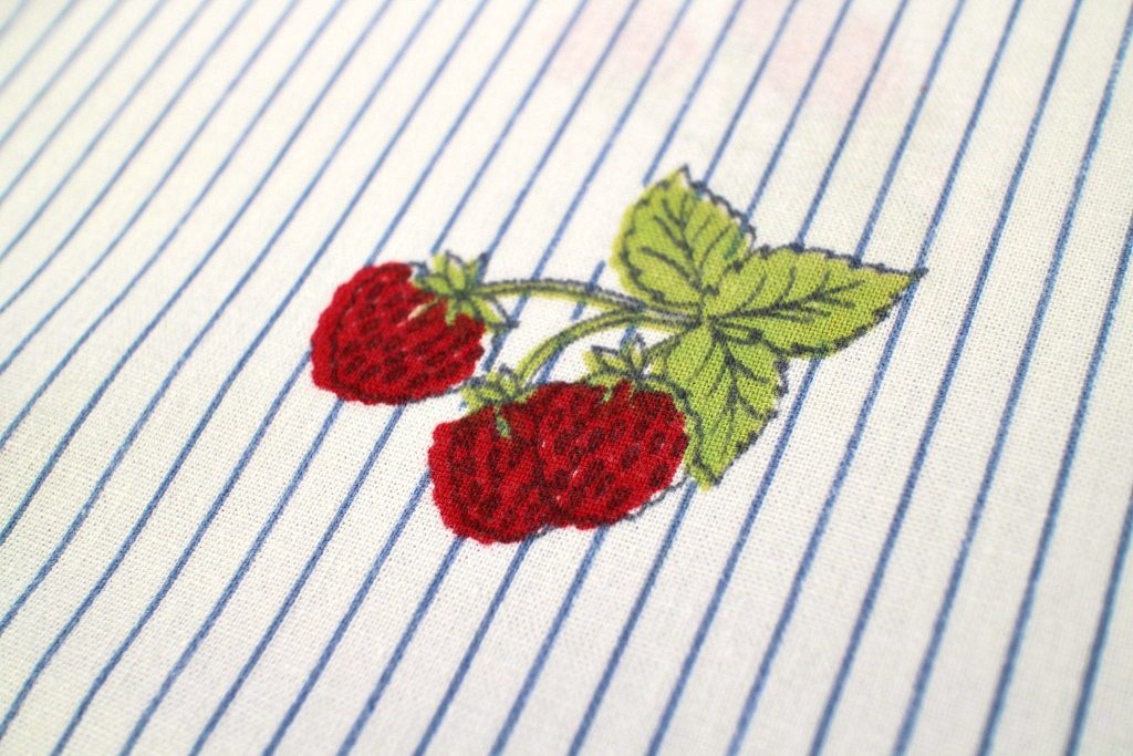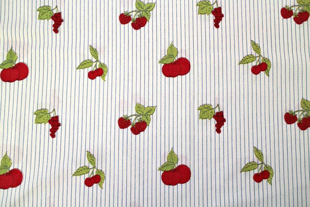 リンゴやさくらんぼ、野いちごなど赤い実の果物が繊細なタッチで描かれたコットン製レトロ生地。