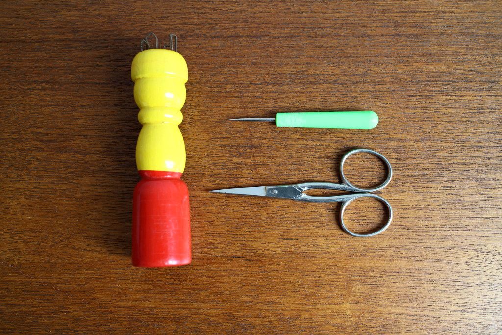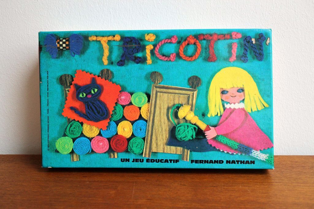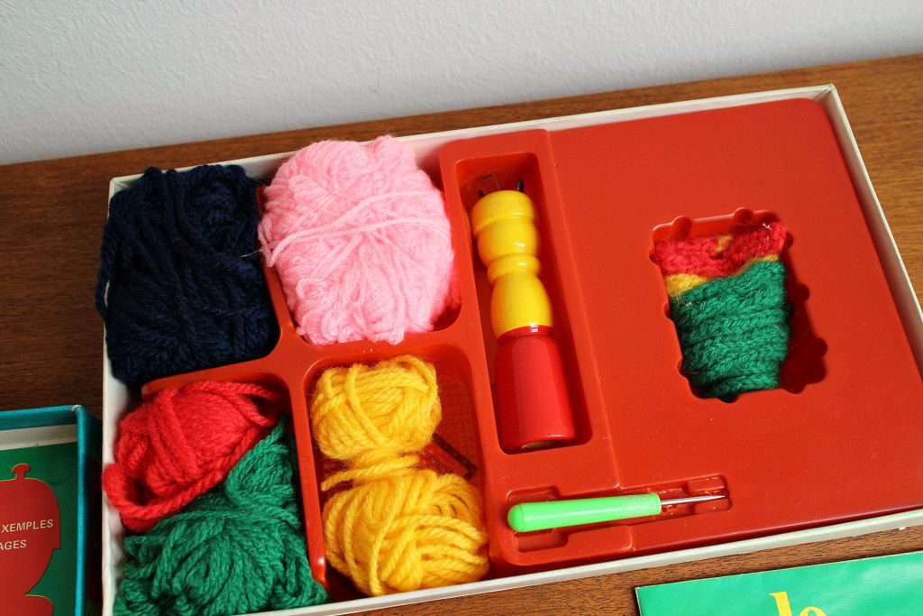 懐かしさいっぱいのリリヤン編み、毛糸やハサミなどが同梱されたレア度高めの70年代ボックスセットをブリュッセルの蚤の市で入手しました。 黄色と赤色のころんとしたフォルムがキュートな本体は木製。 毛糸・ニードル・ハサミとフランス語による説明書がセットになったレトロ感あふれるアイテムです。 レトロなおもちゃコレクションに。