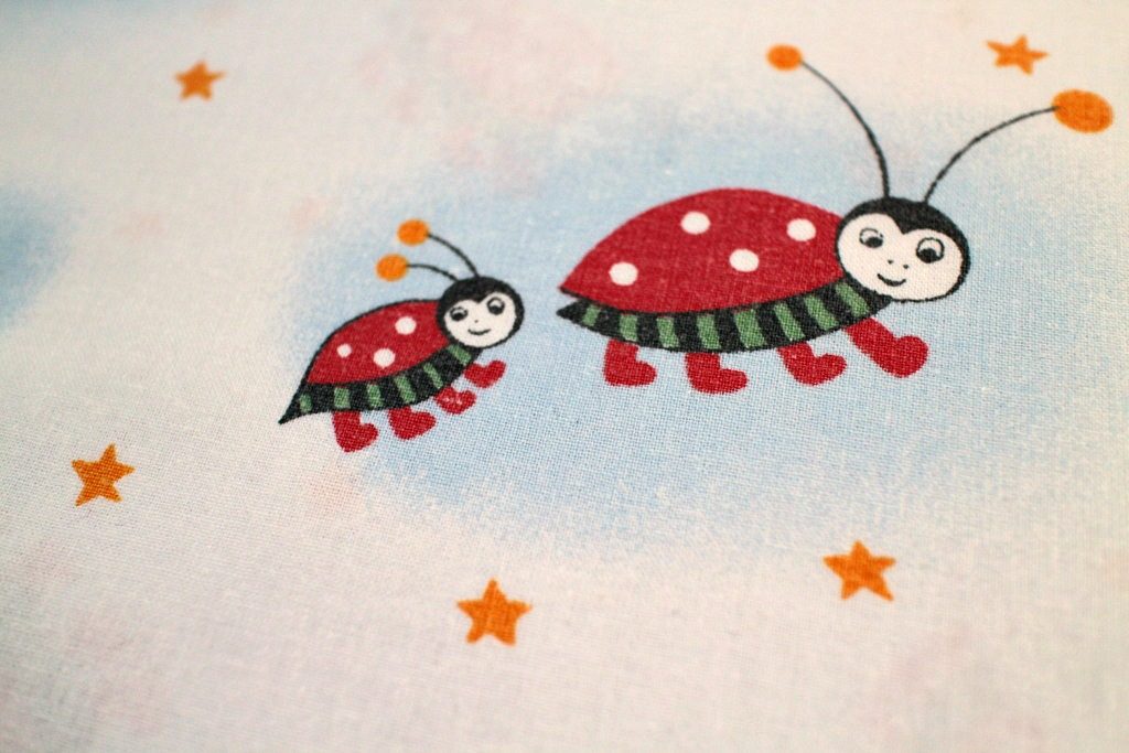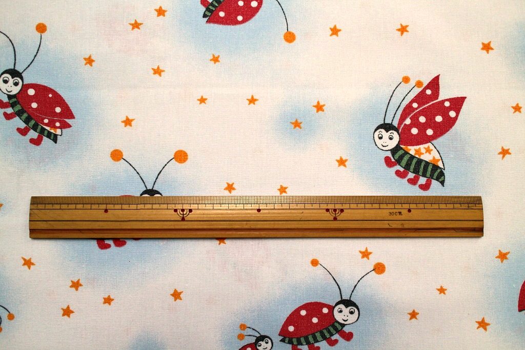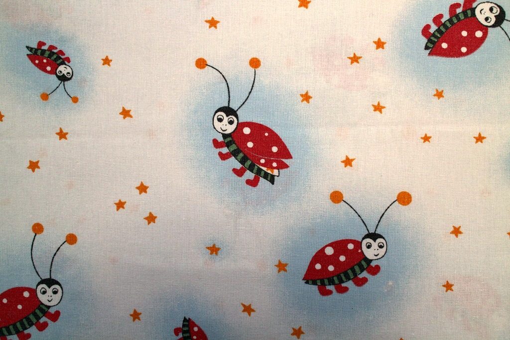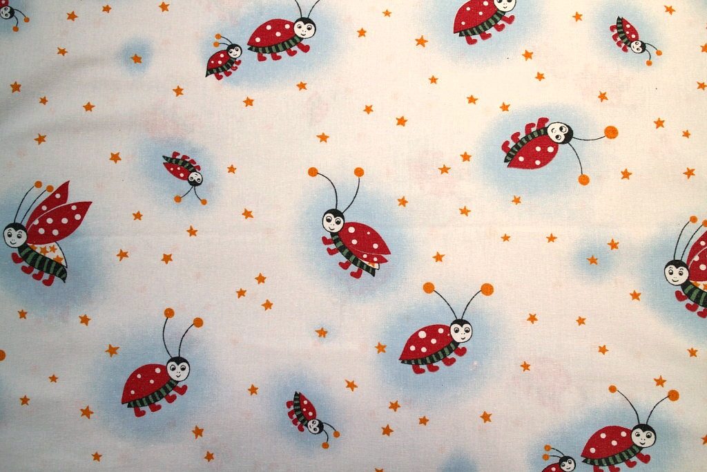 星空を舞うてんとう虫の親子が描かれたレトロなメルヘン柄ヴィンテージファブリック。