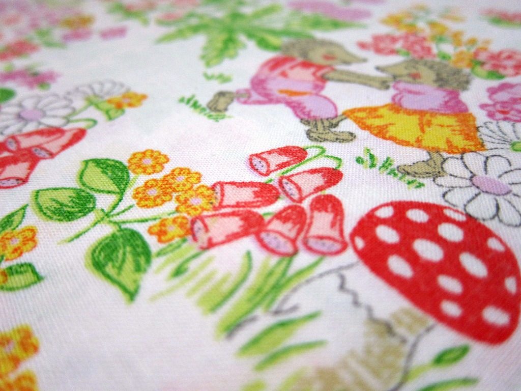 ピンクや赤、黄色など明るくてカラフルでメルヘンチックなヴィンテージ生地。