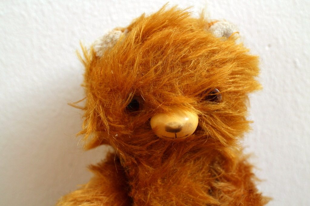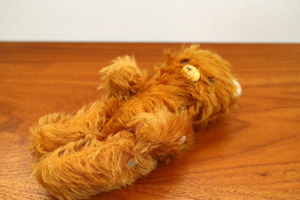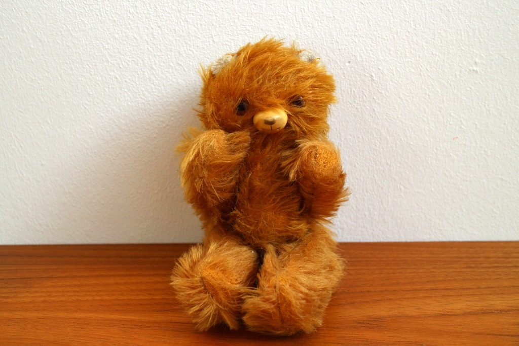 ベルリンの蚤の市で発掘した毛足が長めのヴィンテージテディベア。 アンニュイな表情が独特です。 目と鼻・口部分はプラスティックでできており手足の角度を変えることができます。