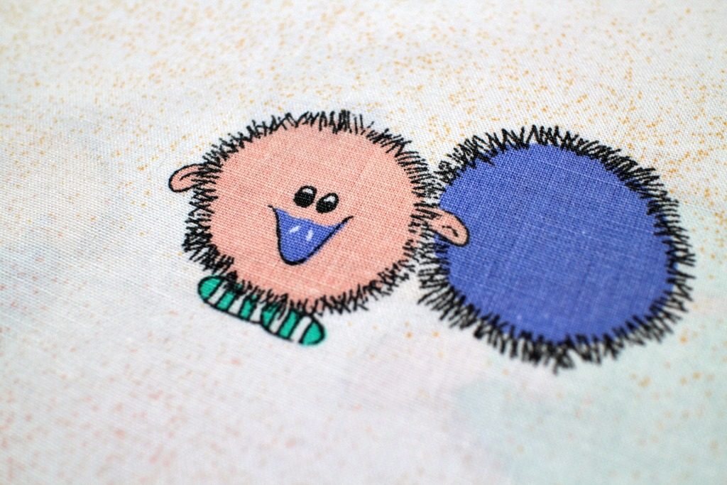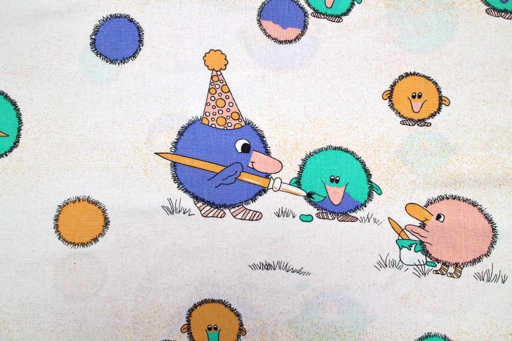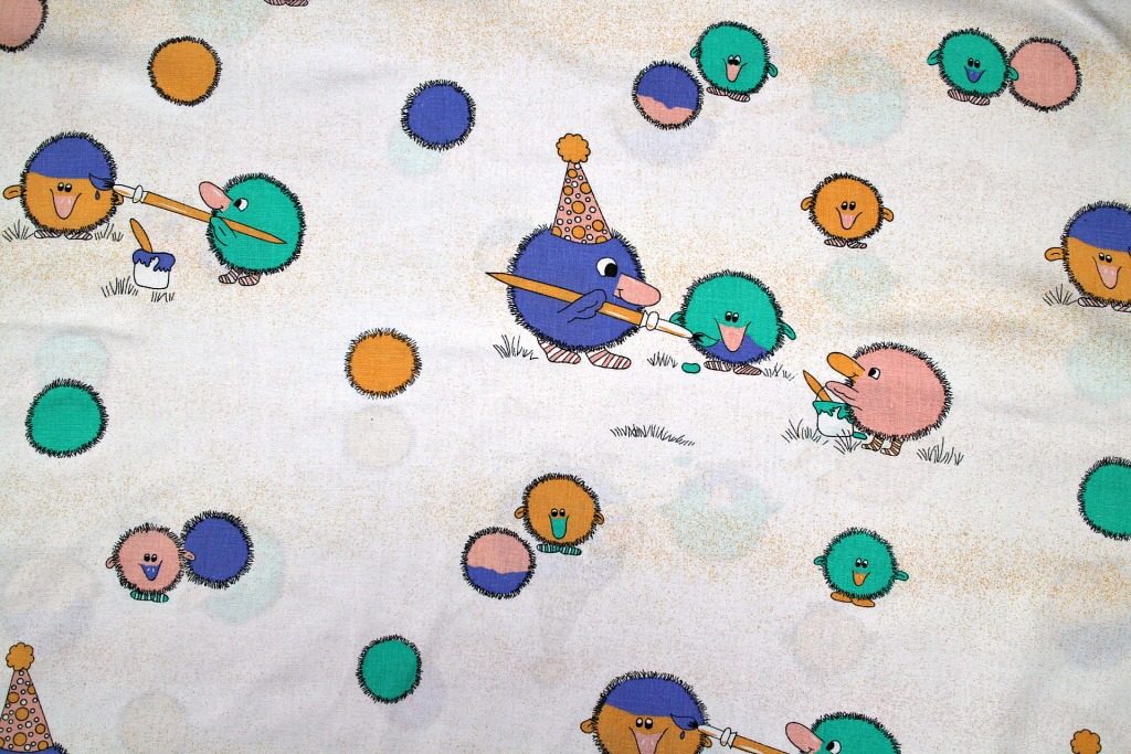 コンテンツにスキップモグラのようなマリモのような、ファニーなふさふさキャラクターが描かれたヴィンテージファブリック。互いにペイントしあう様子がキュート。