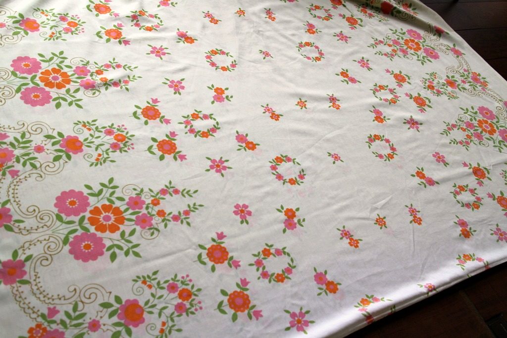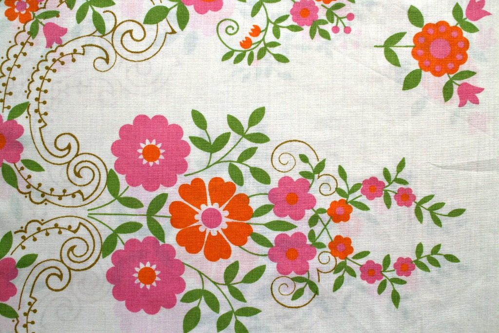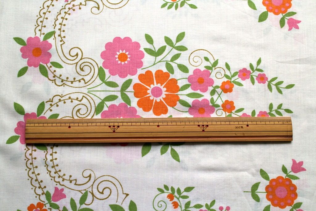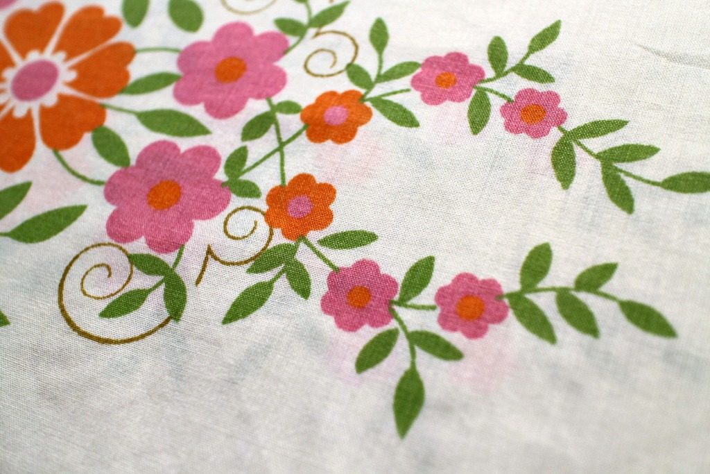 コンテンツにスキップやや軽めのフォークロア調に描かれたピンクとオレンジの花模様がレトロなヴィンテージファブリック。