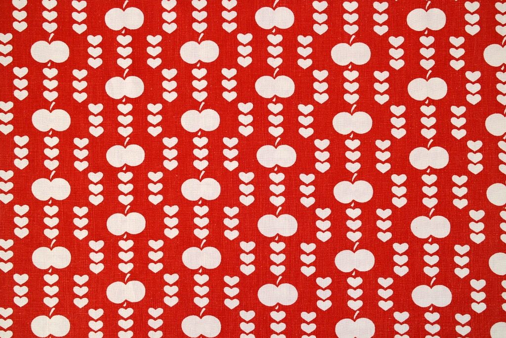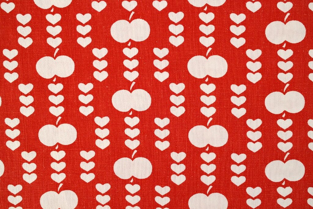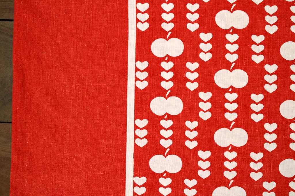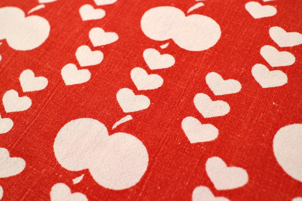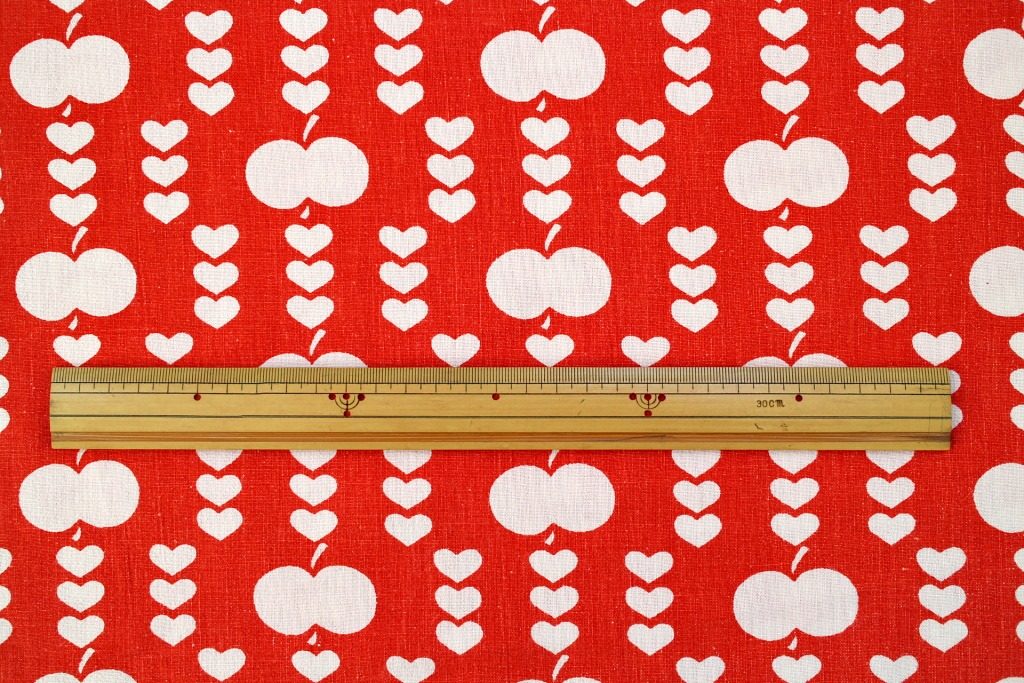 コロンとしたリンゴが小さなハートで連ねられた、キュートさ満点のヴィンテージファブリック。真っ赤な生地に整然と並んだ白抜きモチーフがスウィート。