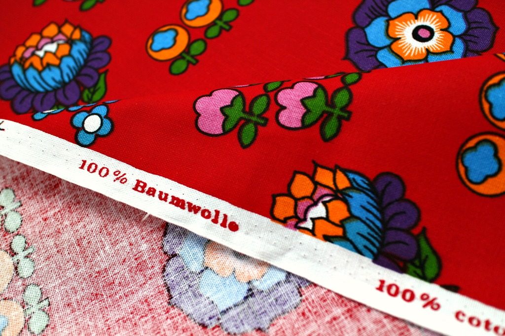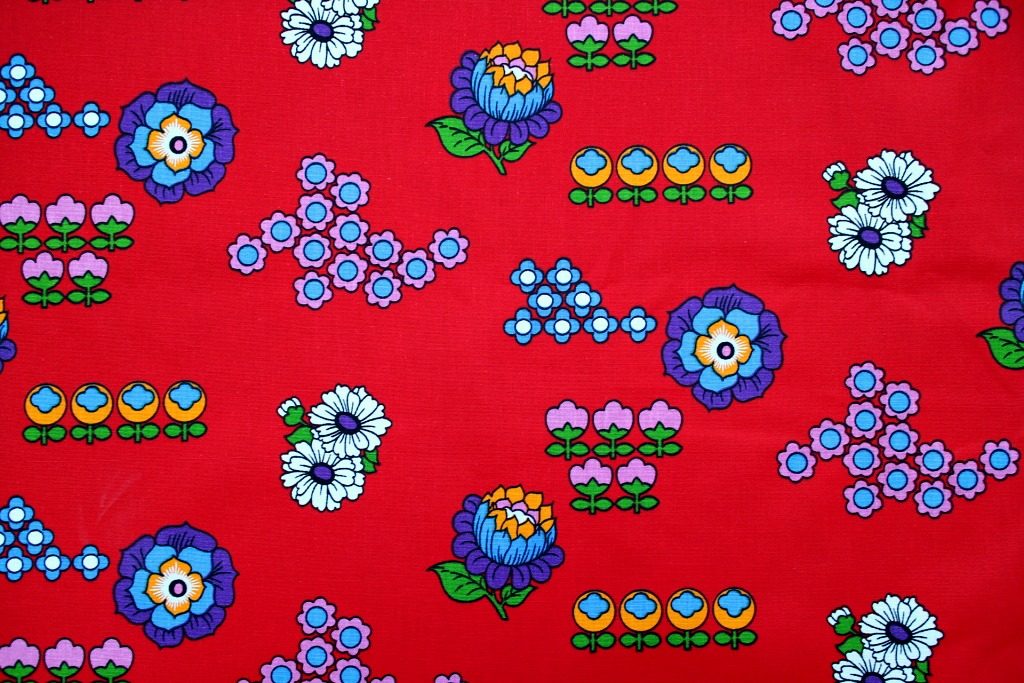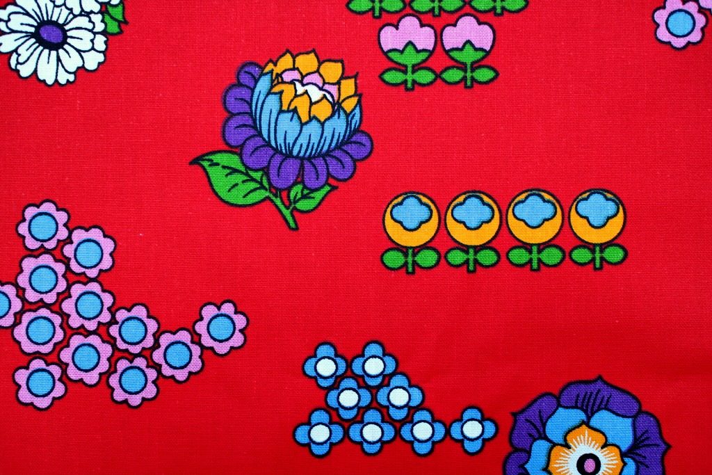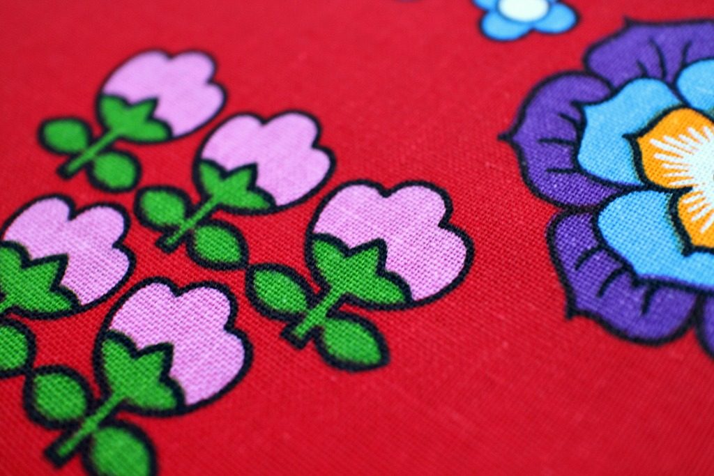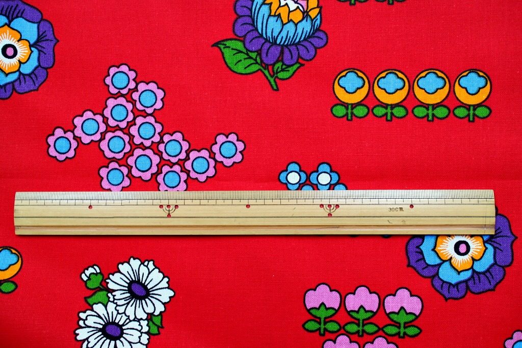 コンテンツにスキップ旧共産圏らしい赤色をバックに様々な花モチーフがランダムに並んだユニークなヴィンテージファブリック。