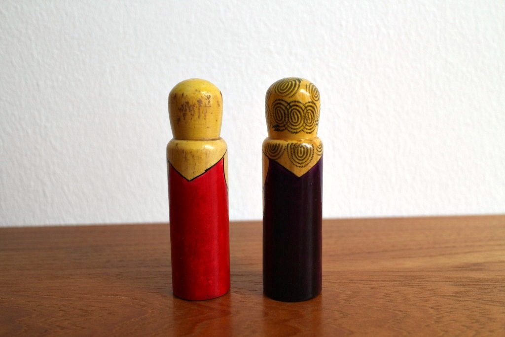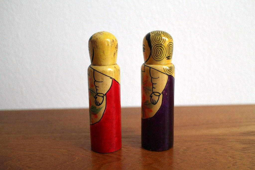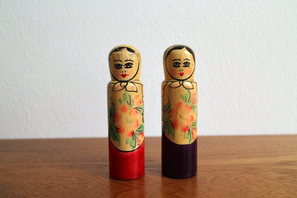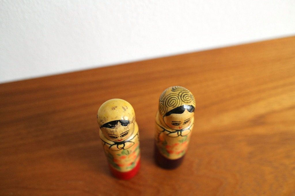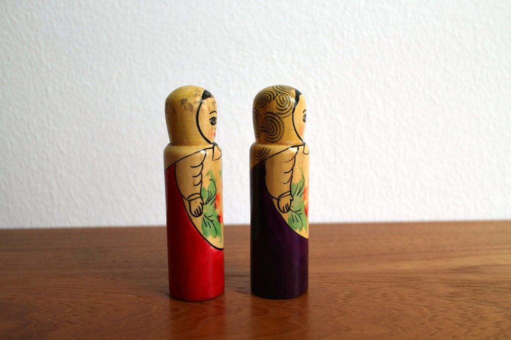 ベルリンの蚤の市で見つけた珍しいロシア人形2体セット。 ロシアの伝統人形と言えば入れ子人形のマトリョーシカが有名ですが、こちらは非常にレアなこけしタイプ。 赤&紫と、それぞれ民族衣装をまとっていますよ。 東欧インテリアのアクセントにどうぞ。