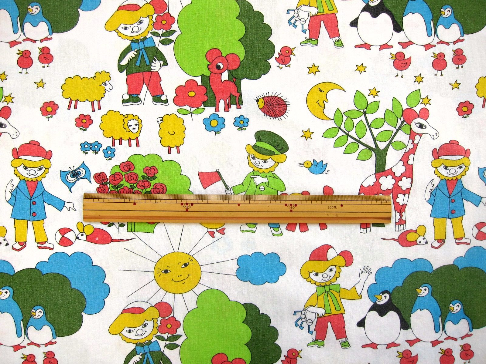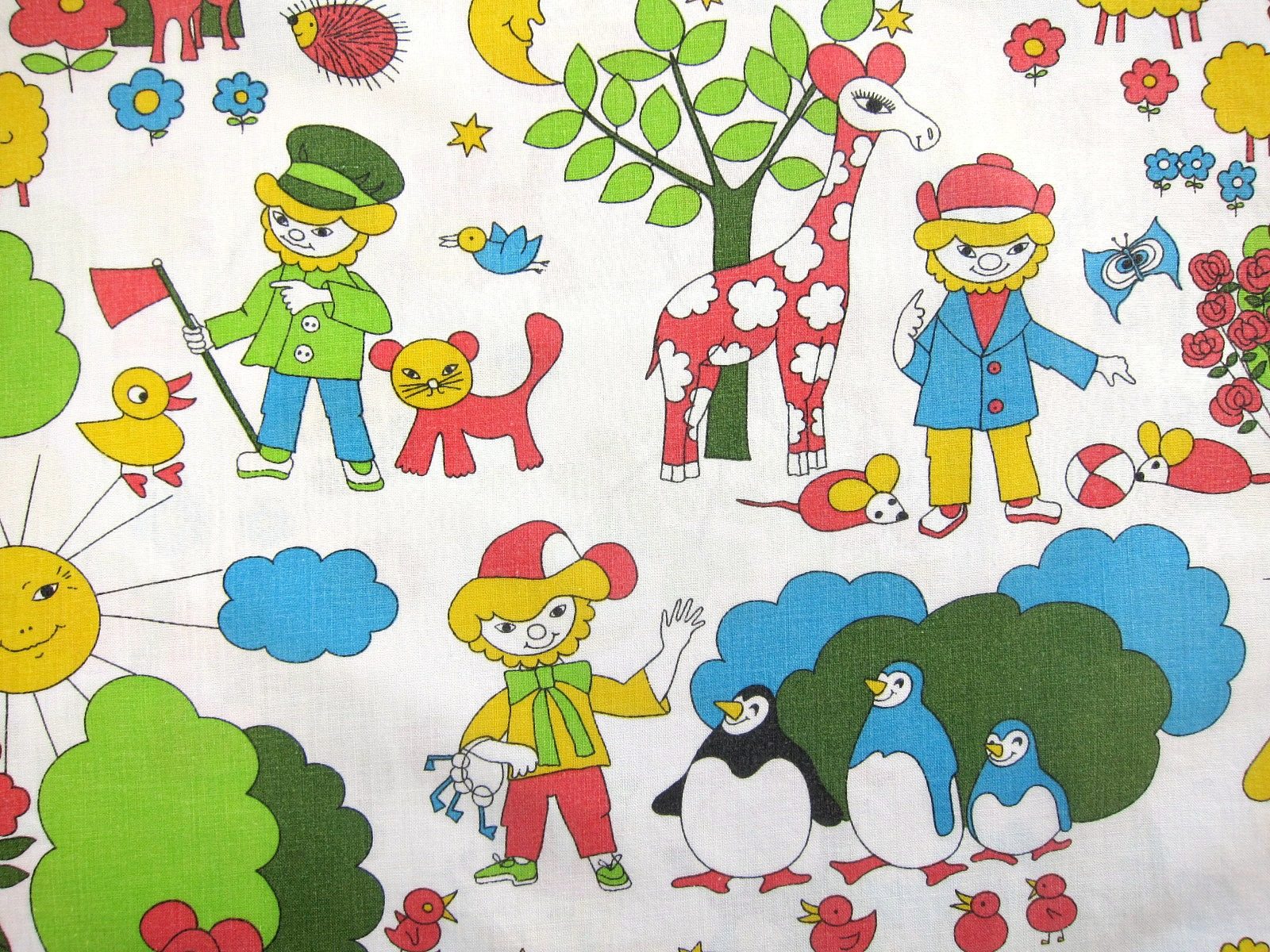 ペンギンやキリンなどカラフルに描かれたドイツの子ども柄ヴィンテージファブリックです。