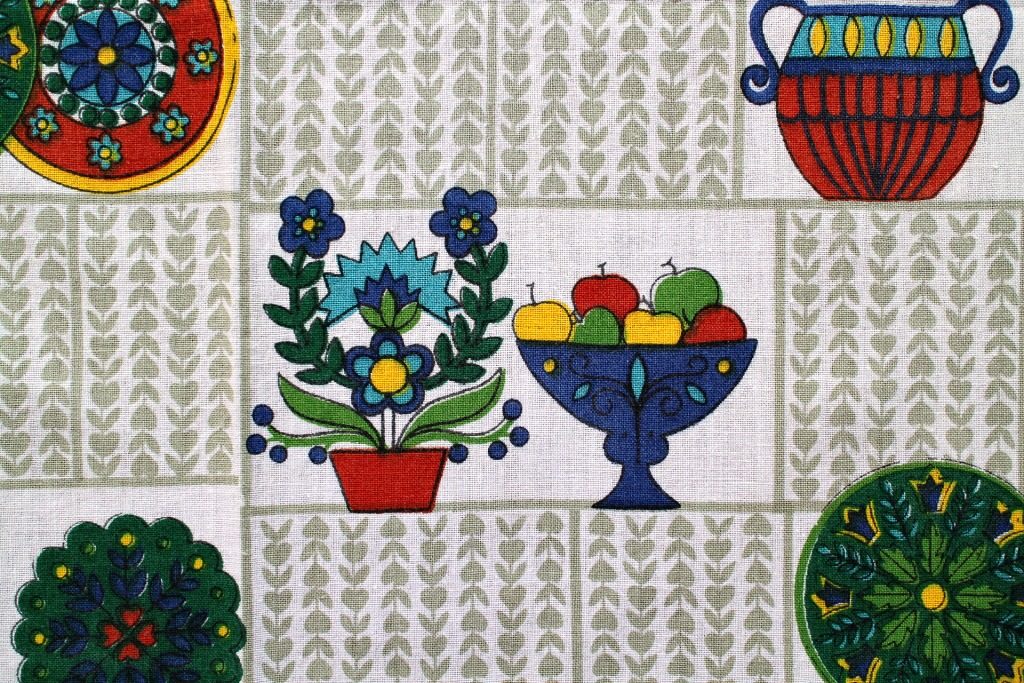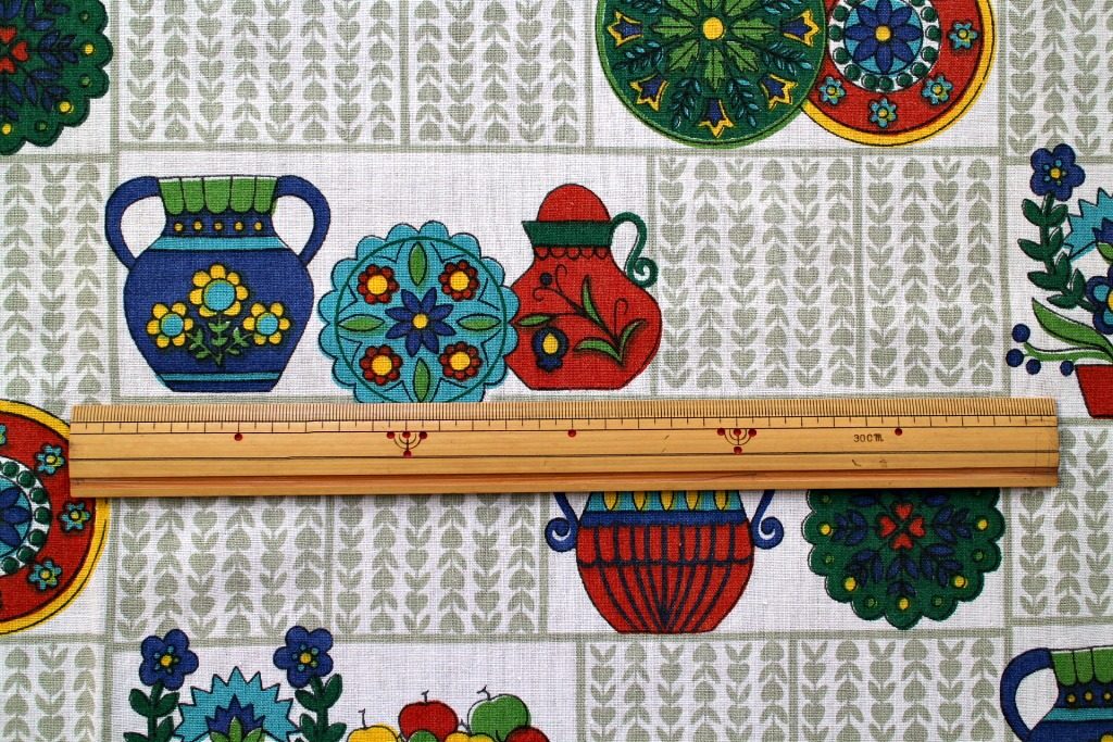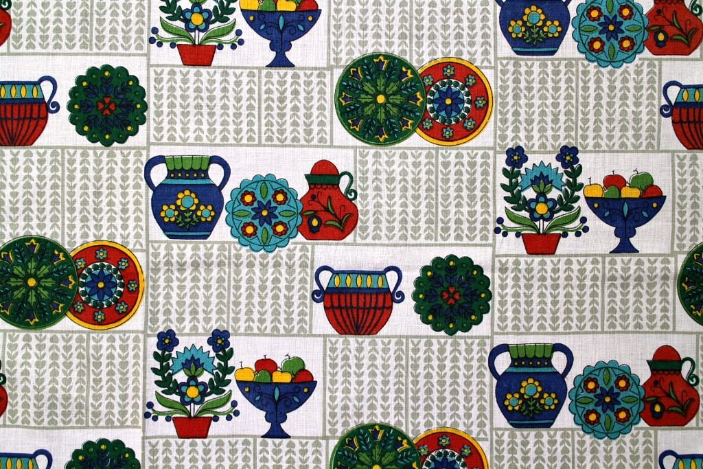 コンテンツにスキップジャグや絵皿などアンティークな雑貨が並んだ変形格子柄ヴィンテージファブリック。