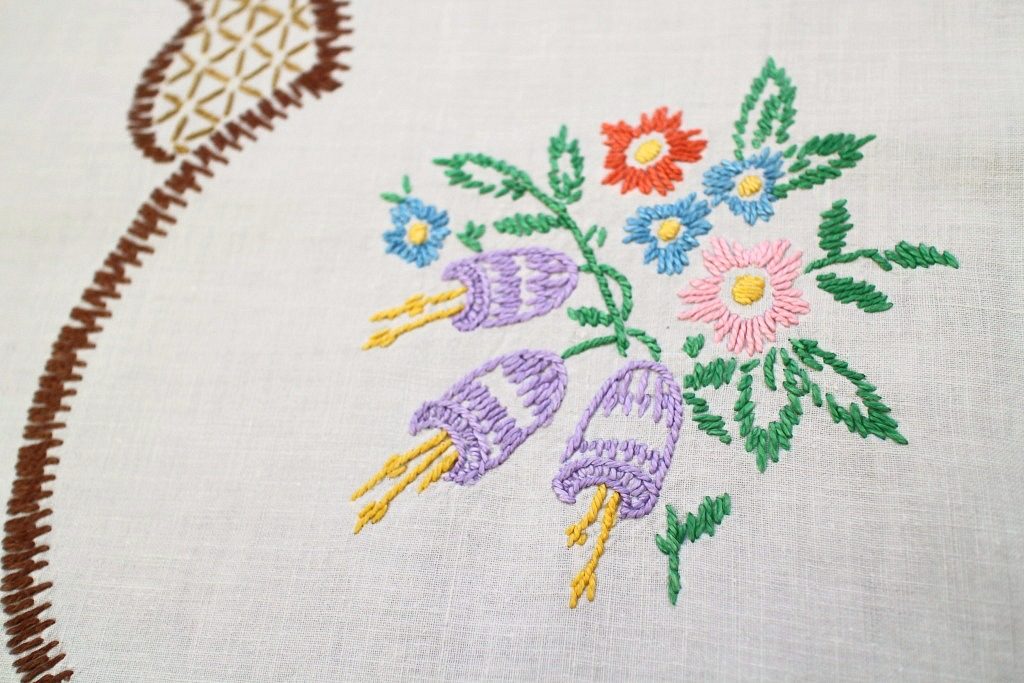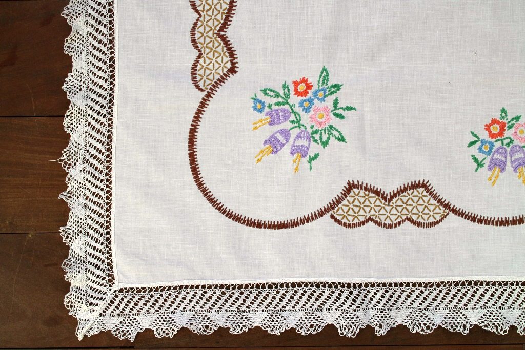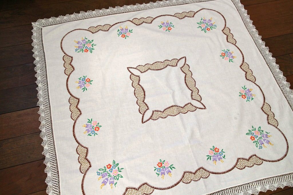 ピンクや薄紫色の小花模様がおしとやかなヴィンテージテーブルクロス。 茶色いラインステッチがほっこり優しい印象をプラス。 ぬくもりいっぱいのハンドメイド刺繍とレースが合わさった美しい作品となっています。 ちょっとした目隠し布にもちょうどよいサイズ。
