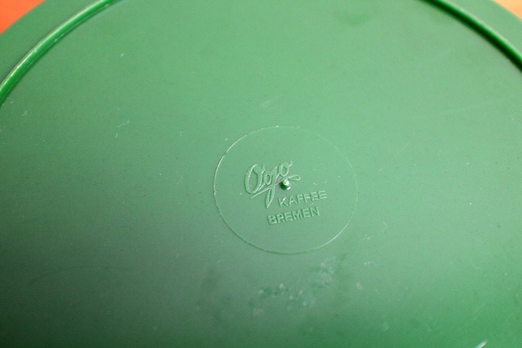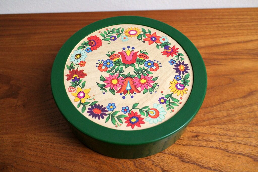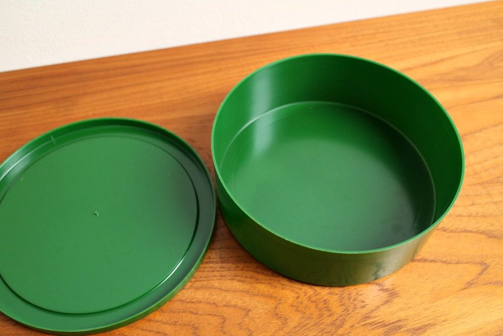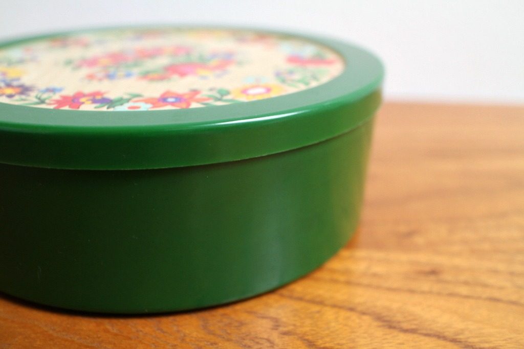 音楽隊で有名なブレーメンのカフェ・ショップで販売されていたと思われるシックなグリーンにカラフルなレトロフラワーがプリントされた、プラスティック製丸型ボックス。