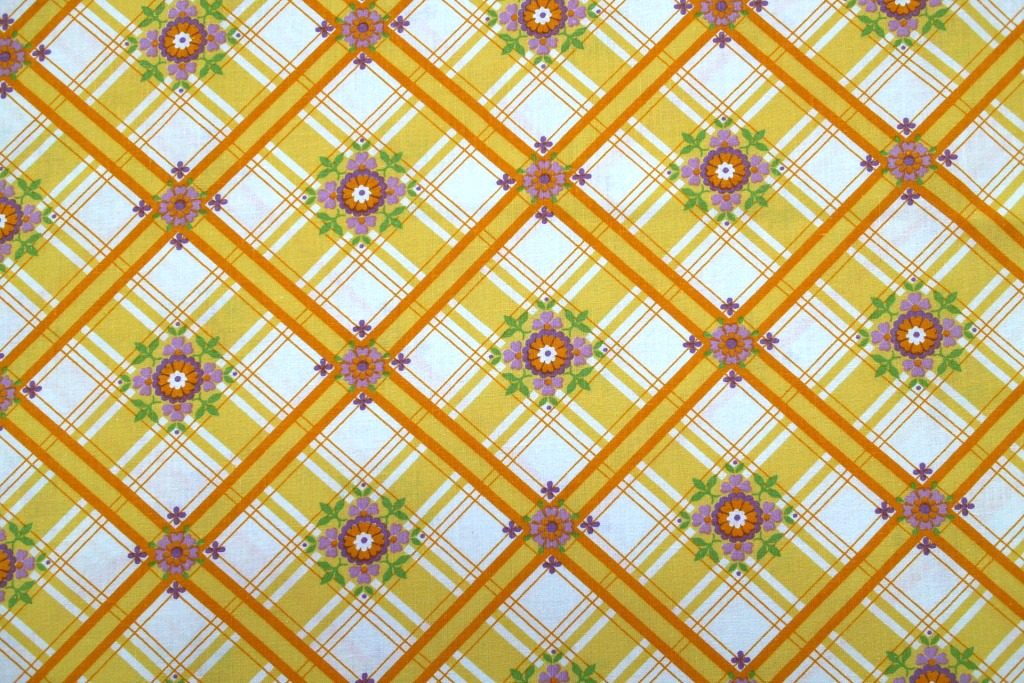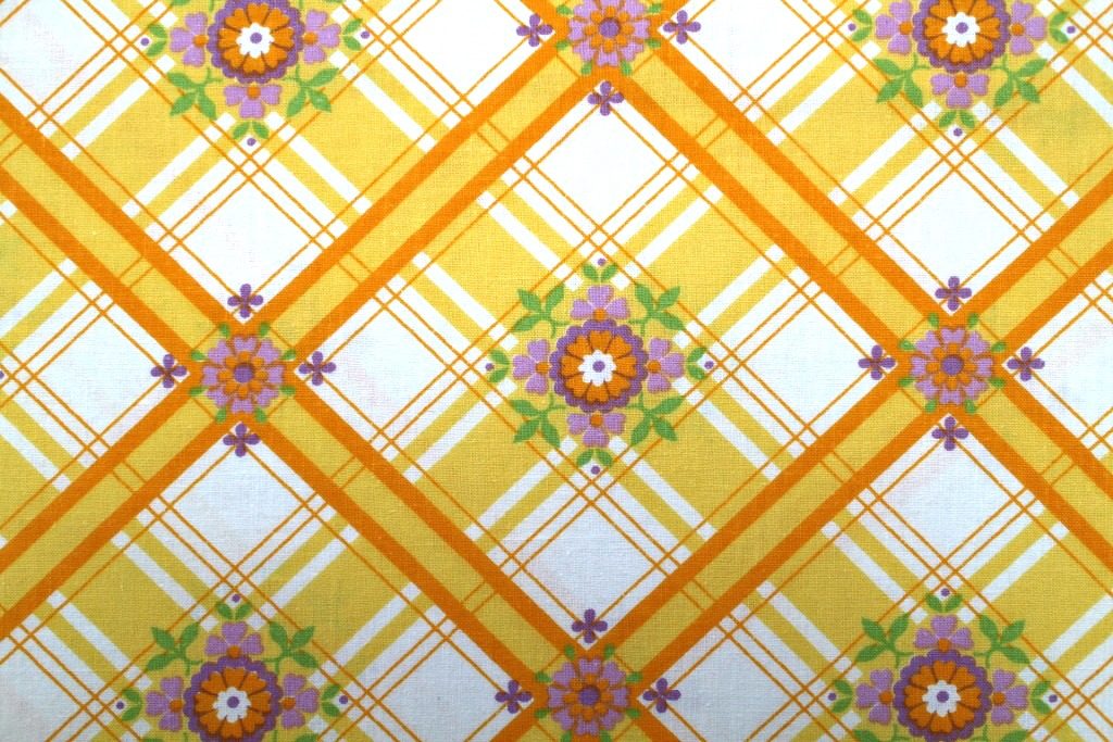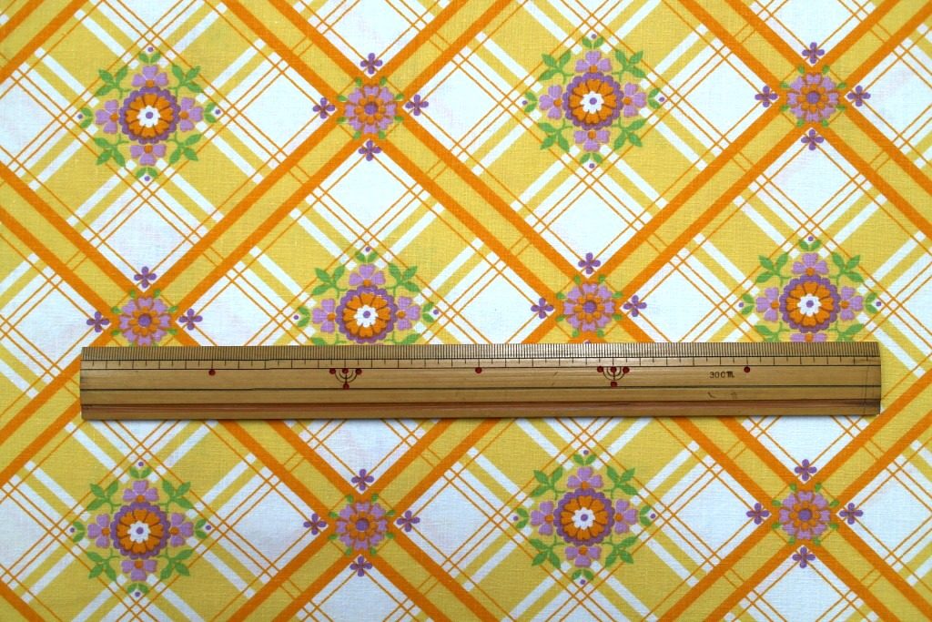 コンテンツにスキップ優しいイエロー系カラーの格子が二重に重なったレトロなお花モチーフのヴィンテージファブリック。