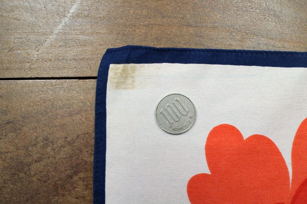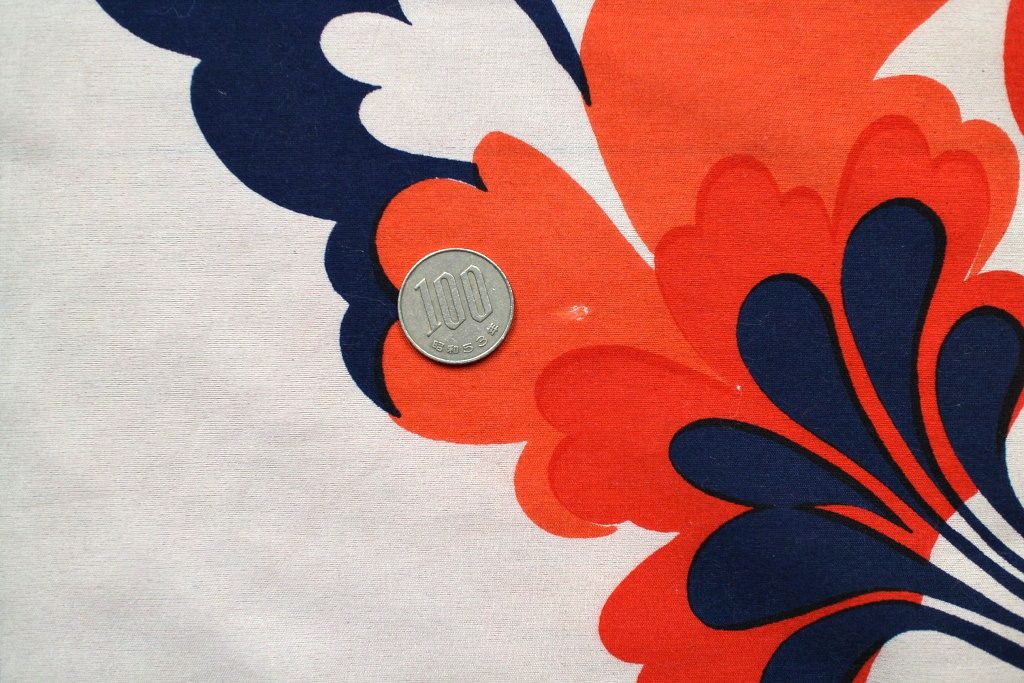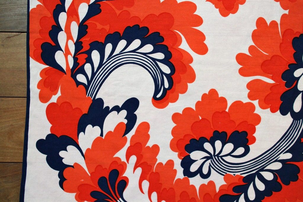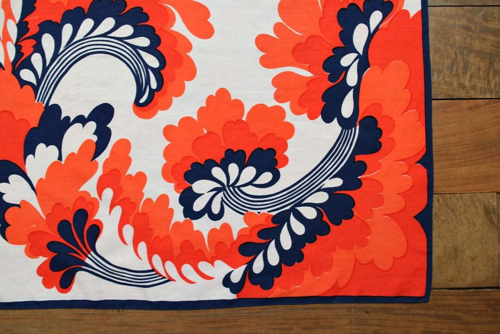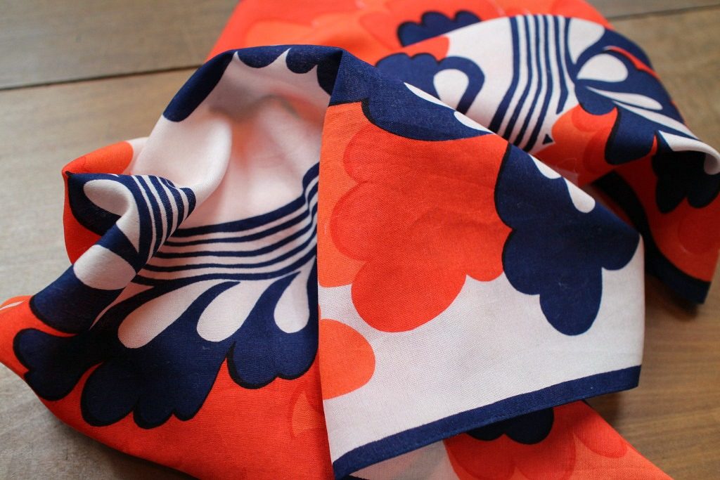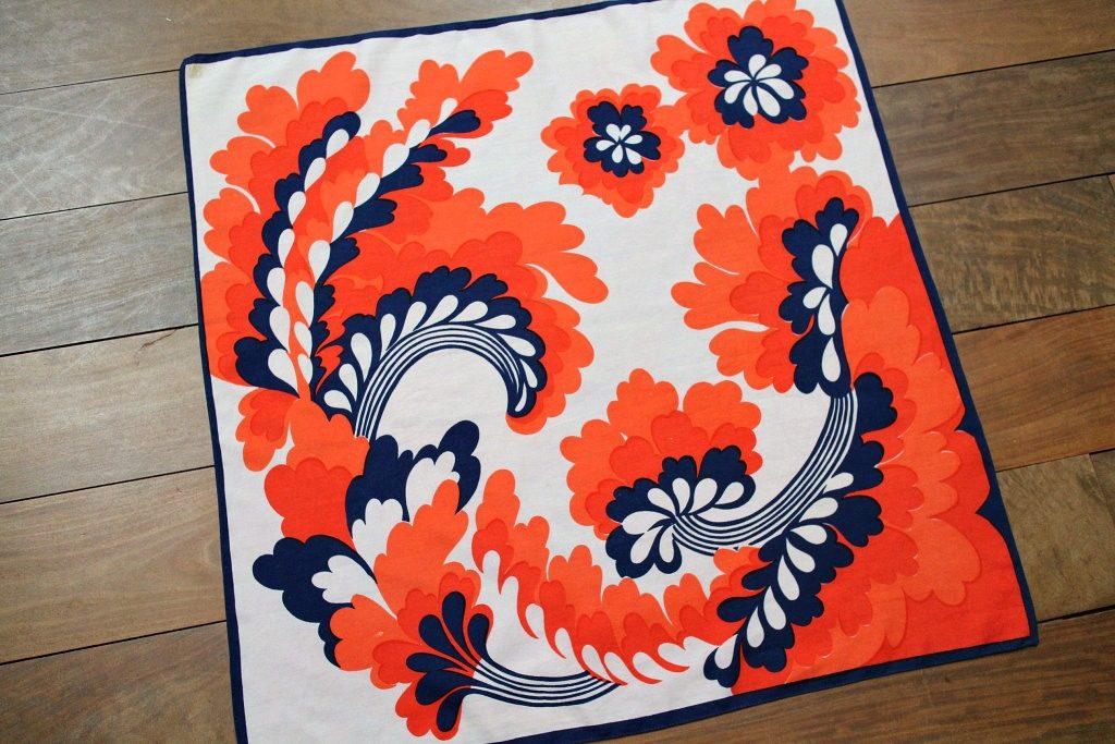 60-70年代ファッションに欠かせないとっておきスカーフを蚤の市で見つけました。 ネイビーがアクセントとなった華やかな赤〜オレンジ色の花モチーフ入りで気分が一気に上昇! レトロな装いのキーアイテムです。