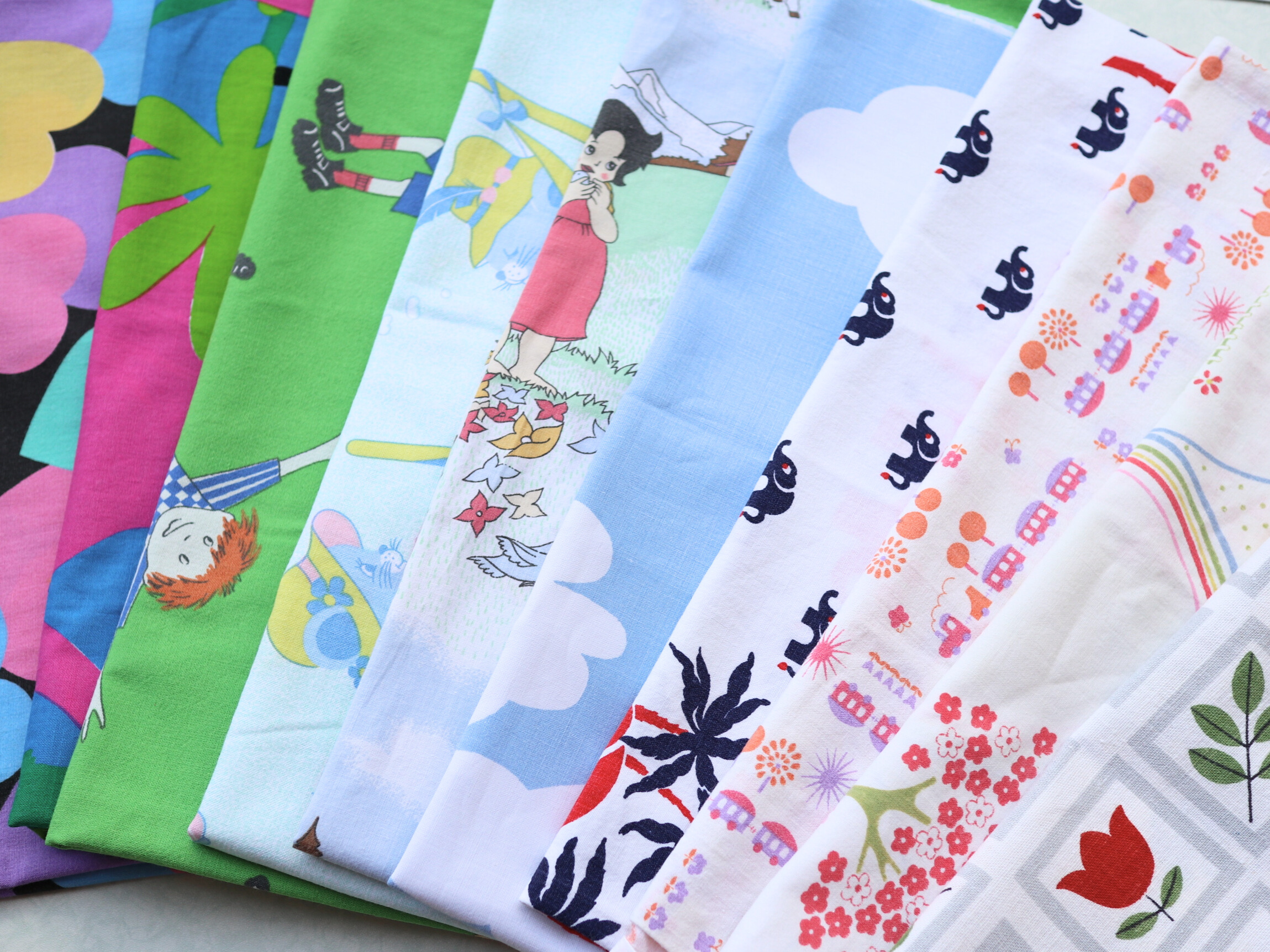 ヴィンテージの子供柄・果物柄を集めた、カラフルなはぎれセットです。