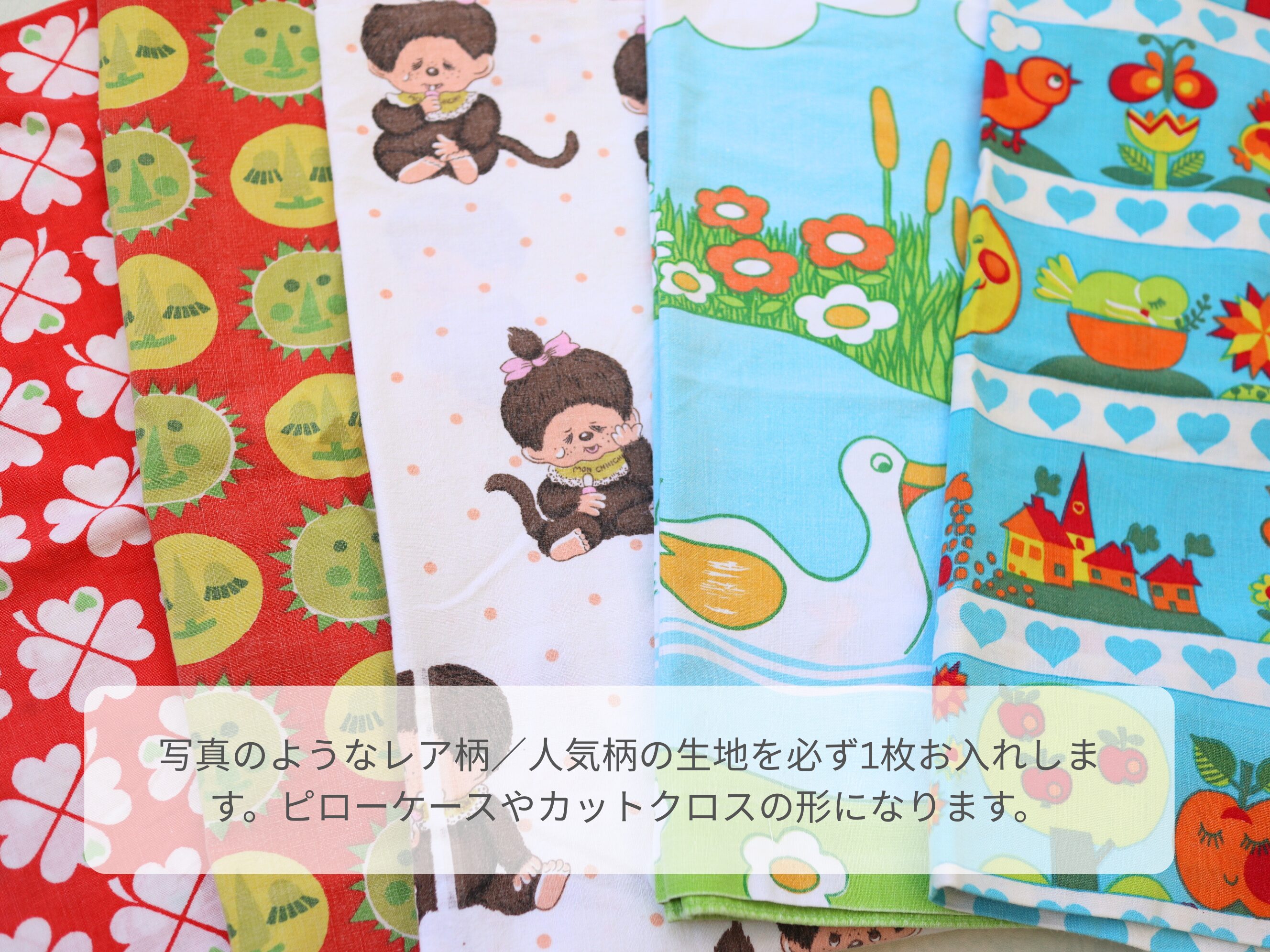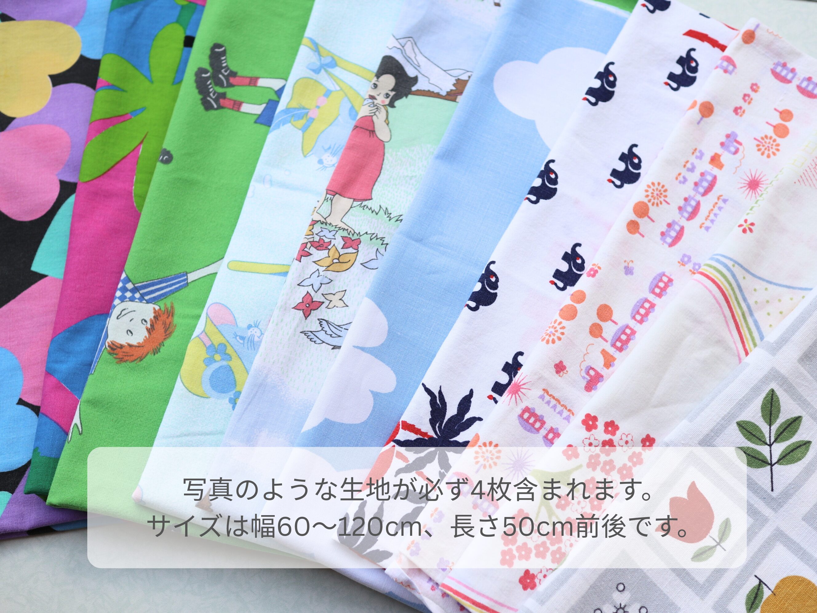 写真に写っている生地は一例で、写真に掲載していない柄の生地も入っています。