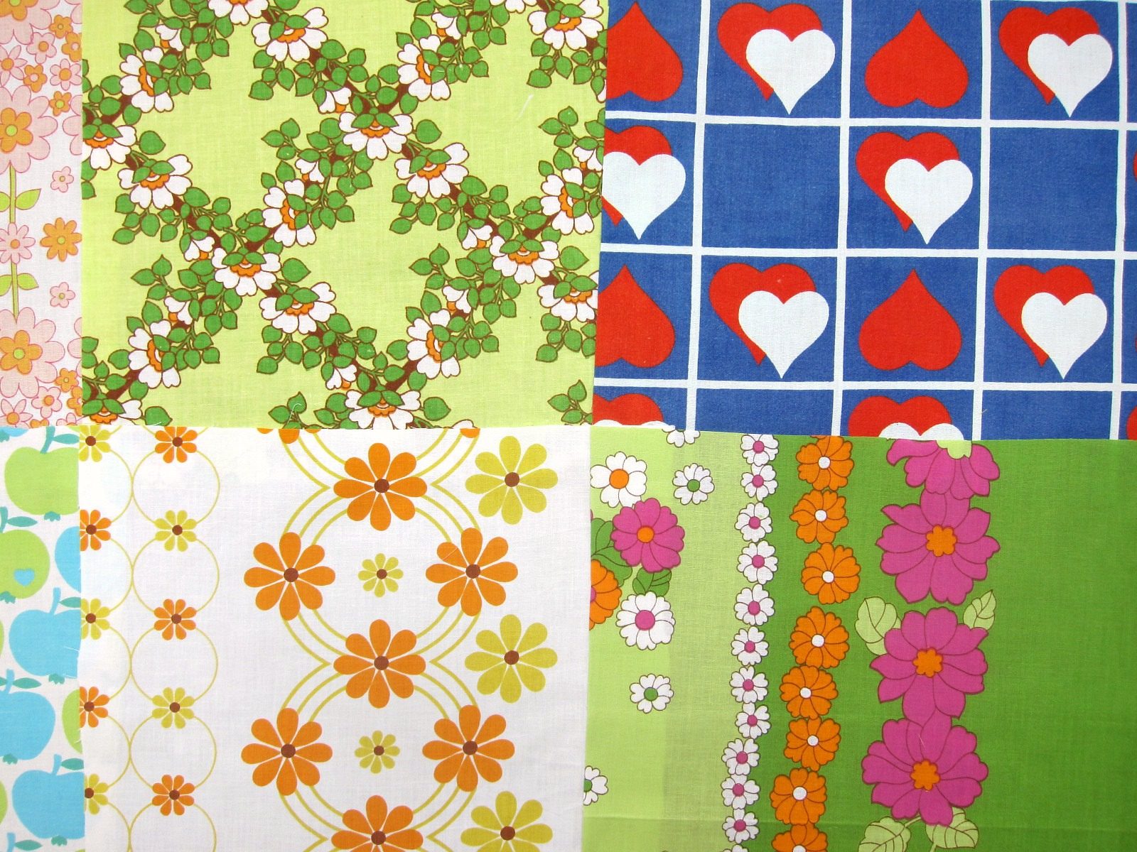 花柄、ハートマーク、グラジエラのりんごモチーフ、雲柄など、レトロでかわいいパターンのヴィンテージファブリックはぎれを12枚セットにしました。