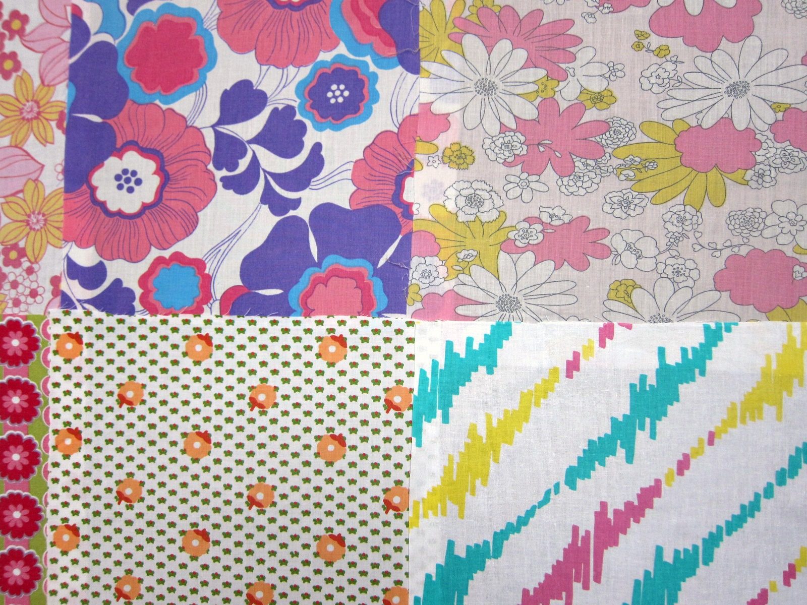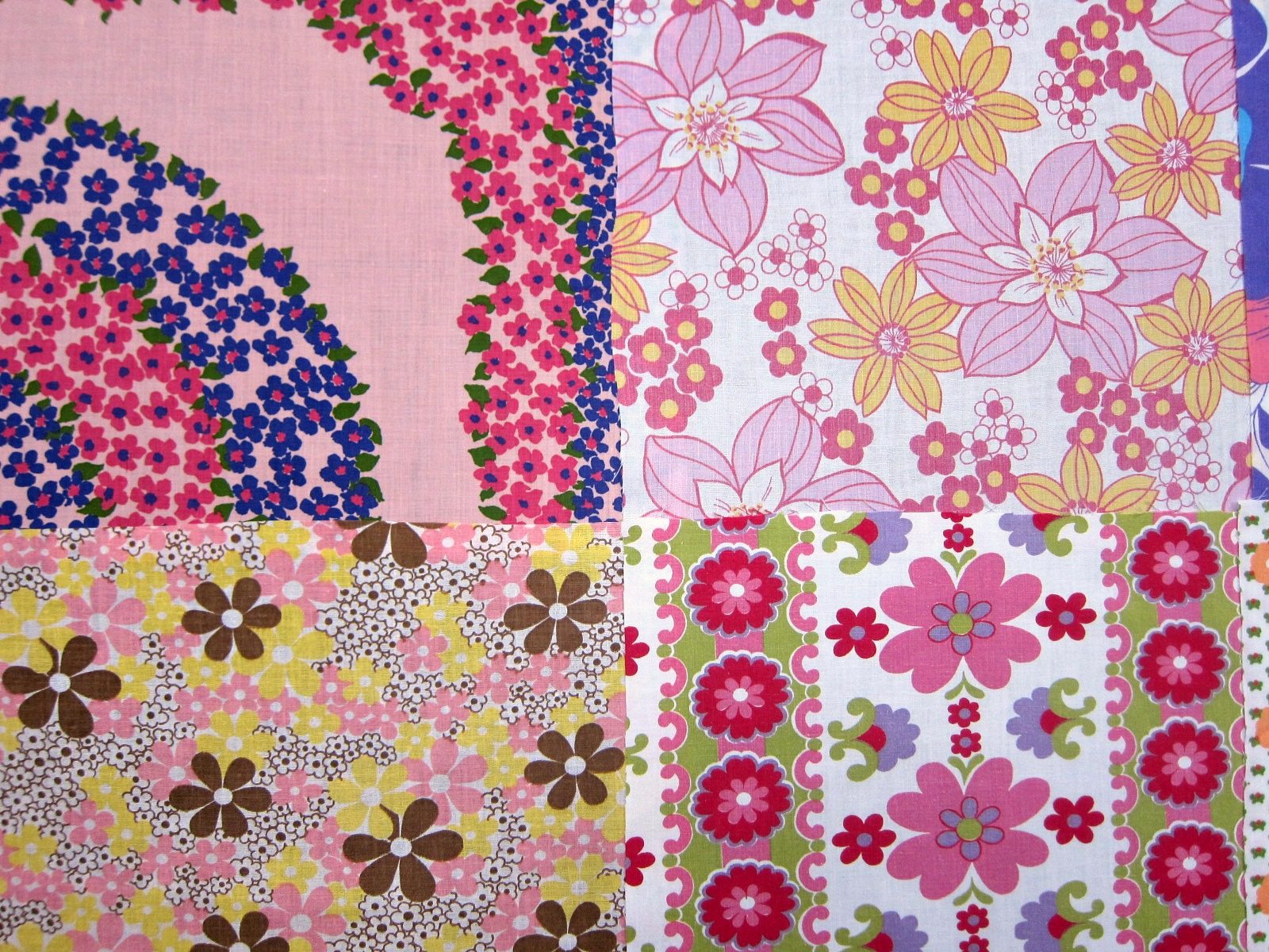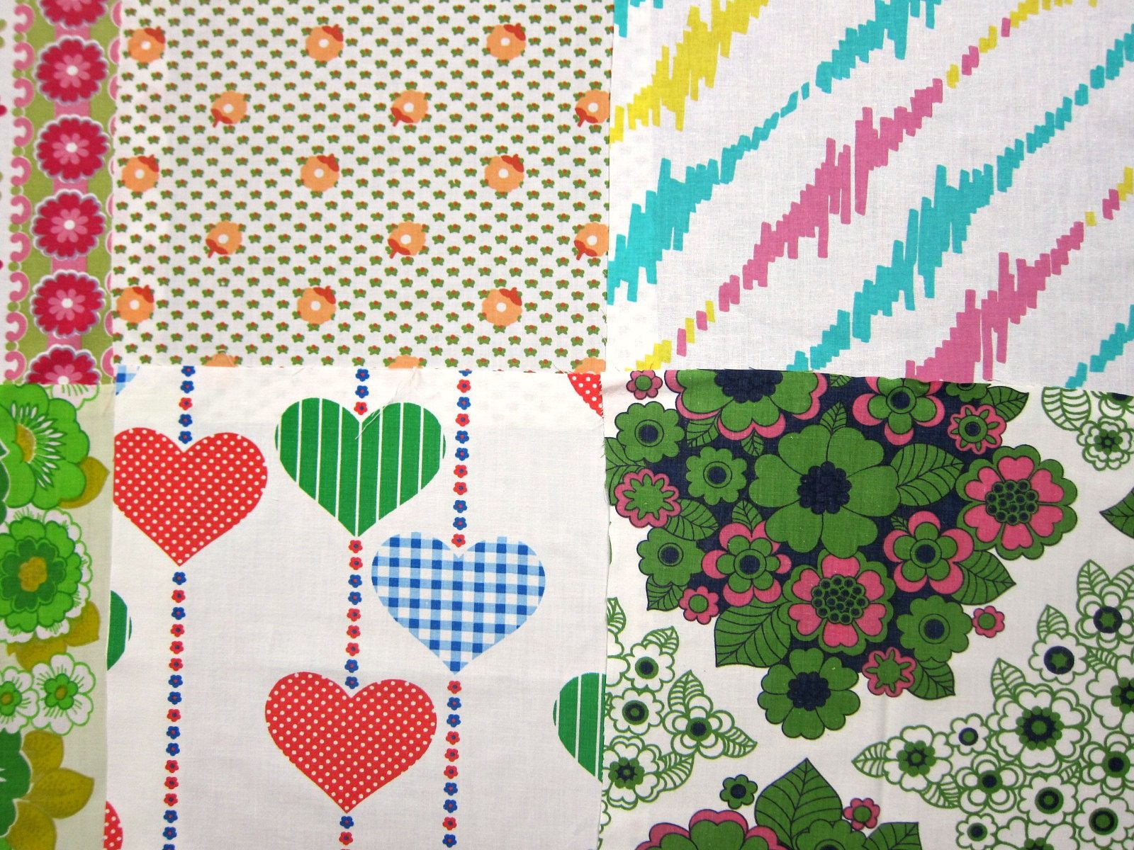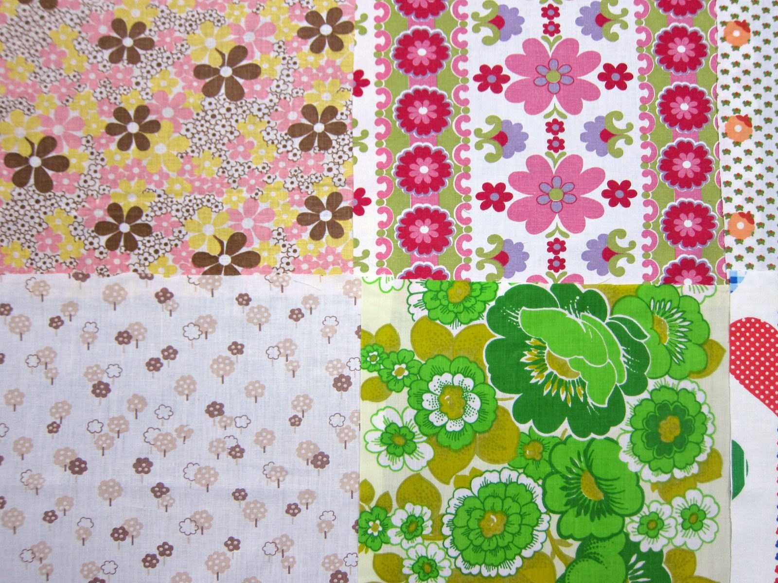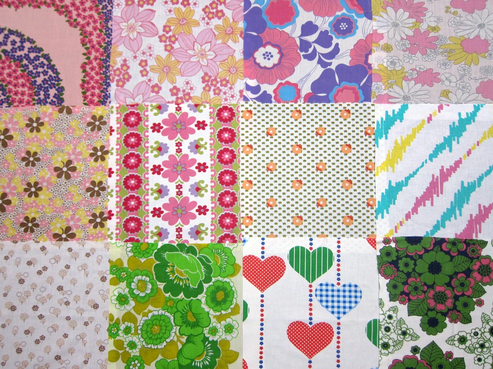 ピンクや緑色に、70年代のヴィンテージファブリックのはぎれを12枚セットにしました。