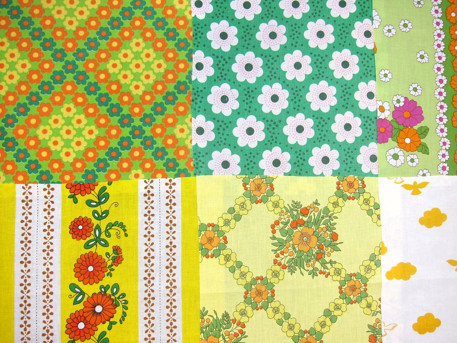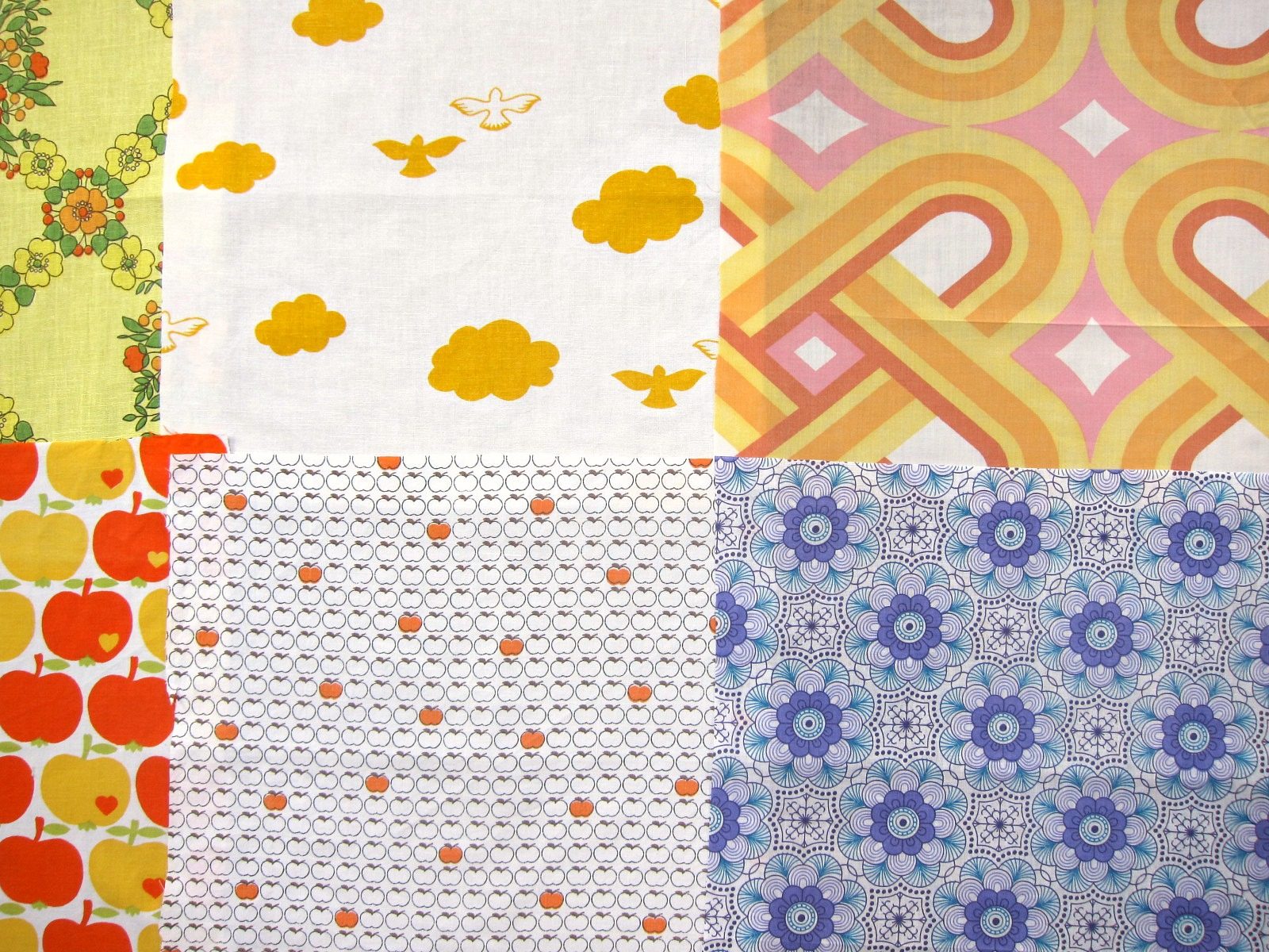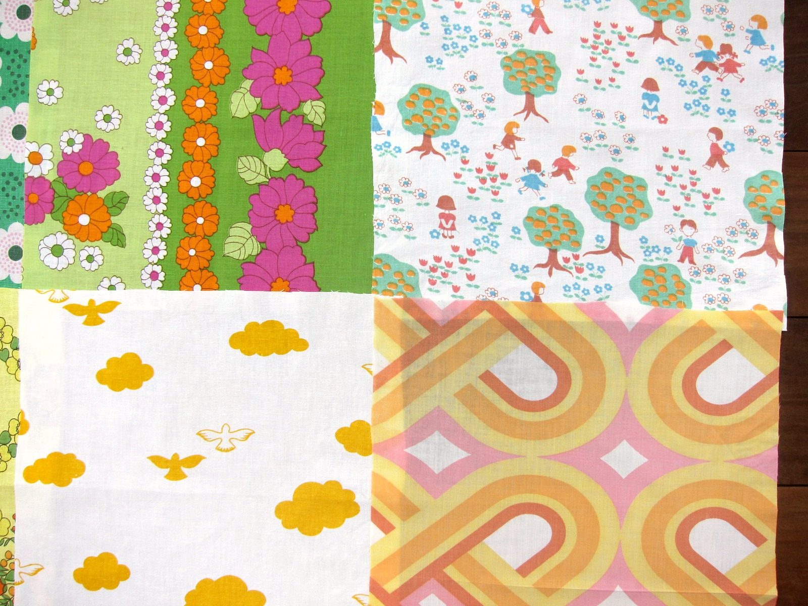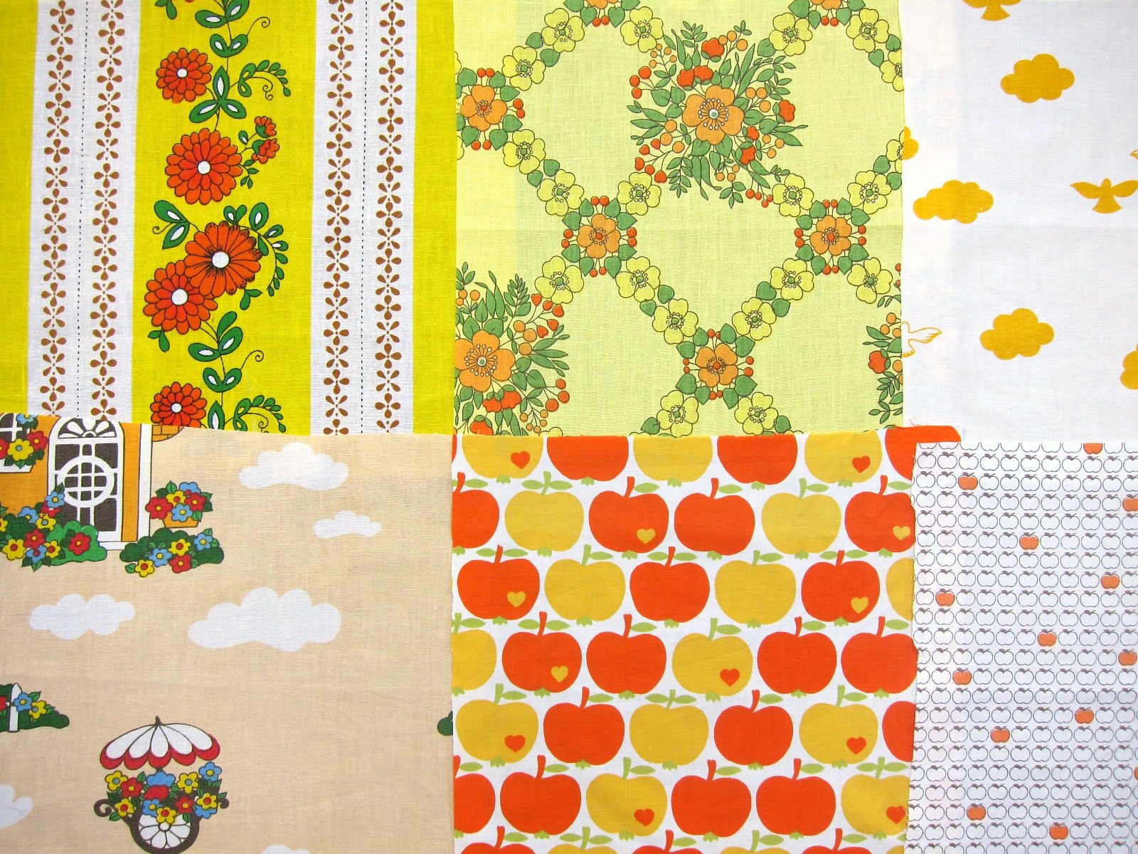 グラジエラのりんご柄、レトロな花柄パターン、かわいい子ども柄などが入った、70年代のヴィンテージファブリックはぎれセット。